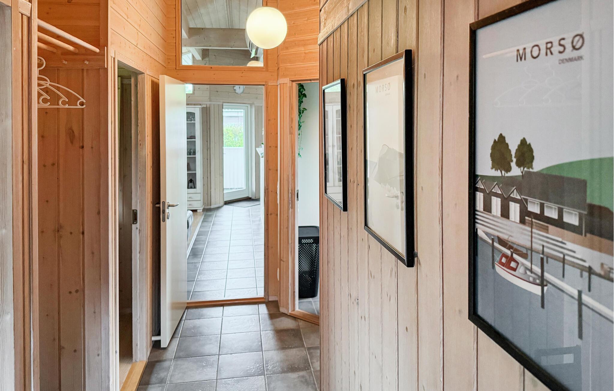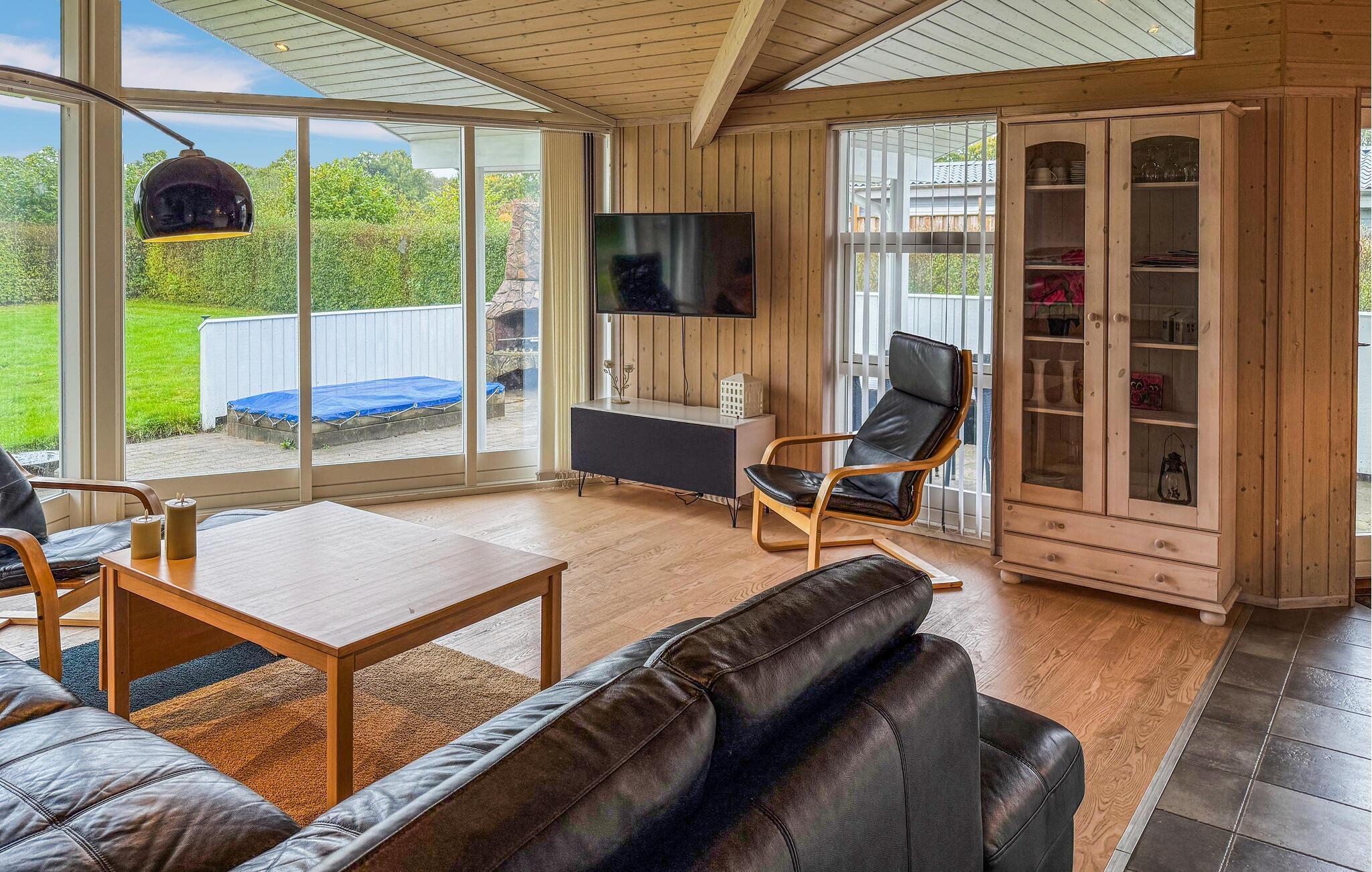 Glæd jer til en afslappet ferie i dette komfortable feriehus, der giver jer masser af plads til ro og fælles stunder. Træd indenfor, og mærk den venlige stemning i den åbne opholdsstue. Træbeklædte vægge og smagfulde detaljer skaber en varm atmosfære. De store panoramavinduer lukker masser af lys ind og giver en smuk udsigt til haven. Hyg jer i sofaen, læs en bog, eller se en film sammen. Det lyse køkken går harmonisk over i spiseområdet, så madlavning og måltider bliver en hyggelig fælles oplevelse.
