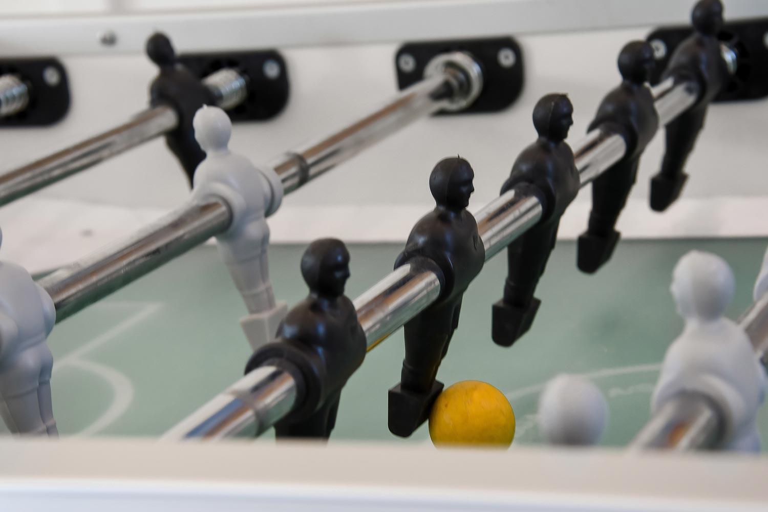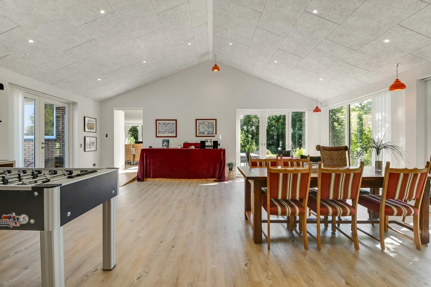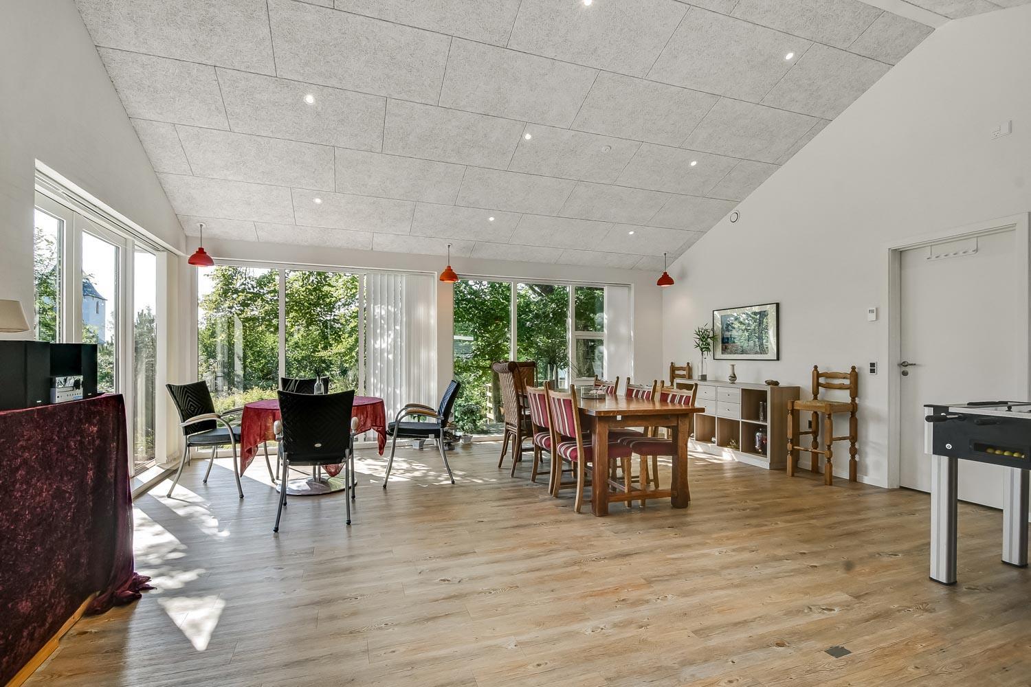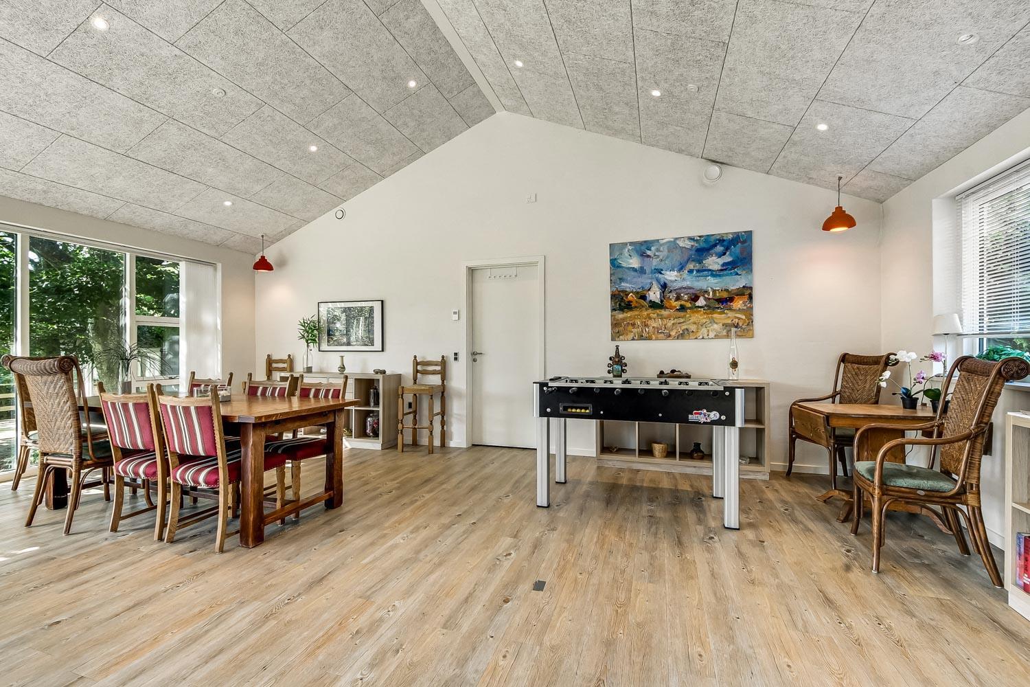 De 2 afdeling bindes sammen af et fantastisk, lyst og venligt opholdsrum det også var en del af tilbygningen fra 2019. Her findes der ekstra borde med kurvestole, bordfodbold og dart. Et unikt samlingspunkt for hele familien med mulighed for sjov og leg.