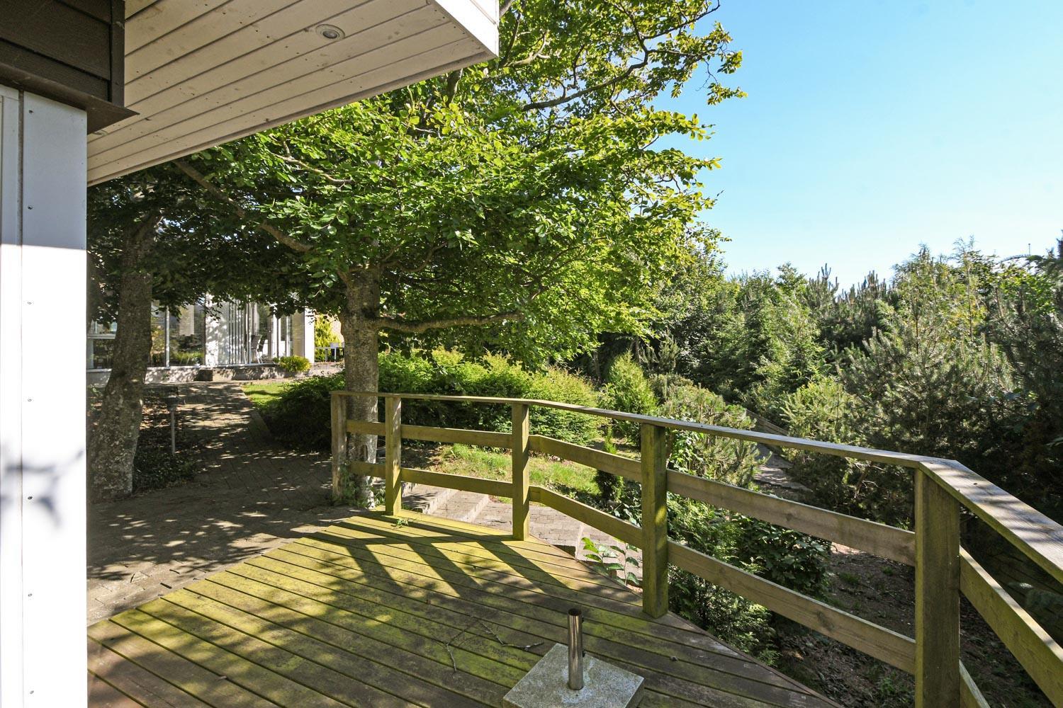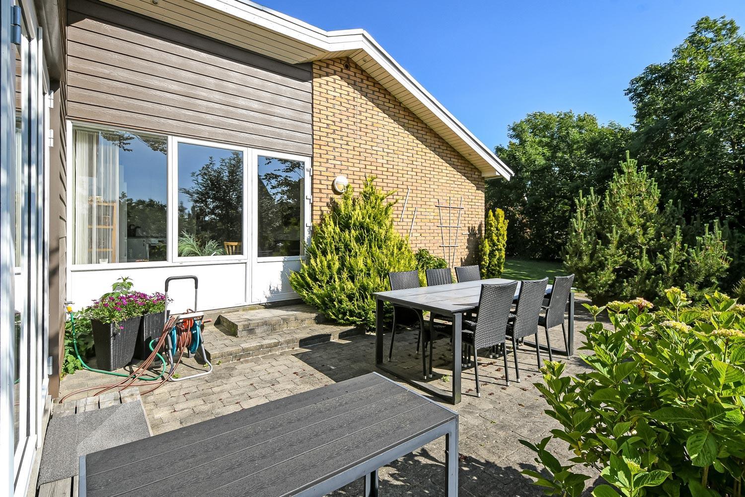 Den 2.150 m2 store grund et kapitel for sig. En dejlig lukket solgård med udsigt over landskabet byder jer velkommen. Der er altid læ og der er havemøbler og gasgrill. Der er også en højtbeliggende terrasse med havemøbler og udsigt over landskabet og til den hyggelige landbykirke. På grunden er der lavet et stenbelagt niveauleret stisystem så en køresolsbruges kan kommen rundt på grunden ved egen hjælp. Der masser af læ grundet og den frodige beplantning som er nået den helt rette, ugeneret højde. Landsbyen Hove er en mindre landsby, men en aftentur under gadelygterne er altid hyggeligt og såvel Vesterhavet som den hyggelige handelsby Lemvig nås på 10 minutter i bil. Indenfor 30 minutter nås flere mange aktiviteter, restauranter, mulighed for shopping samt altid dejlige Thyborøn.