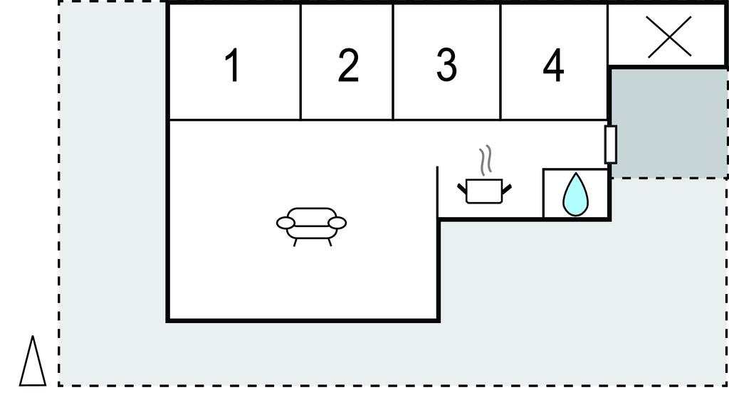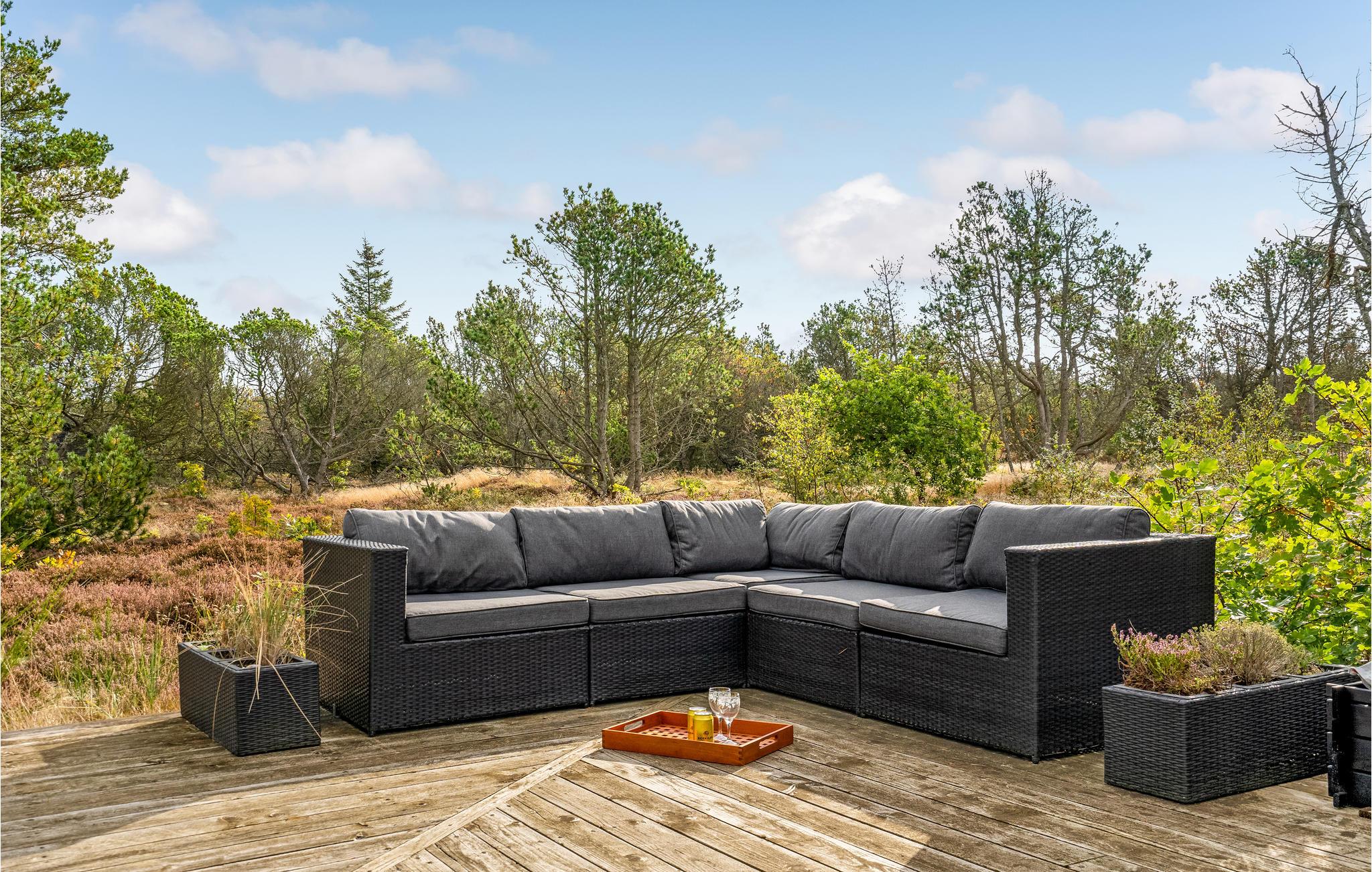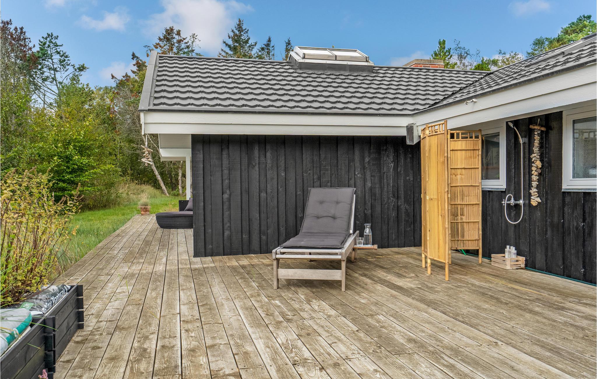 På den store terrasse, som omkranser næsten hele huset, kan I nyde solen på alle tider af dagen. Der er havemøbler af høj kvalitet, som I kan slappe af på. Mens jeres børn har det sjovt på trampolinen, kan de voksne læse en god bog i hængekøjen. I kan også vaske sandet af i den udendørs bruser efter et besøg på den nærliggende strand.