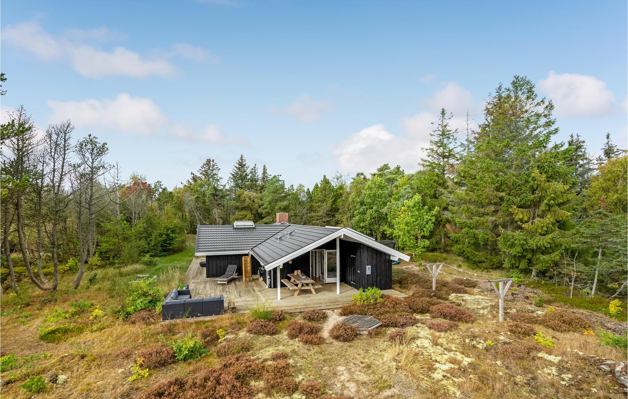 Hyggeligt sommerhus i Hulsig Strand med stor terrasse, trampolin og tæt på stranden.