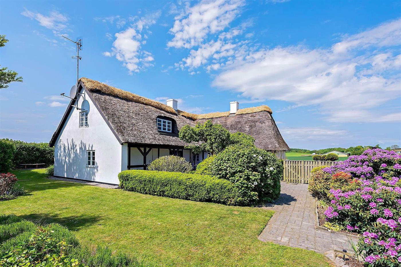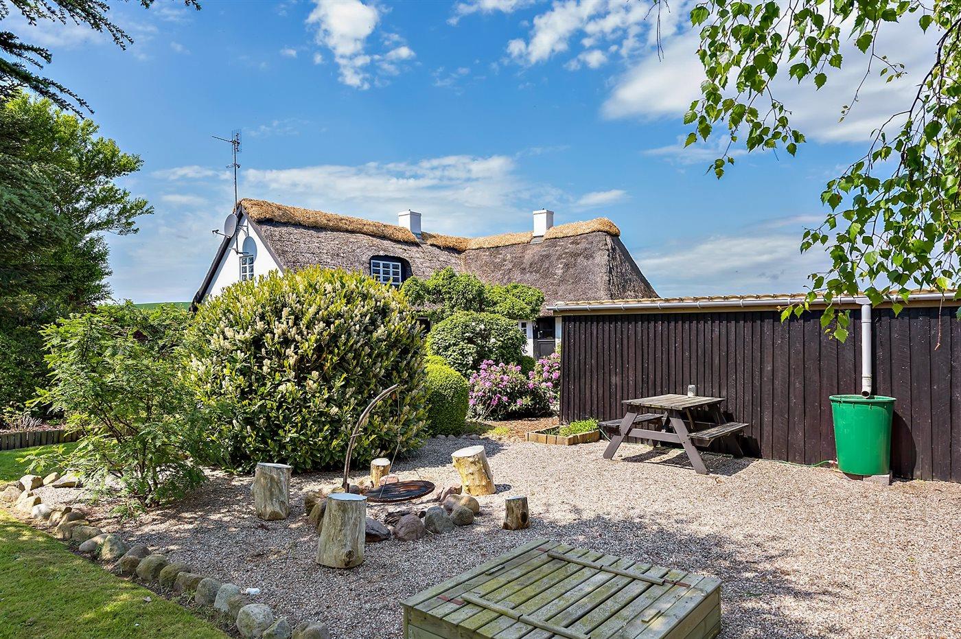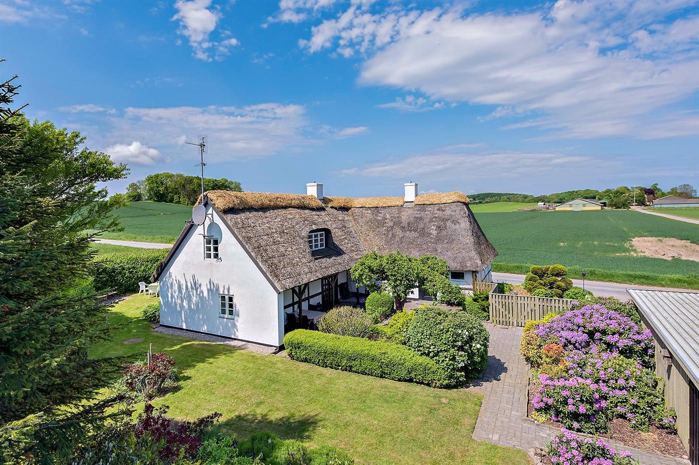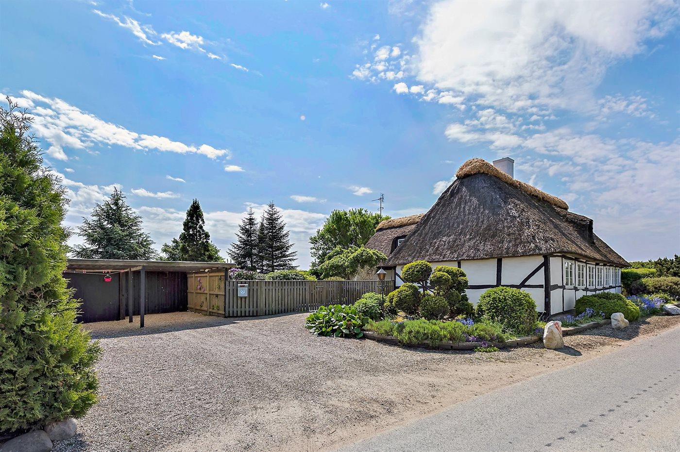 Bindingsværkshus med stråtag beliggende på landet. Til huset hører en dejlig havegrund med havepavillon. Det ene badeværelse har badekar. Huset er indrettet med 2 stuer. Huset ligger 1 km fra en golfbane, og i området er der gode fiskemuligheder.