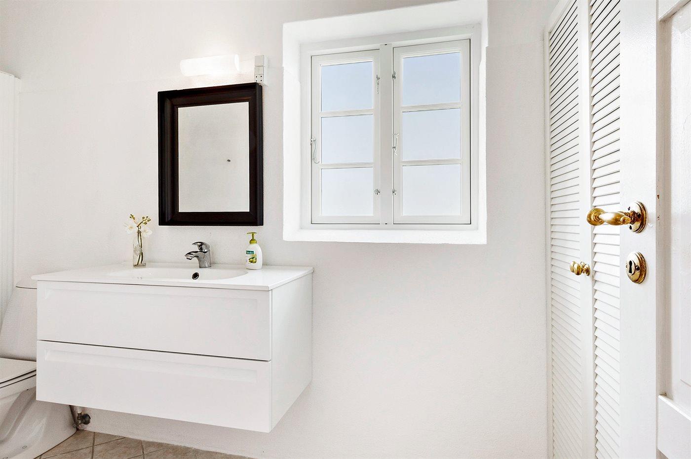 Der er 2 badeværelser med bruseniche og 2 toiletter, heraf 1 gæstetoilet. Der er gulvvarme på 1 badeværelse.. Badekar.