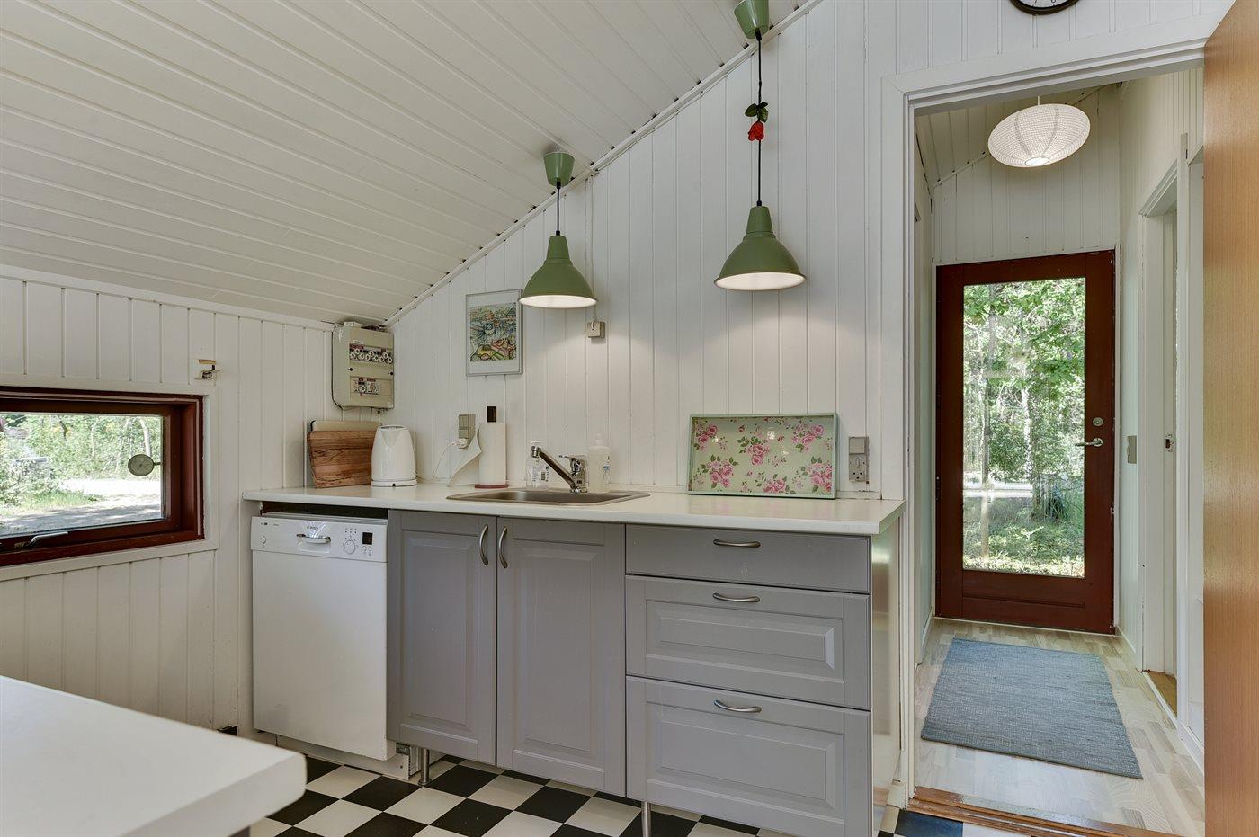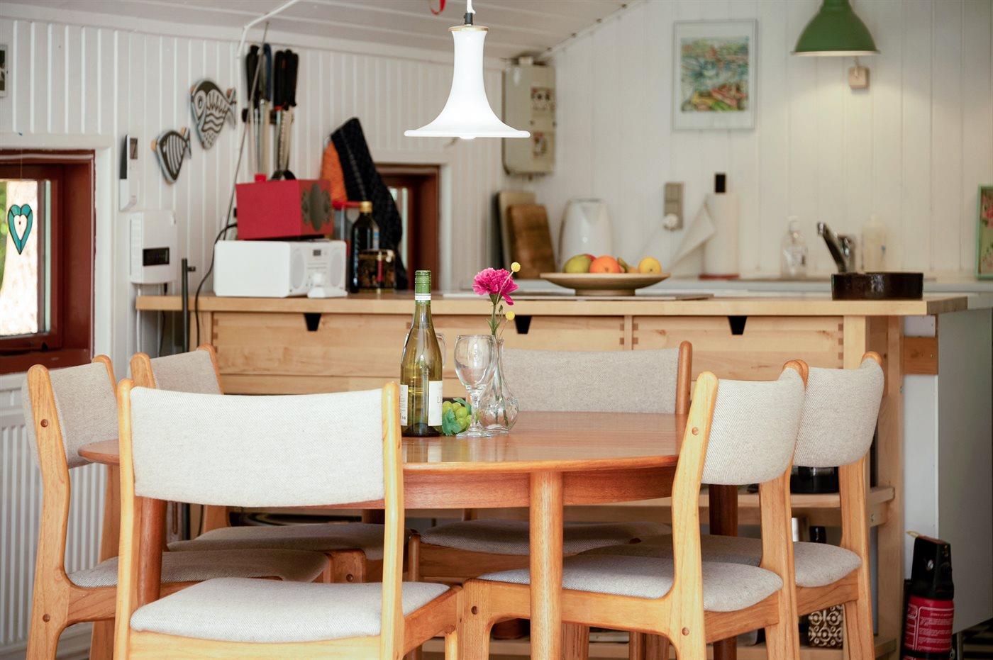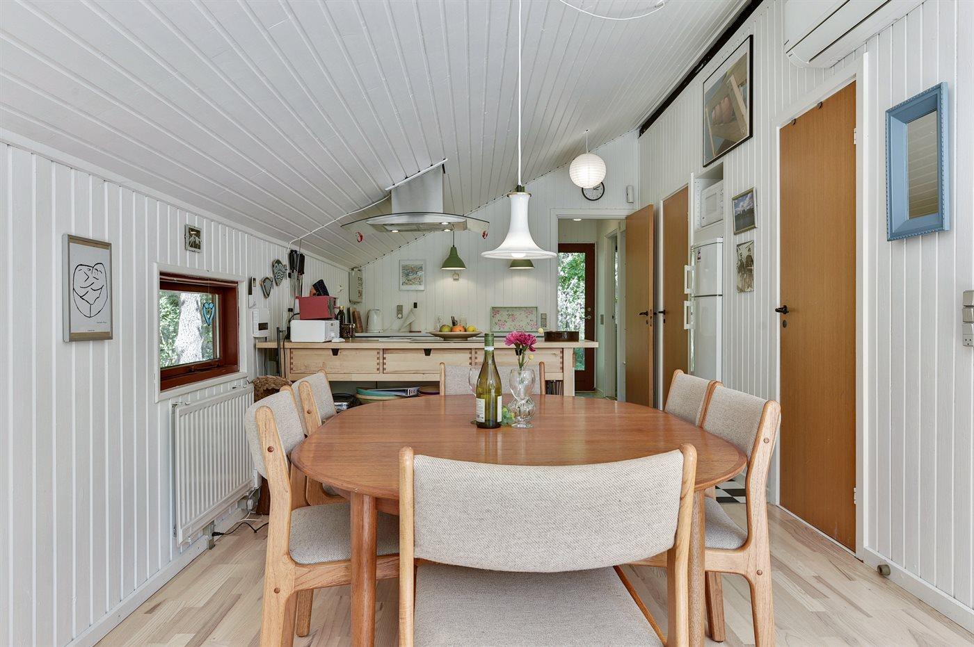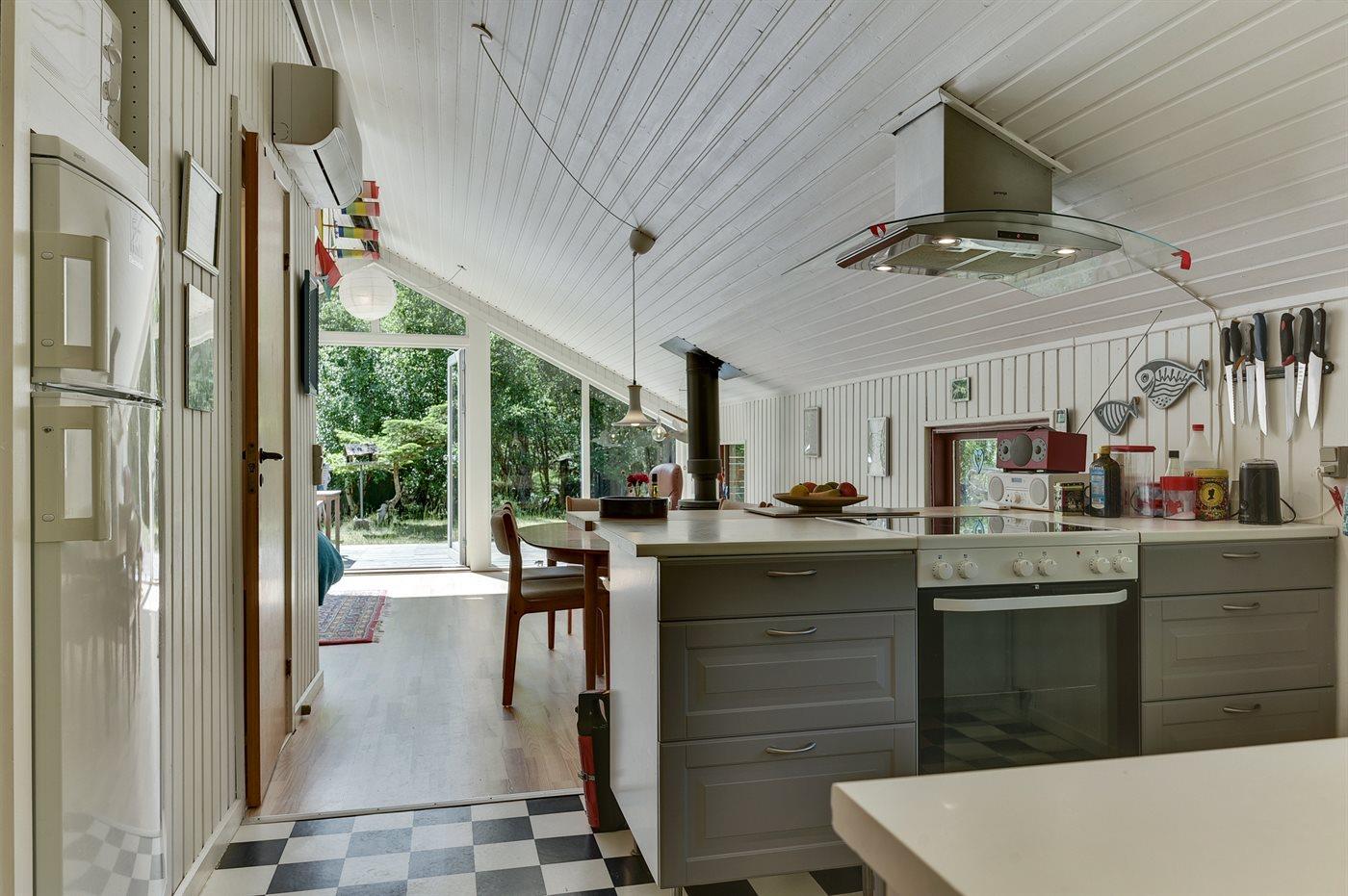 Køkkenet er udstyret med 1 køleskab. Der er 4 keramiske kogeplader, bageovn, mikrobølgeovn samt opvaskemaskine.