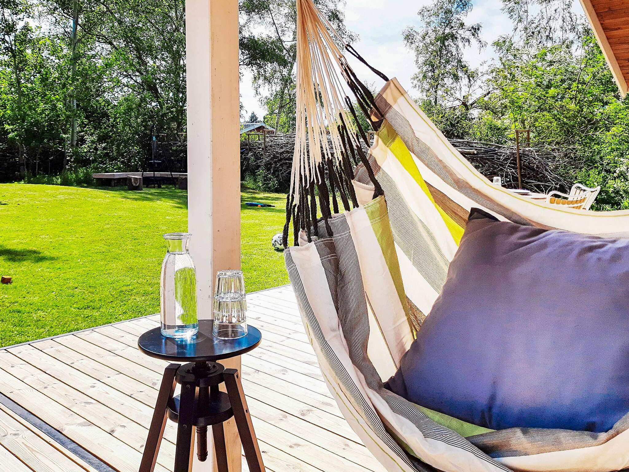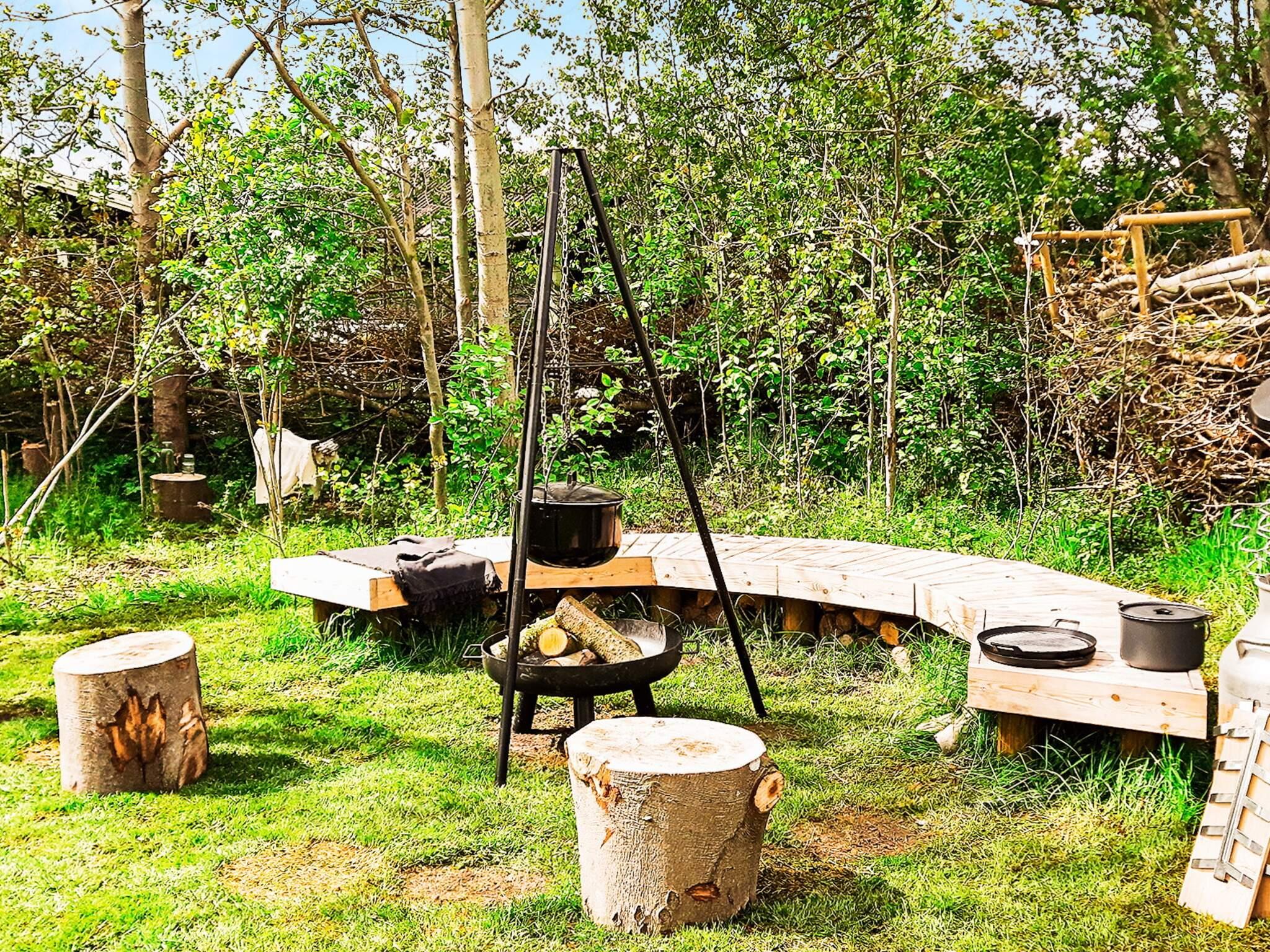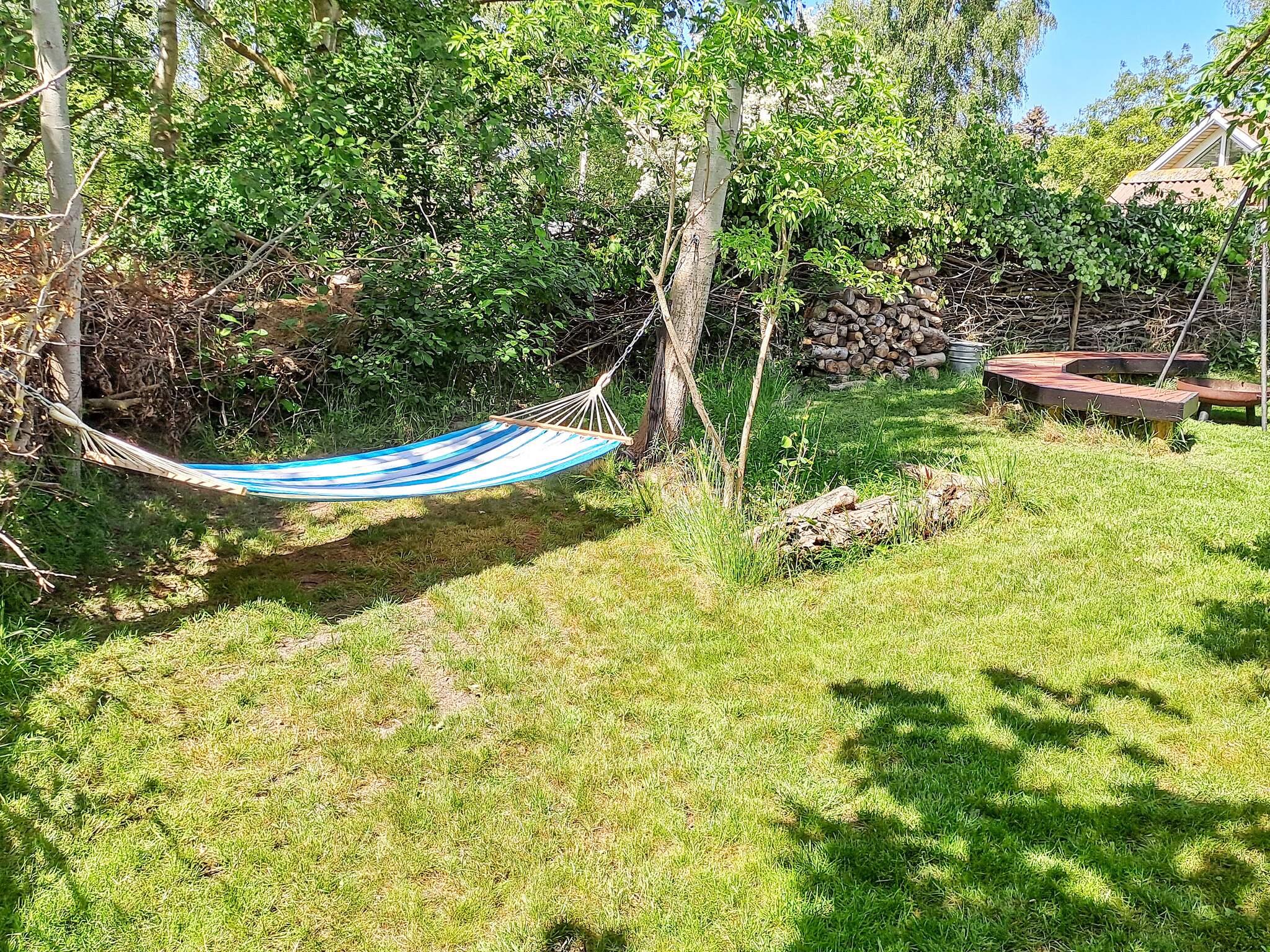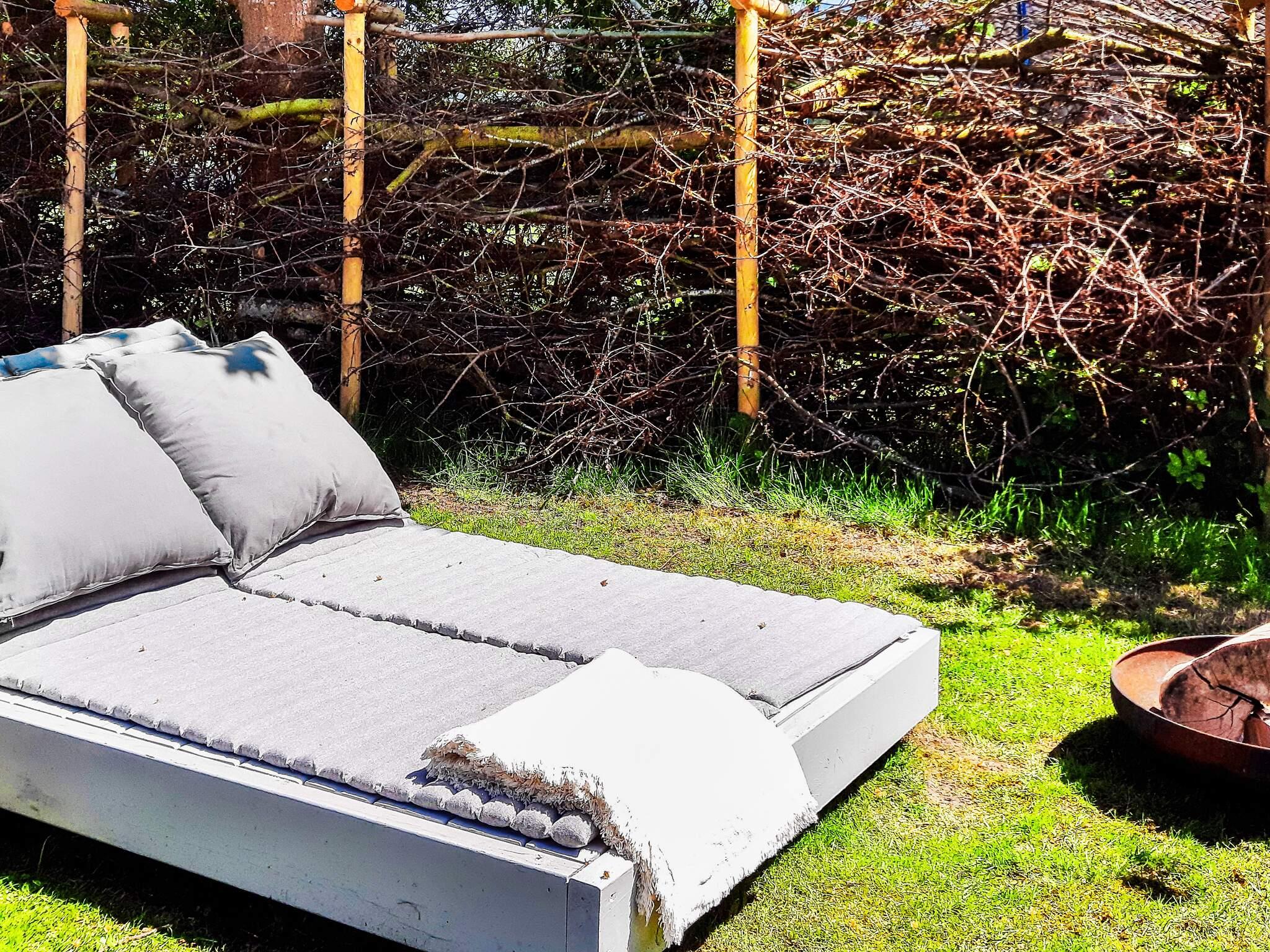 Haven og terrassen sydvendt og ligger ugenert (privat). Det er muligt at nyde solen hele dagen eller slappe af i skyggen. På venstre side af huset er der en hyggekrog, med et bord- og bænkesæt, hvorfra der er adgang til grill, bålfad og bålstativ. På højre side af huset er der en solseng til 2 personer. Bagest i haven er der også etableret en bålplads med en stor bred bænk og individuelle siddepladser. Der er bålfad, bålstativ og et udvalg af redskaber og andet tilbehør til bålpladsen.