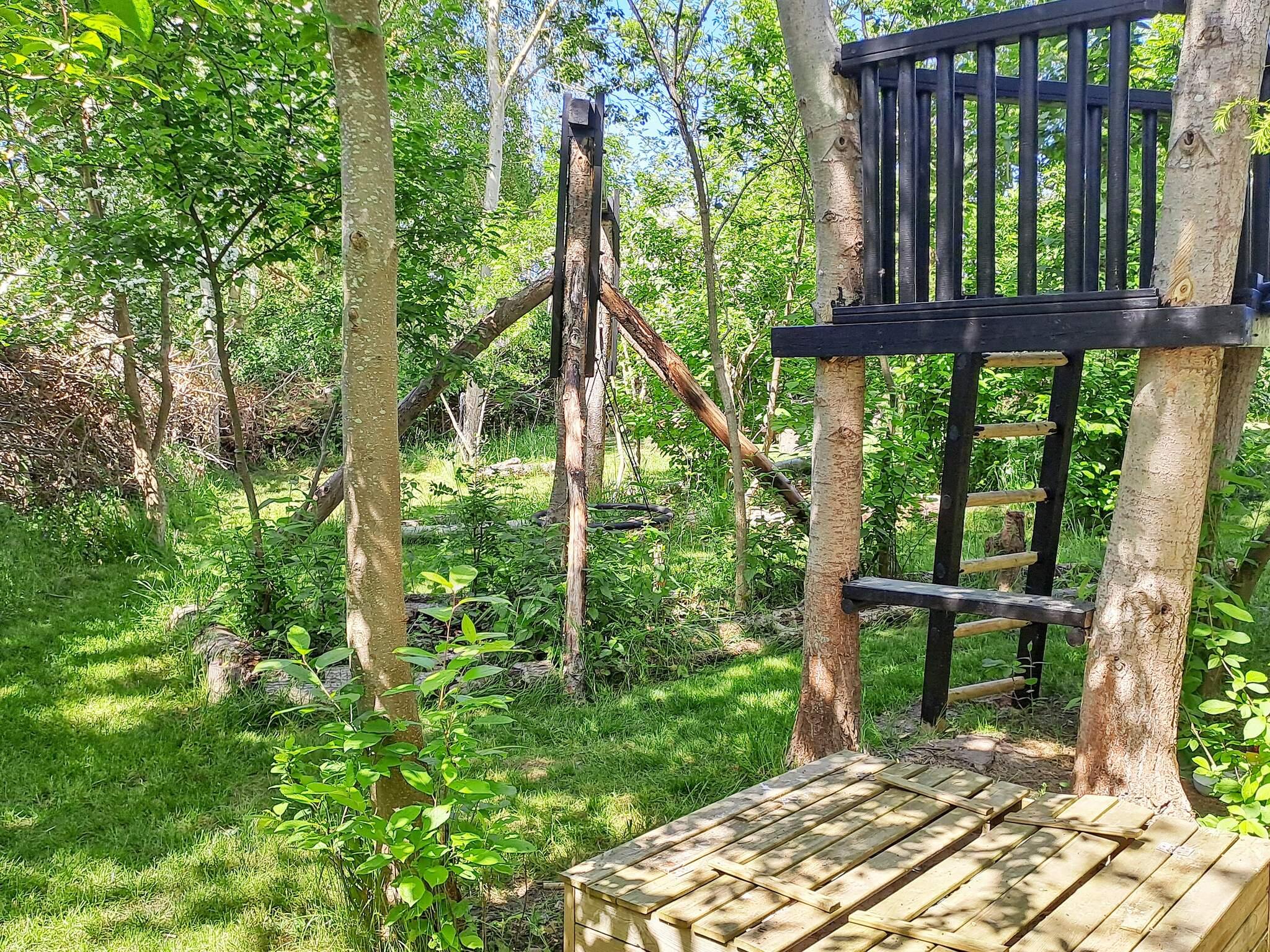 Den bagerste del af haven er delvist bevaret som naturgrund, som giver gode muligheder til brug for afslapning eller leg. Der er opsat hængekøjer, sansegynge og en sandkasse. Der er forskellige spil til udendørs brug og leg.