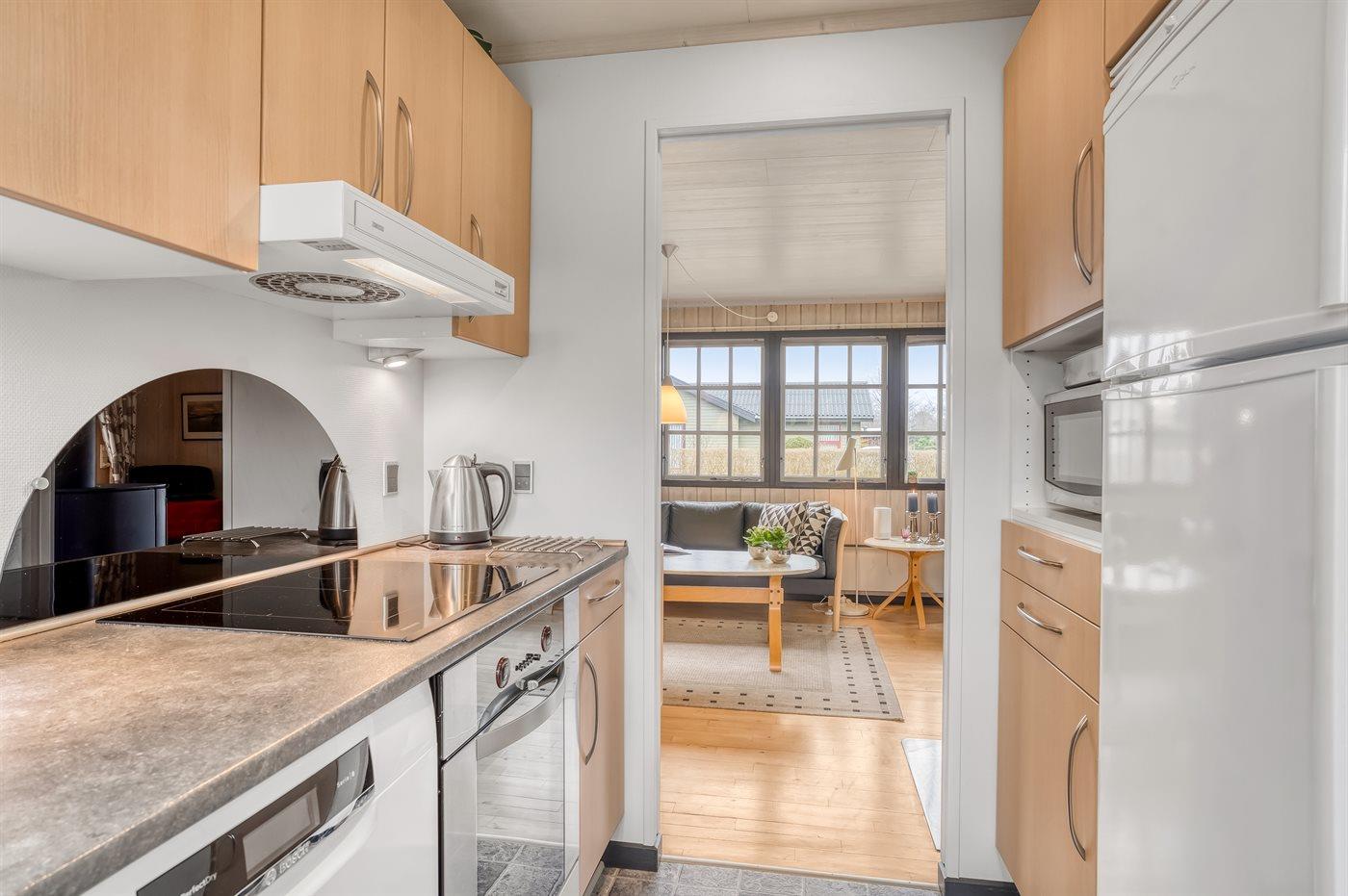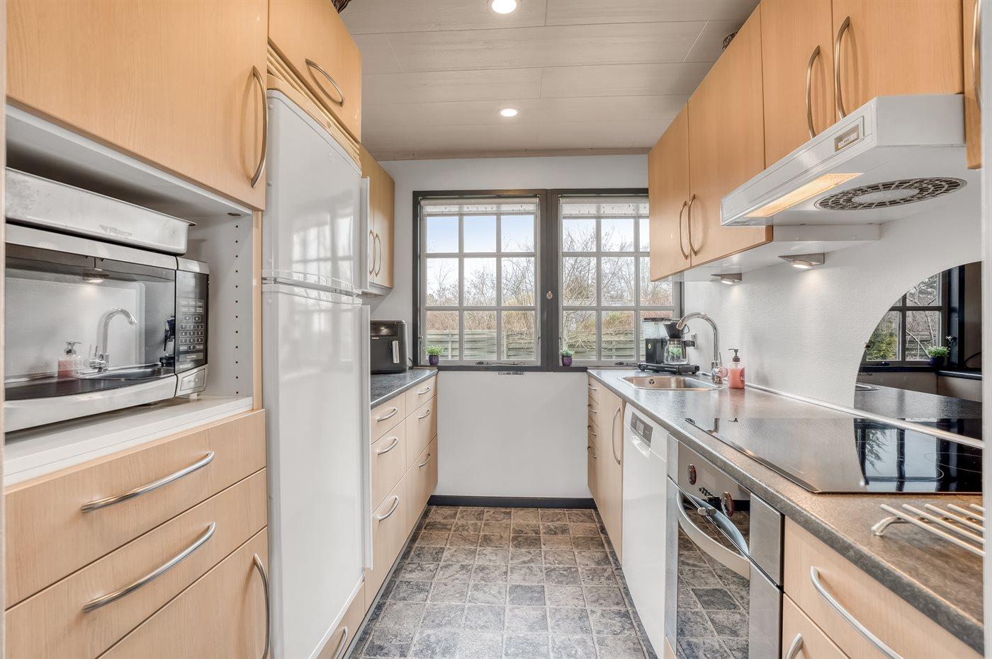Køkkenet er udstyret med 1 køleskab. Der er 4 induktionskogeplader, varmluftovn, mikrobølgeovn, Airfryer samt opvaskemaskine.