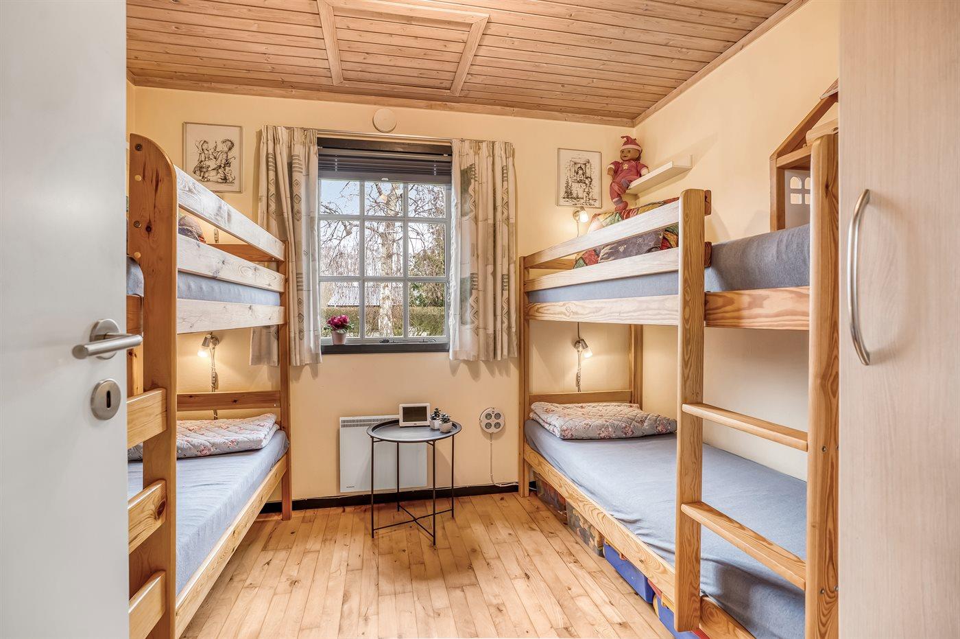 Der er i alt 2 soveværelser. Sovepladserne fordeler sig på: 2 sovepladser i dobbeltseng. 4 sovepladser i køjesenge. Derudover er der 1 stk. barneseng.