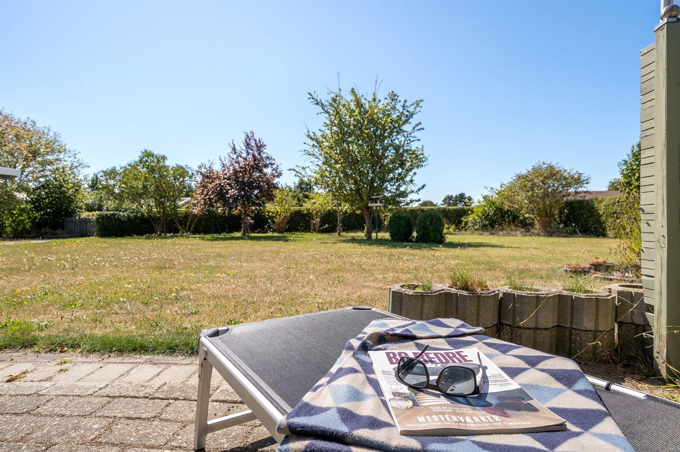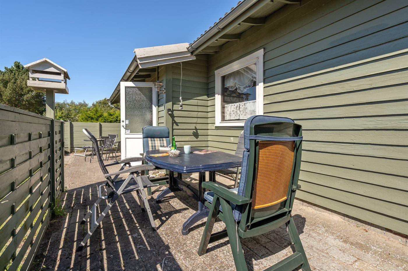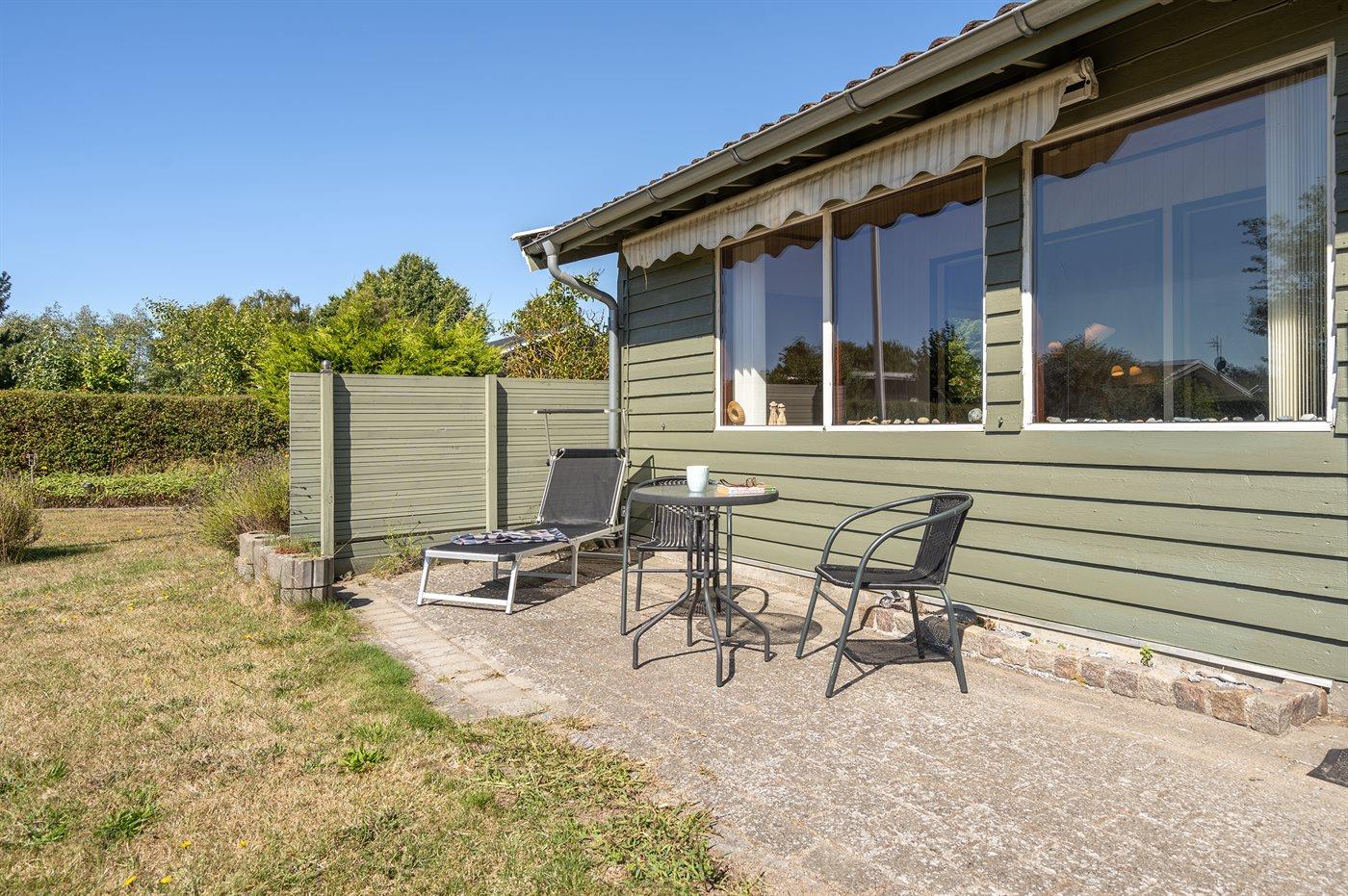 Ferieboligen er beliggende på en 1000 m² stor havegrund. Der er 600 m til havet. Nærmeste forretning er beliggende i en afstand af 2500 m. Til ferieboligen hører åbent terrasseareal. Der er redskabsrum. Der ligger en legeplads i en afstand af 200 m. Grill til rådighed. Der er carport til rådighed. Parkering ved ferieboligen.