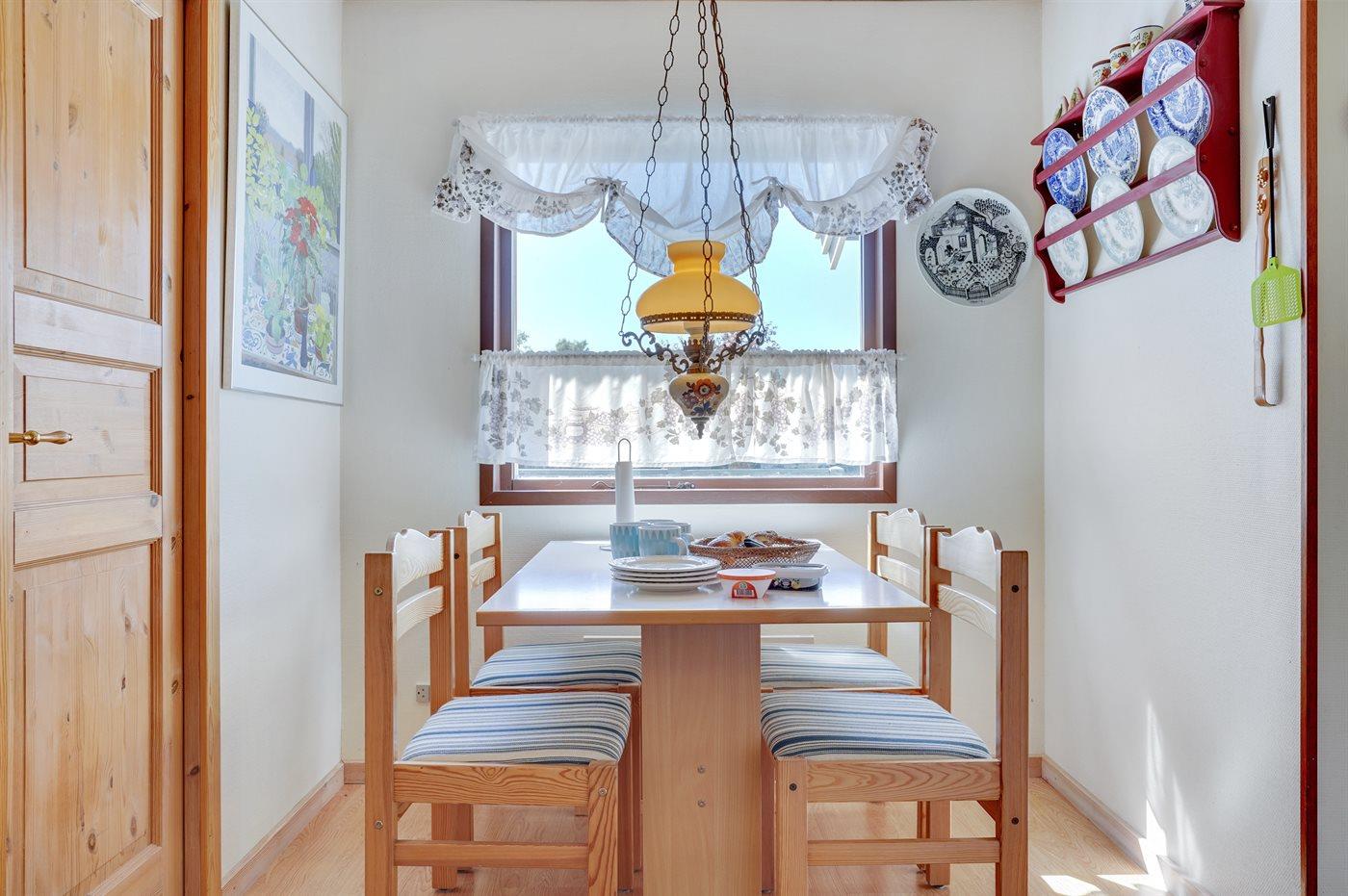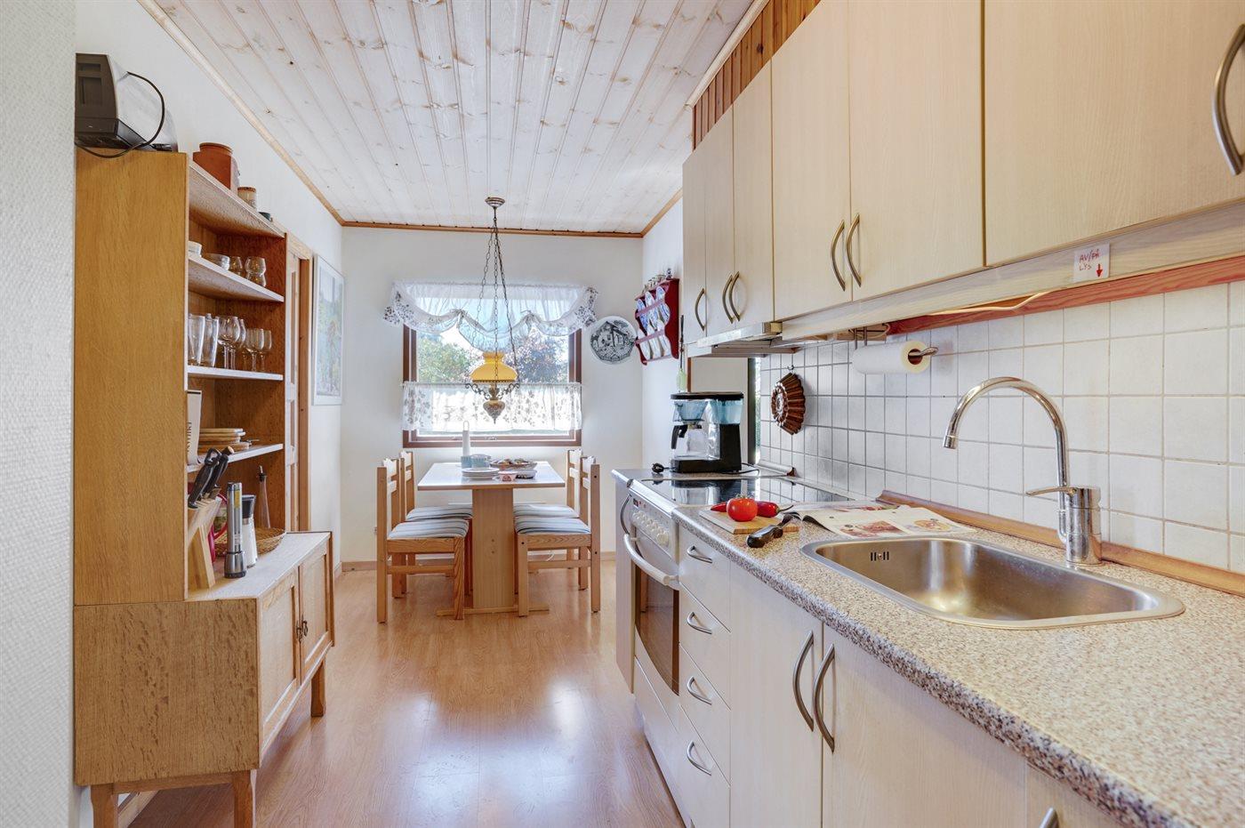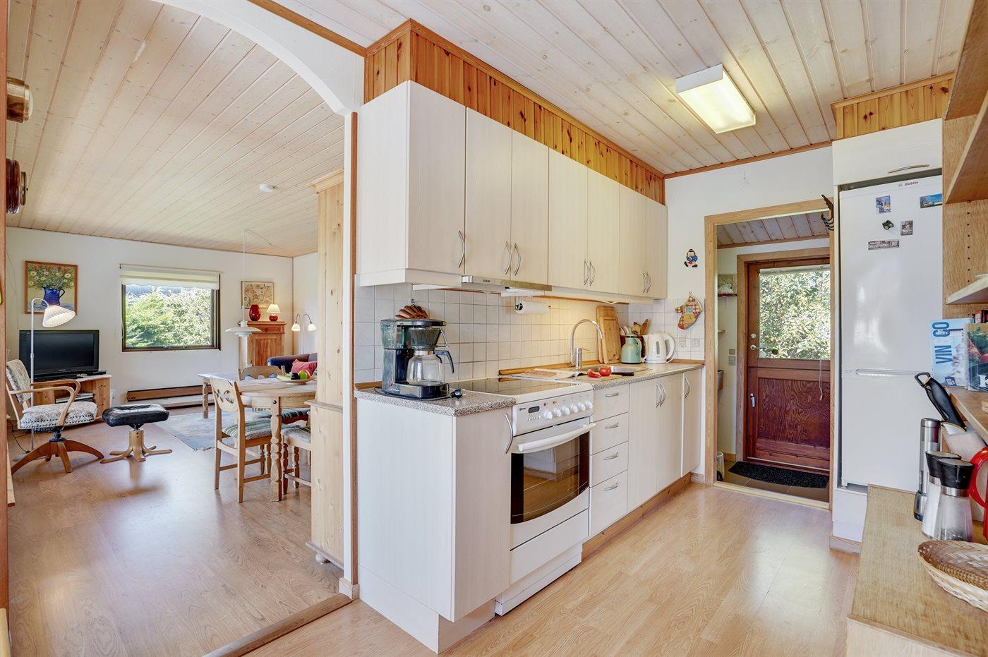 Køkkenet er udstyret med 1 køleskab. Der er 4 keramiske kogeplader, varmluftovn.