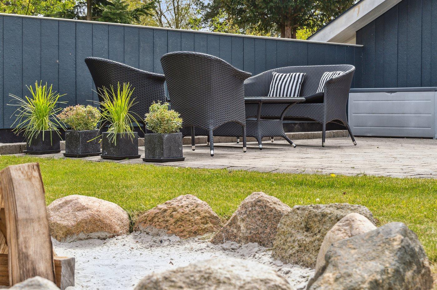 Hyggeligt sommerhus nær Lollands sydkyst med terrasse, bålsted og kort afstand til stranden.