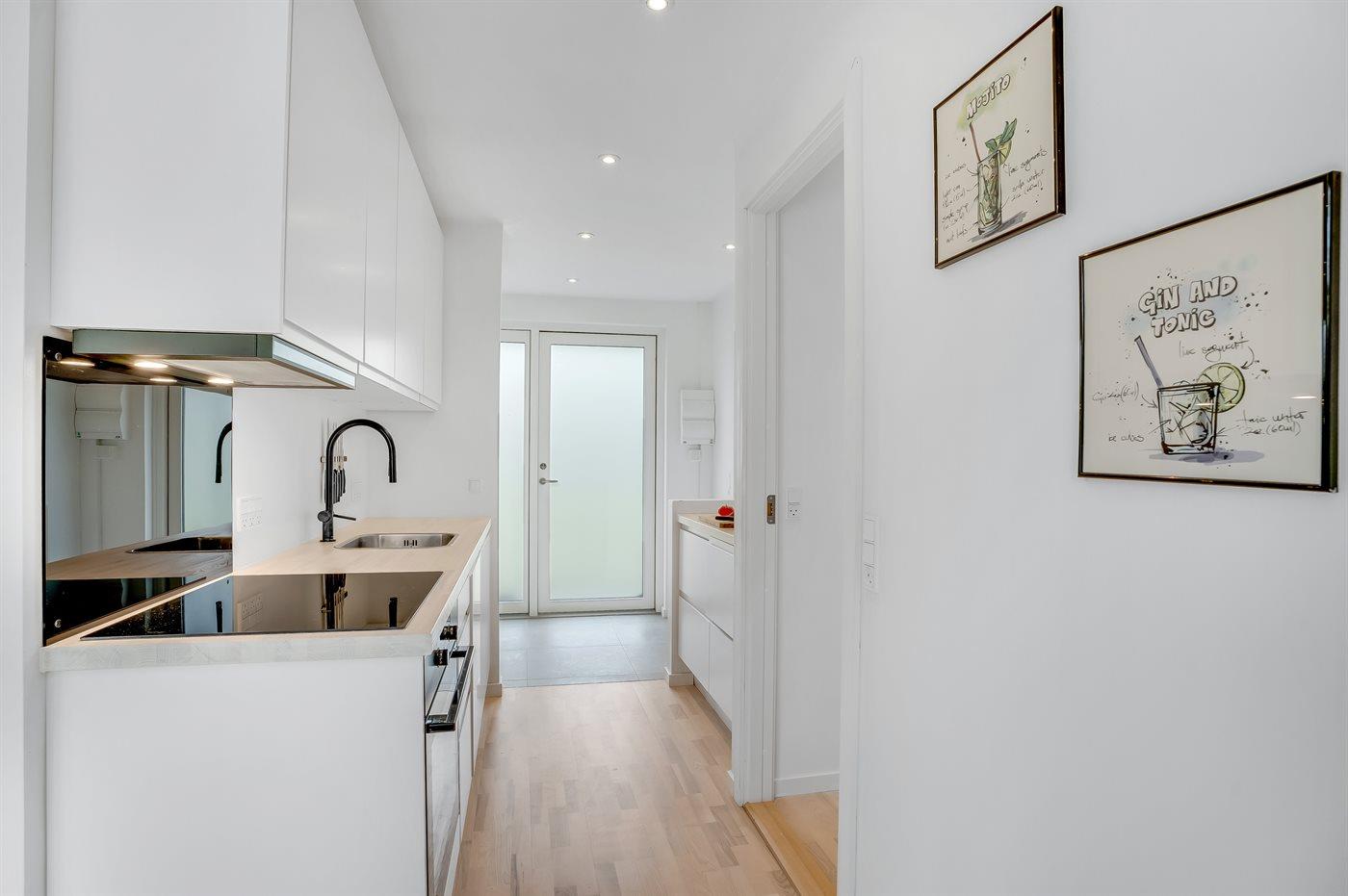 Køkkenet er udstyret med 1 køleskab. Der er 4 keramiske kogeplader, varmluftovn samt opvaskemaskine.