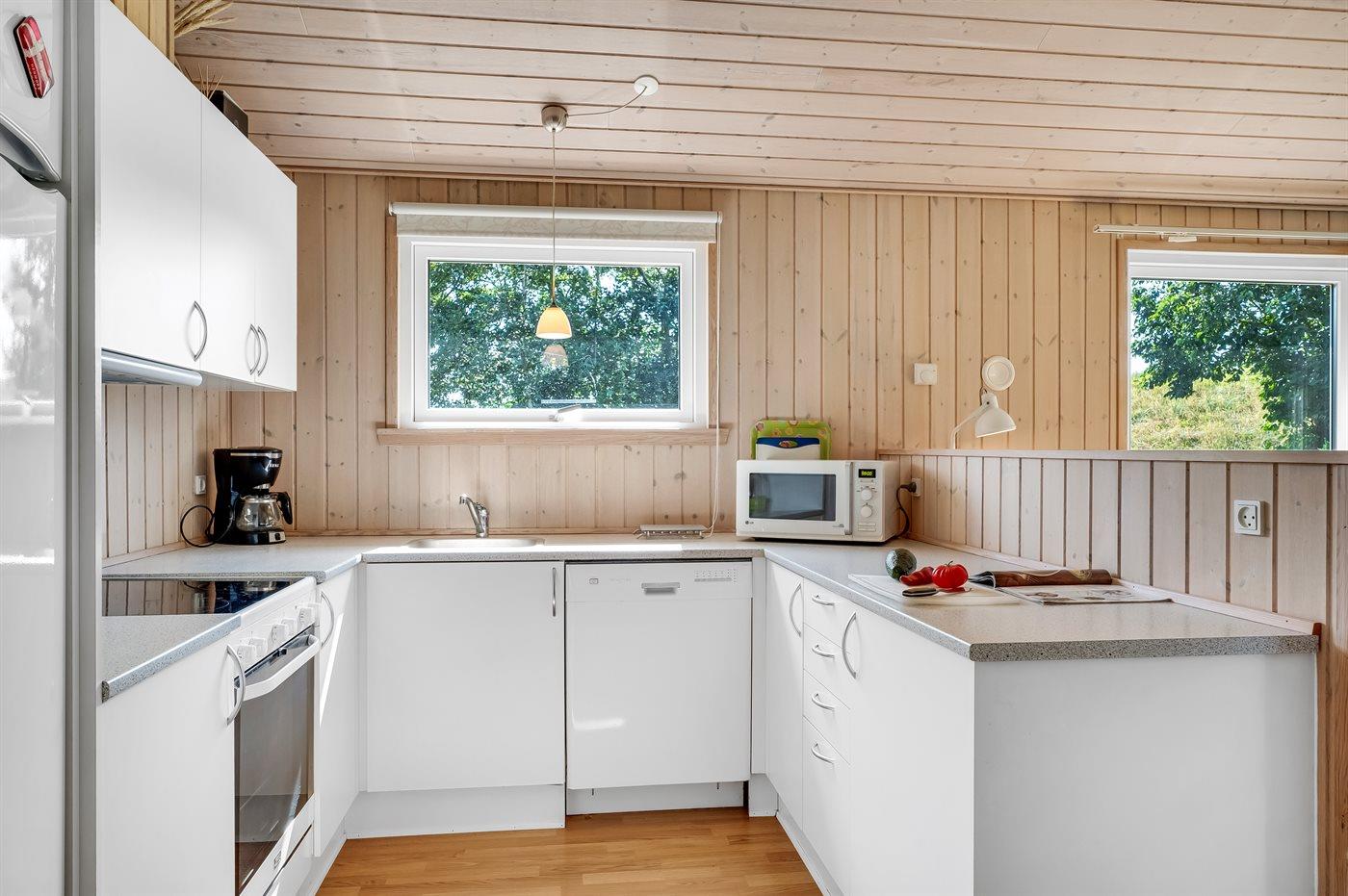 Køkkenet er udstyret med 1 køleskab. Der er 4 keramiske kogeplader, varmluftovn samt opvaskemaskine.