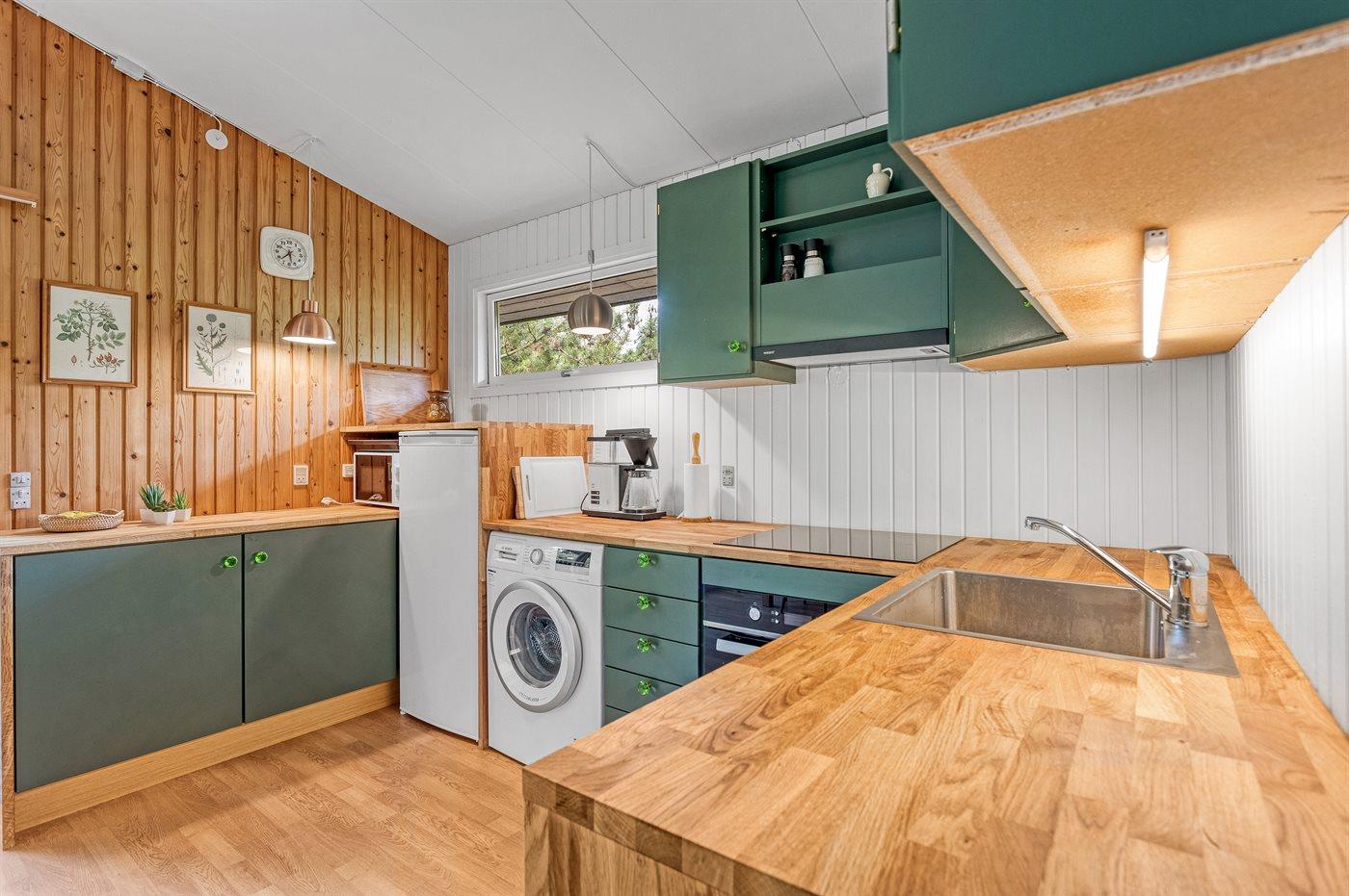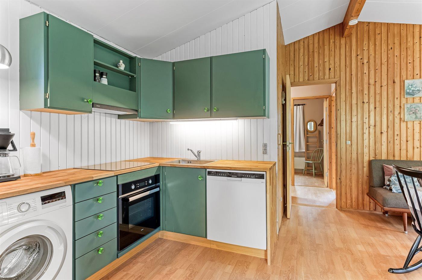 Køkkenet er udstyret med 1 køleskab. Der er 4 induktionskogeplader, varmluftovn, mikrobølgeovn samt opvaskemaskine.