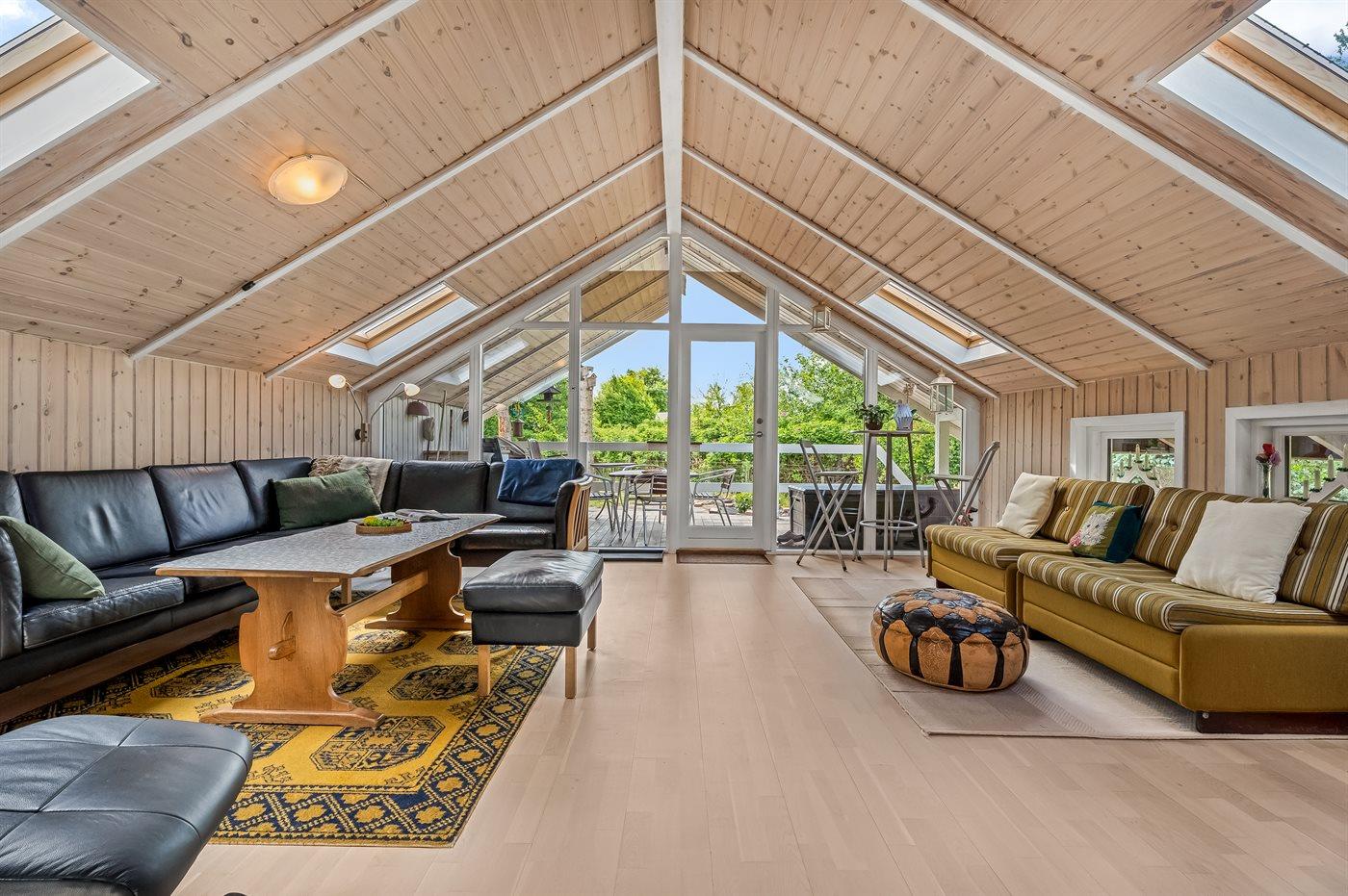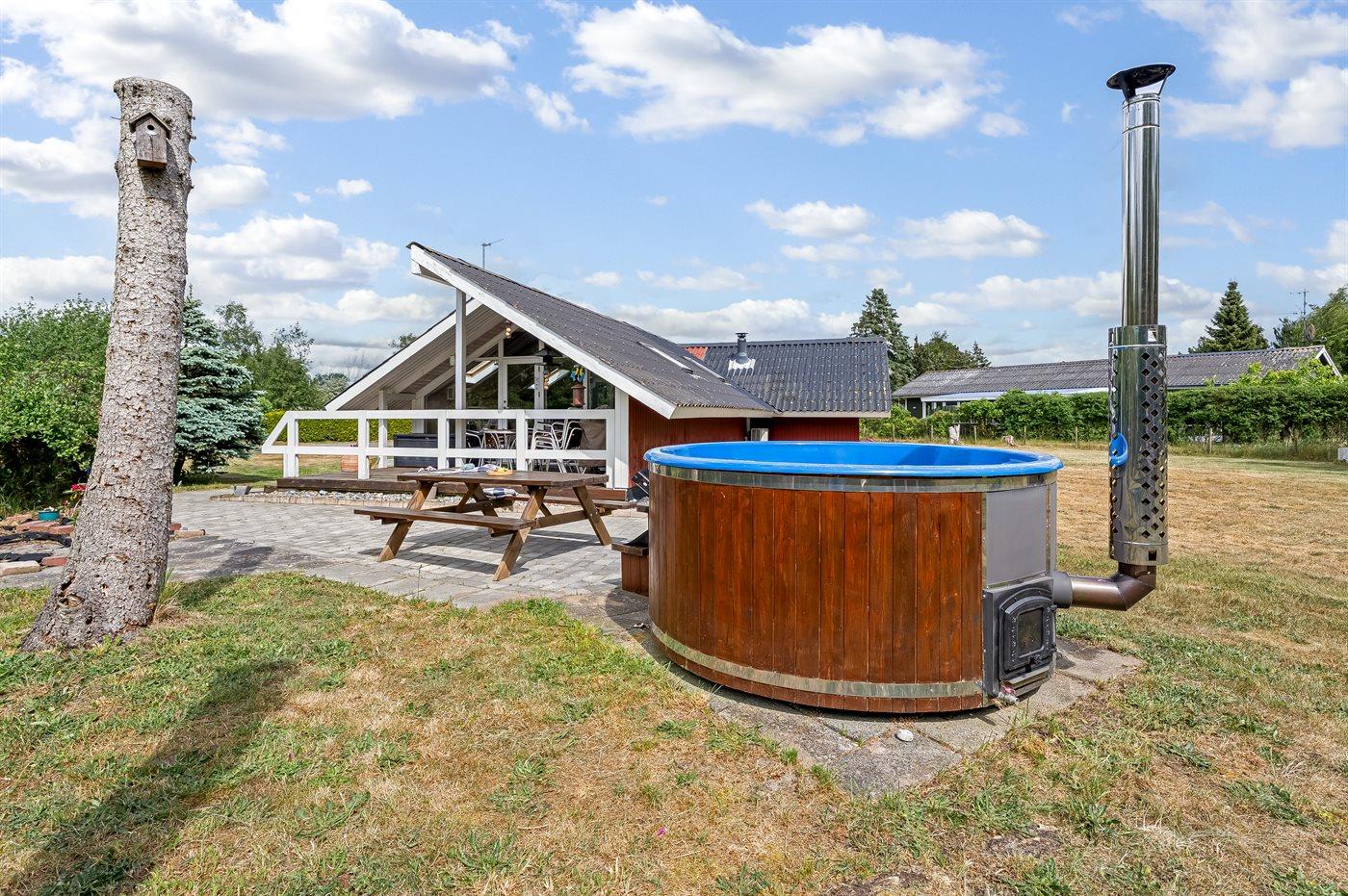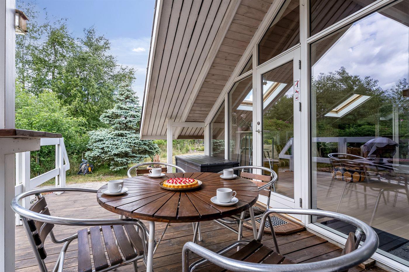 På husets dejlige, store terrasse, hvor man selv kan vælge, om man vil sidde i skygge eller i solen, kan man f.eks. nyde de solrige sommerdage med at hyggesnakke omkring havebordet eller tilberede lækre måltider på grillen. Fra terrassen kan I også hoppe i det skønne vildmarksbad og nyde det varme vand og måske drikke et glas vin under stjernehimmelen.