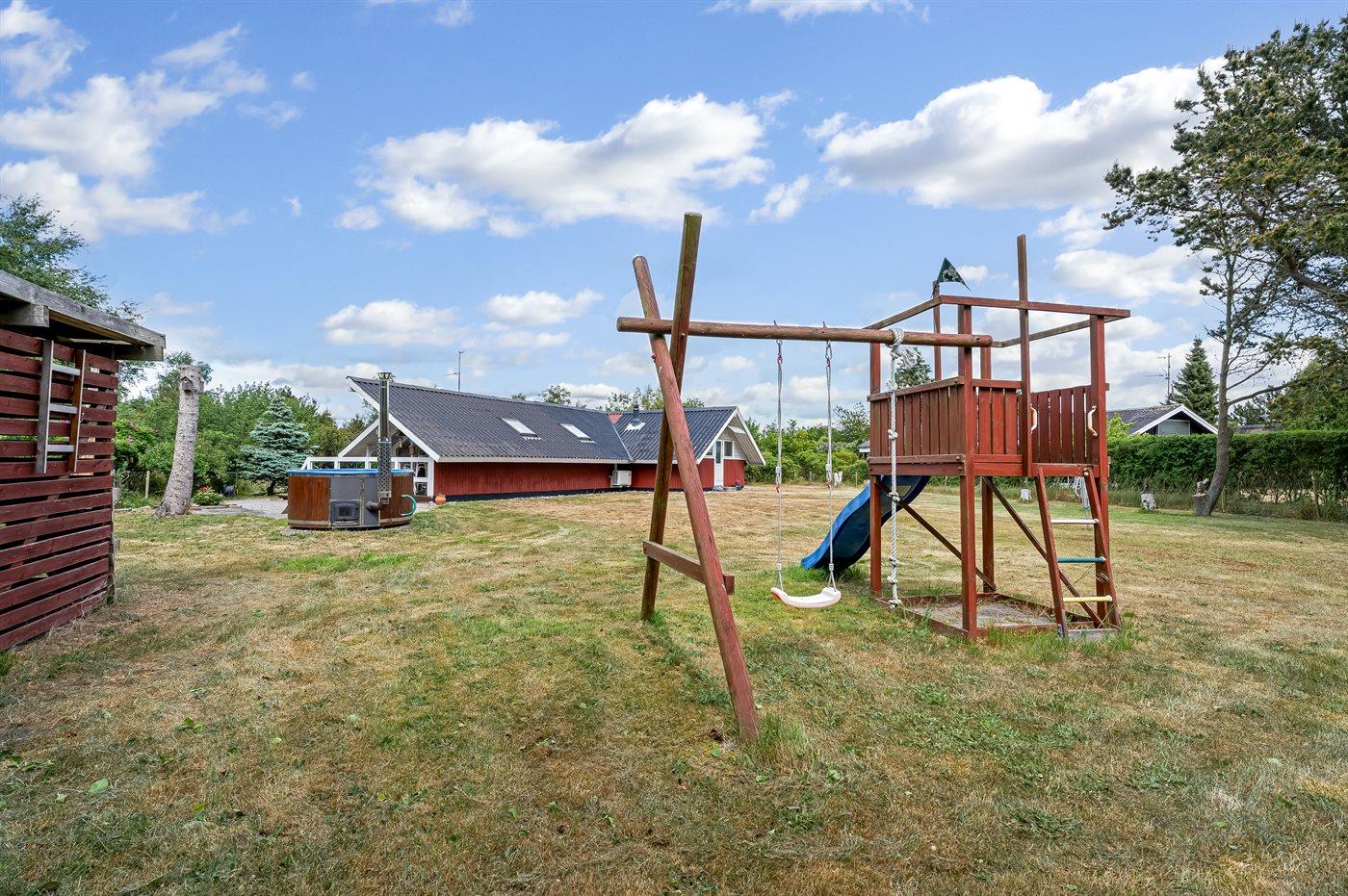 Ferieboligen er beliggende på en 980 m² stor havegrund. Der er 500 m til havet. Der er en badebro i nærheden. Nærmeste forretning er beliggende i en afstand af 2500 m. Til ferieboligen hører åbent terrasseareal. Desuden er der overdækket terrasse. Gynge. Legetårn. Rutchebane. Grill til rådighed. Parkering ved ferieboligen.