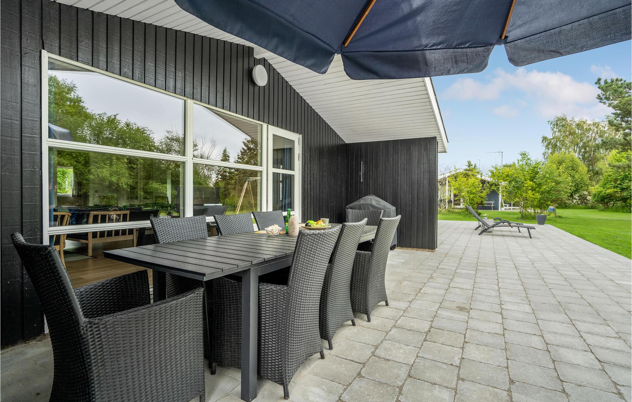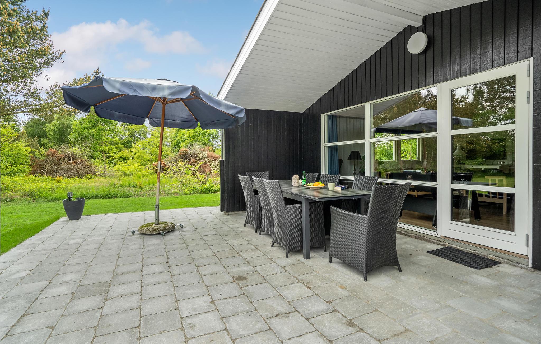 Mod haven er en dejlig stor terrasse med gangsti rundt om hele huset. Terrassen har ligeledes et overdækket område, hvor der er plads til at sidde og spise. Der forefindes havemøbler med hynder, herunder solvogne samt en Weber kul grill.