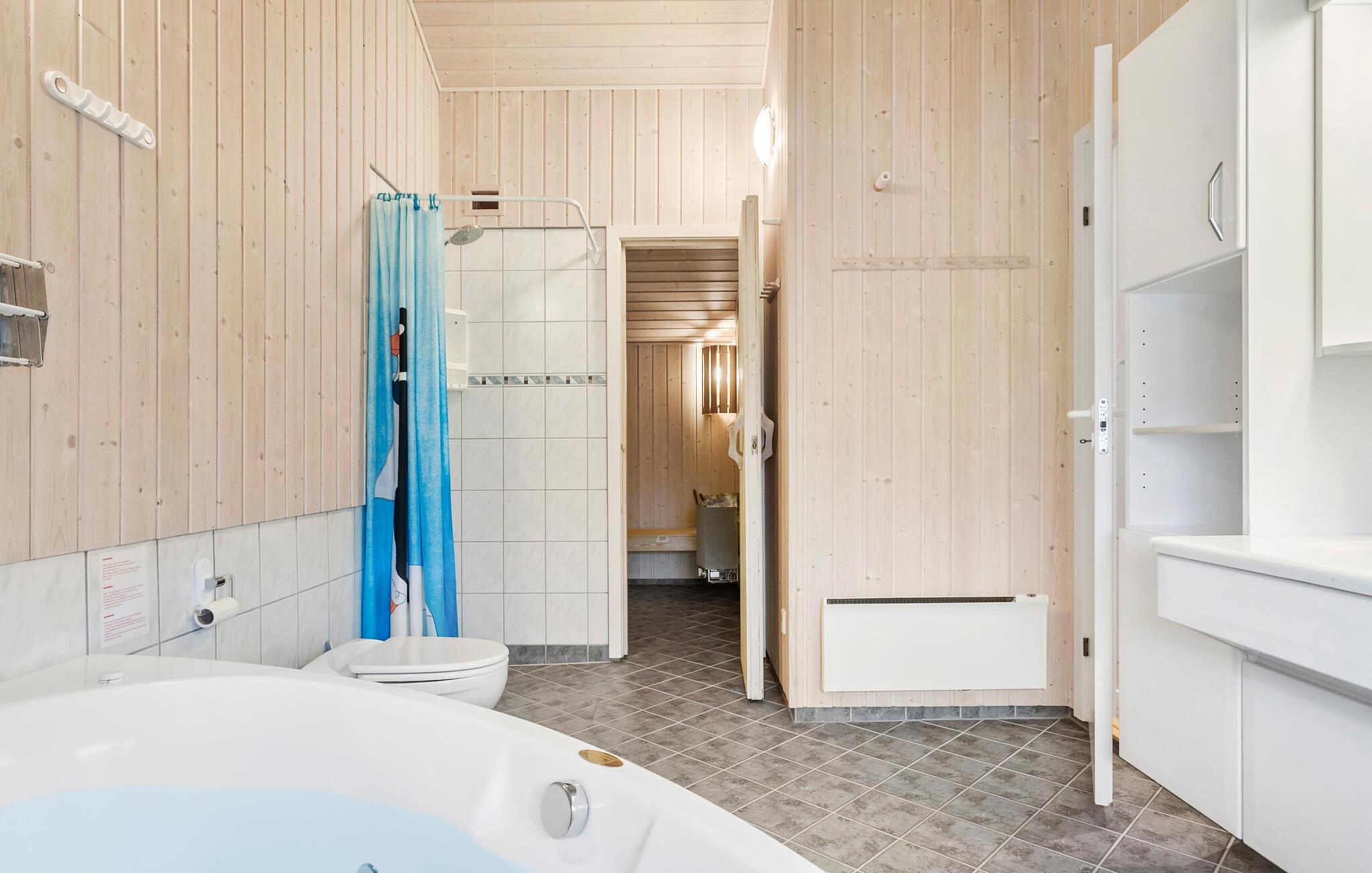Rummeligt sommerhus nær badestrand med sauna, spabad og moderne faciliteter i naturskønne omgivelser.