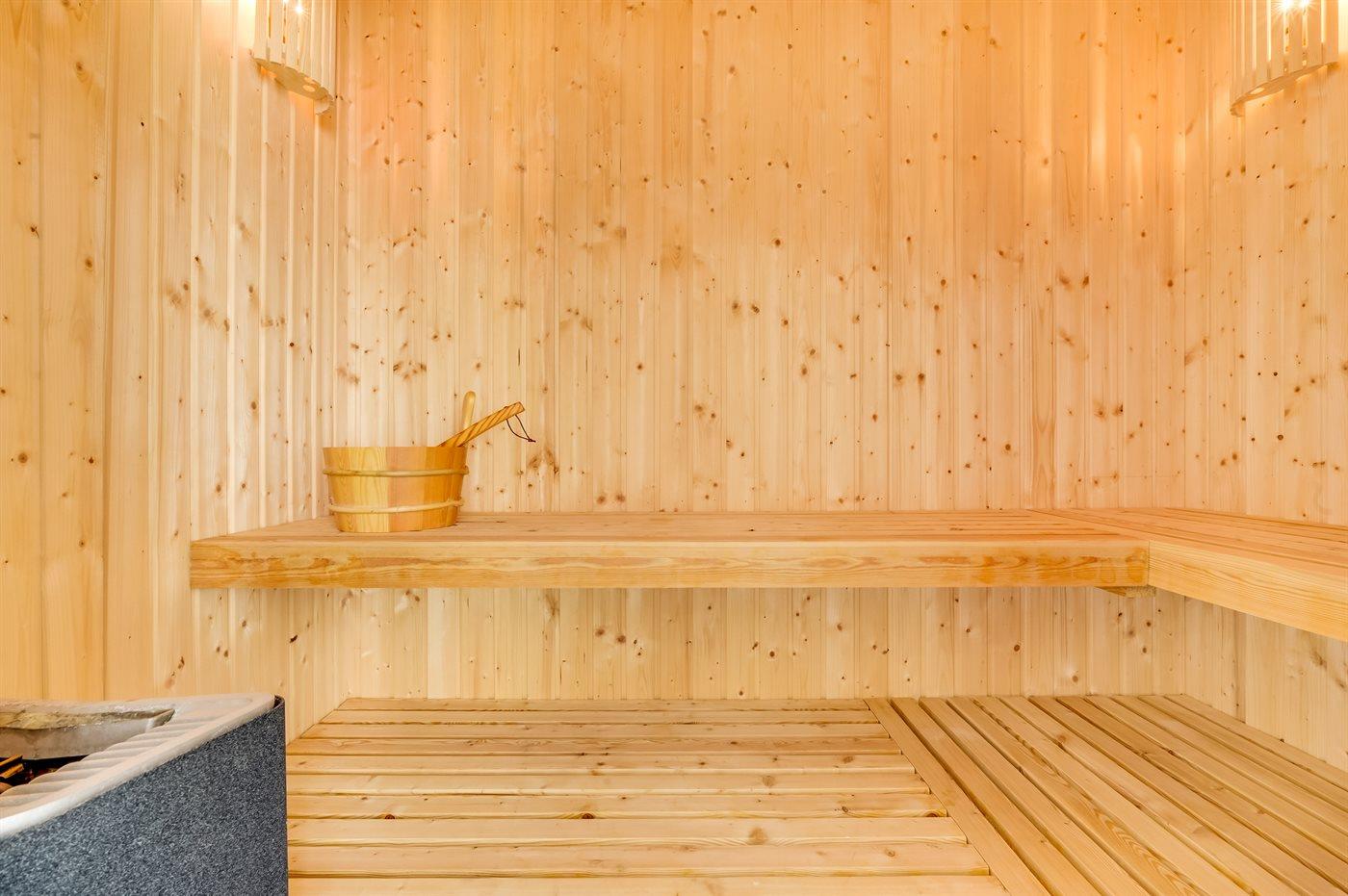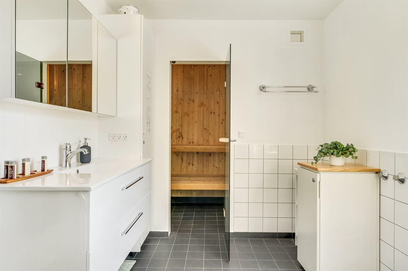 Der er 2 badeværelser med bruseniche og 3 toiletter, heraf 1 gæstetoilet. Der er gulvvarme på 2 badeværelser. I saunaen er der mulighed for afslapning.