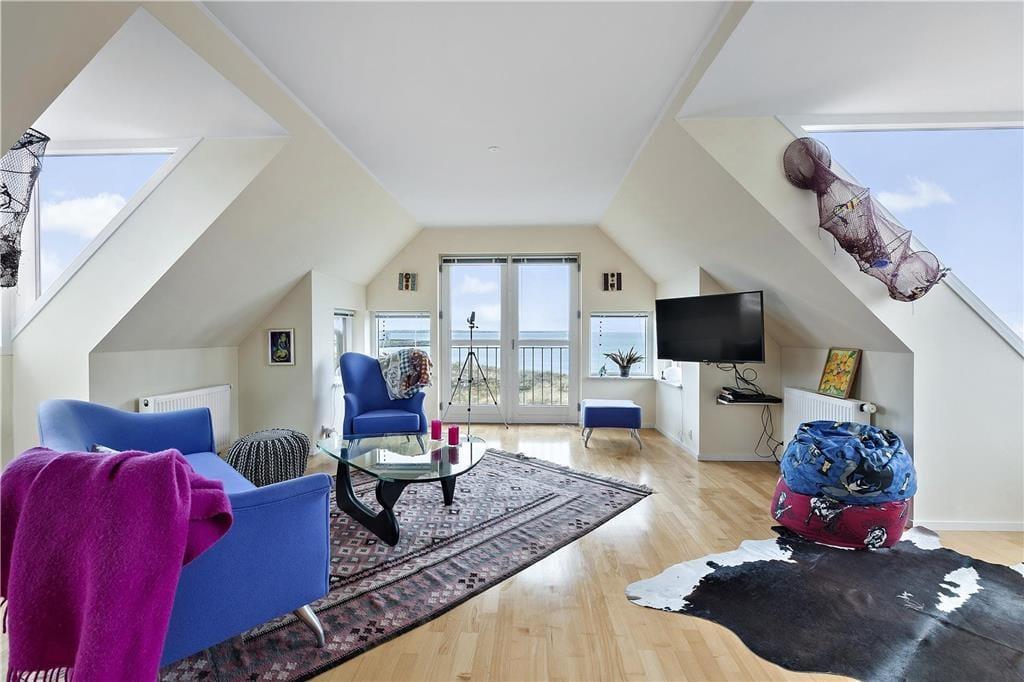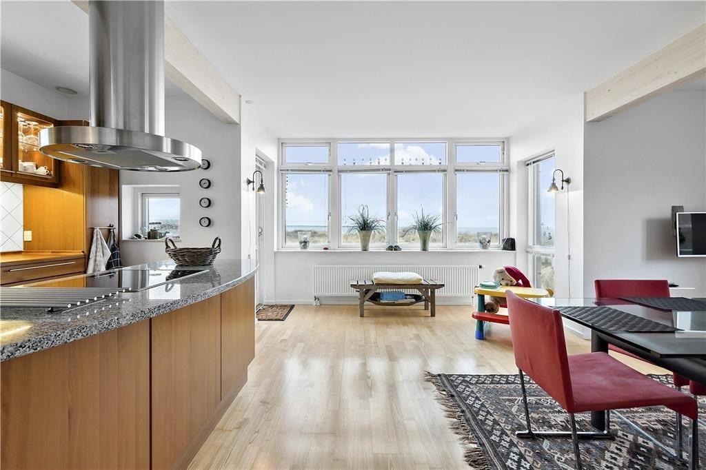 Sommerhuset byder på et stort og lyst køkken-alrum med panoramavinduer, der åbner op til havets endeløse horisont. Her kan du opleve marhalmen svaje i vinden og lade blikket glide over den storslåede udsigt, som skifter med årstidernes farver. Fra 1. salen er udsigten endnu mere imponerende, og du kan betragte stranden og havets skønhed i al sin pragt. Sommerhuset har rummelige værelser, der giver plads til hele familien, og praktiske faciliteter som et badeværelse, et ekstra gæstetoilet og et bryggers med vaskesøjle. Her er tænkt på alt, hvad du behøver for en bekvem og afslappende ferie.
