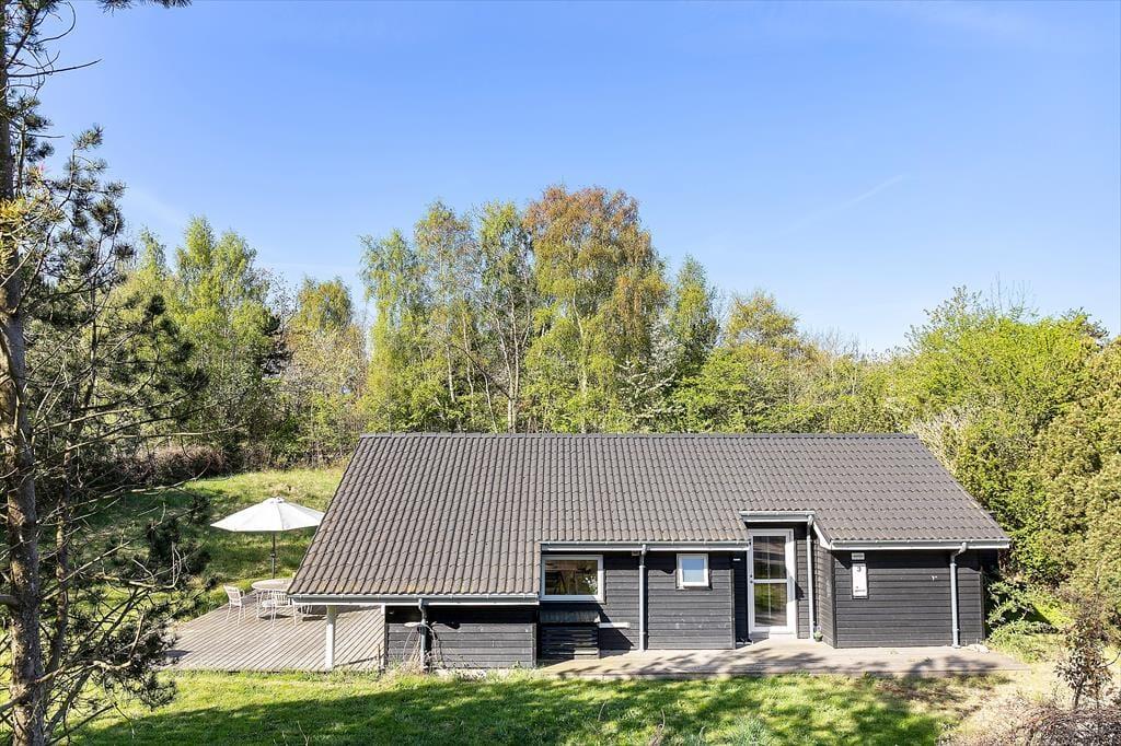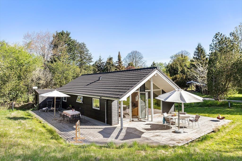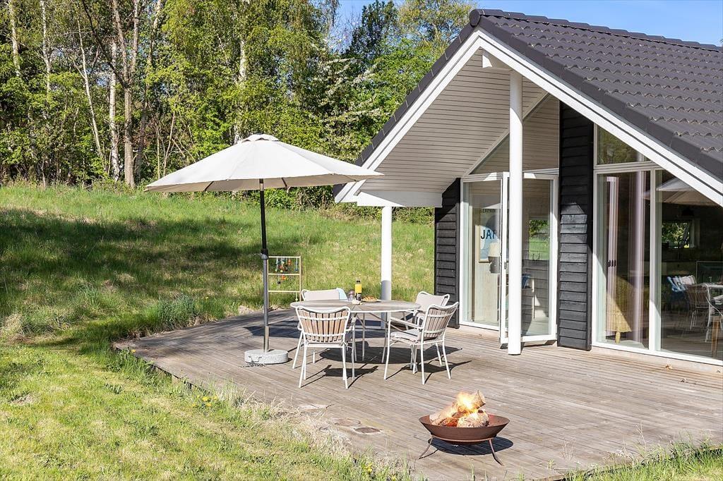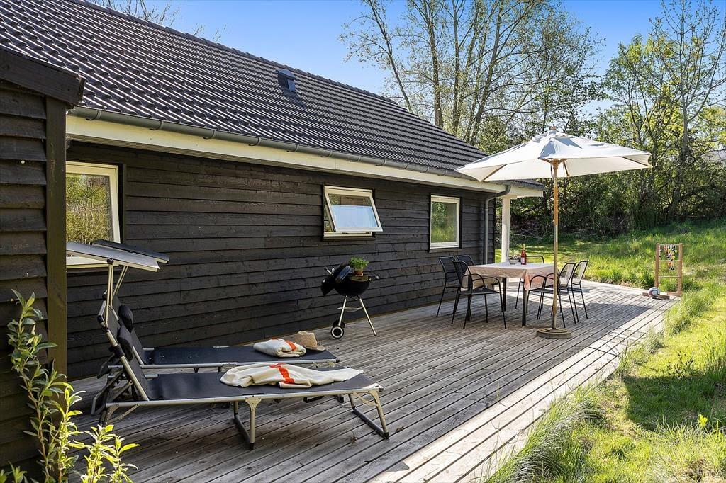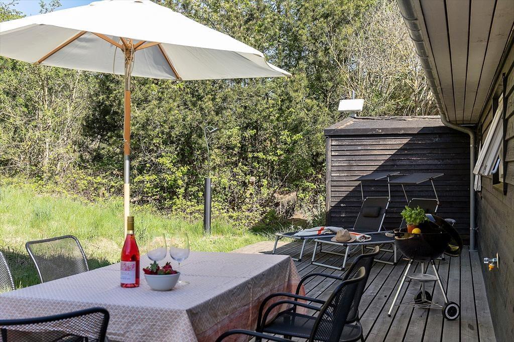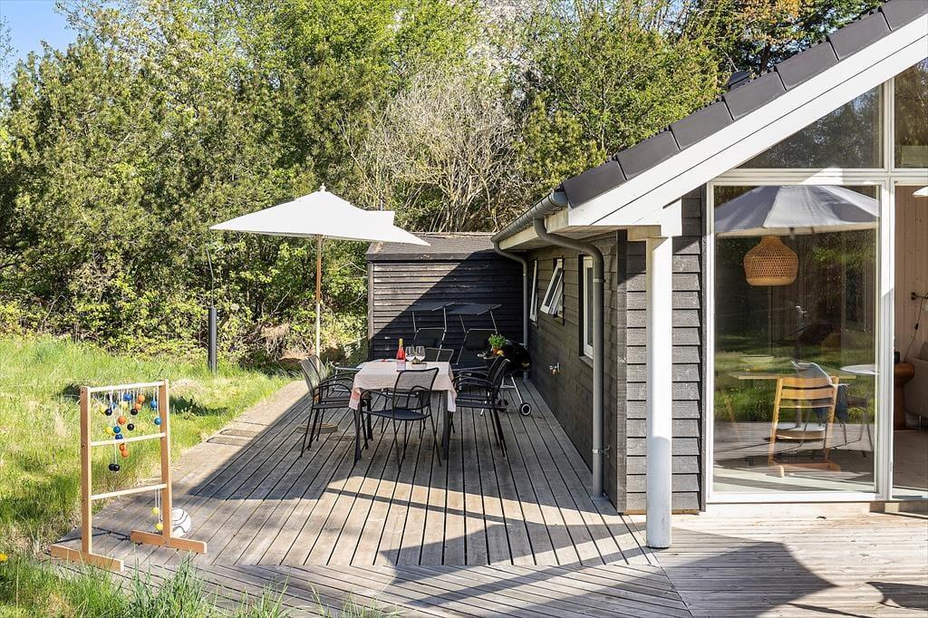 Den store træterrasse er sommerhusets hjerte udendørs – her kan du følge solen eller søge skygge hele dagen, takket være terrassens placering hele vejen rundt om huset. På bagsiden af huset finder du en helt privat terrasse, hvor du også kan nyde det skønne udendørsbrus efter en tur til stranden. Haven byder på en velplejet plæne, perfekt til leg, boldspil og sjov, og i skuret finder du bl.a. stige-golf til glæde for hele familien.