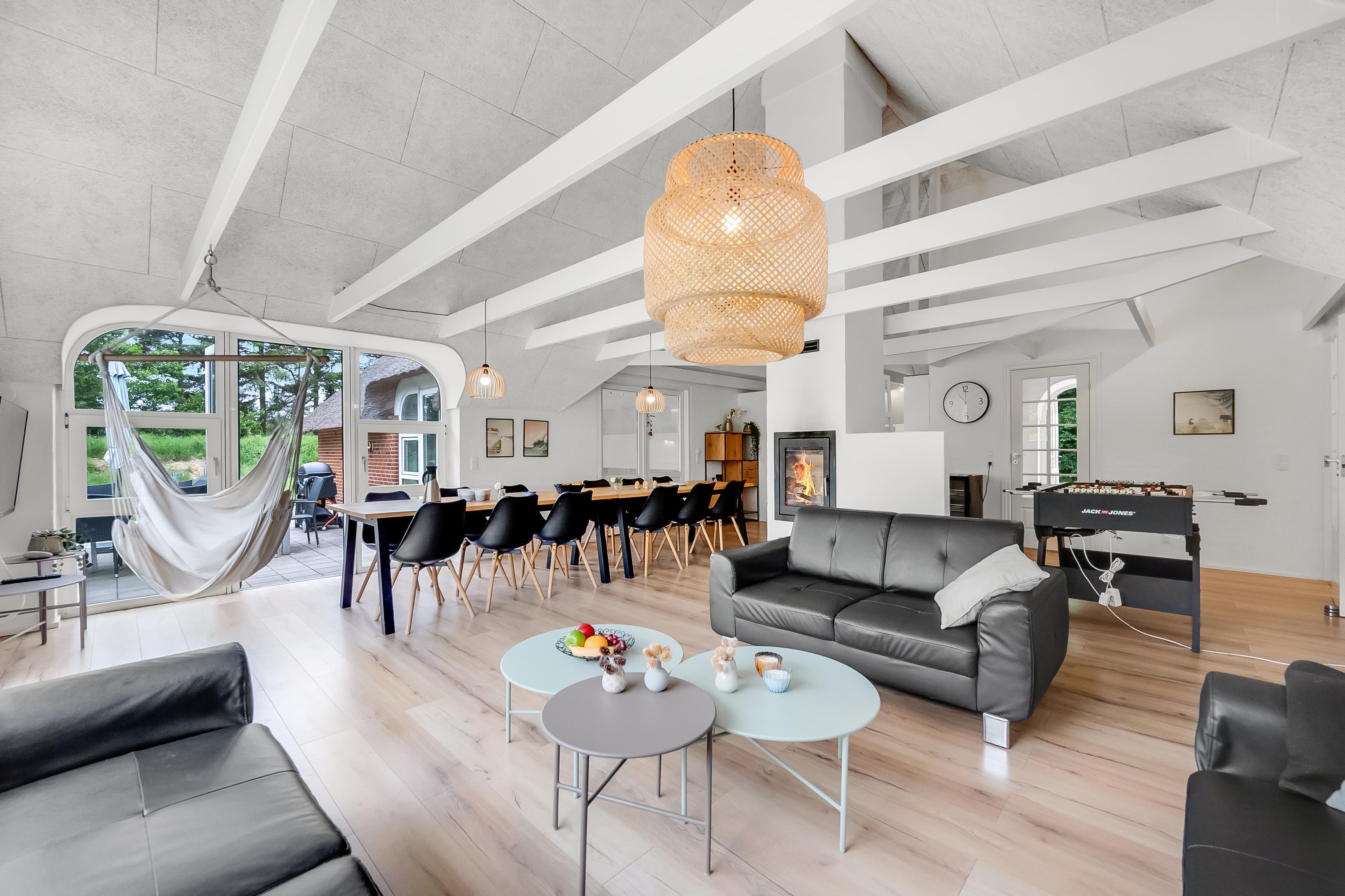 Indretningen fra 2023 er lys og indbydende, med troldtekt-lofter, som skaber et behageligt lydniveau, og store vinduer, der giver masser af naturligt lys og udsigt til den grønne natur. Det åbne opholdsrum er hjemmets hjerte, hvor familien kan samles til måltider og hyggelige aftener. Der er en brændeovn for ekstra hygge og mulighed for et slag bordfodbold.