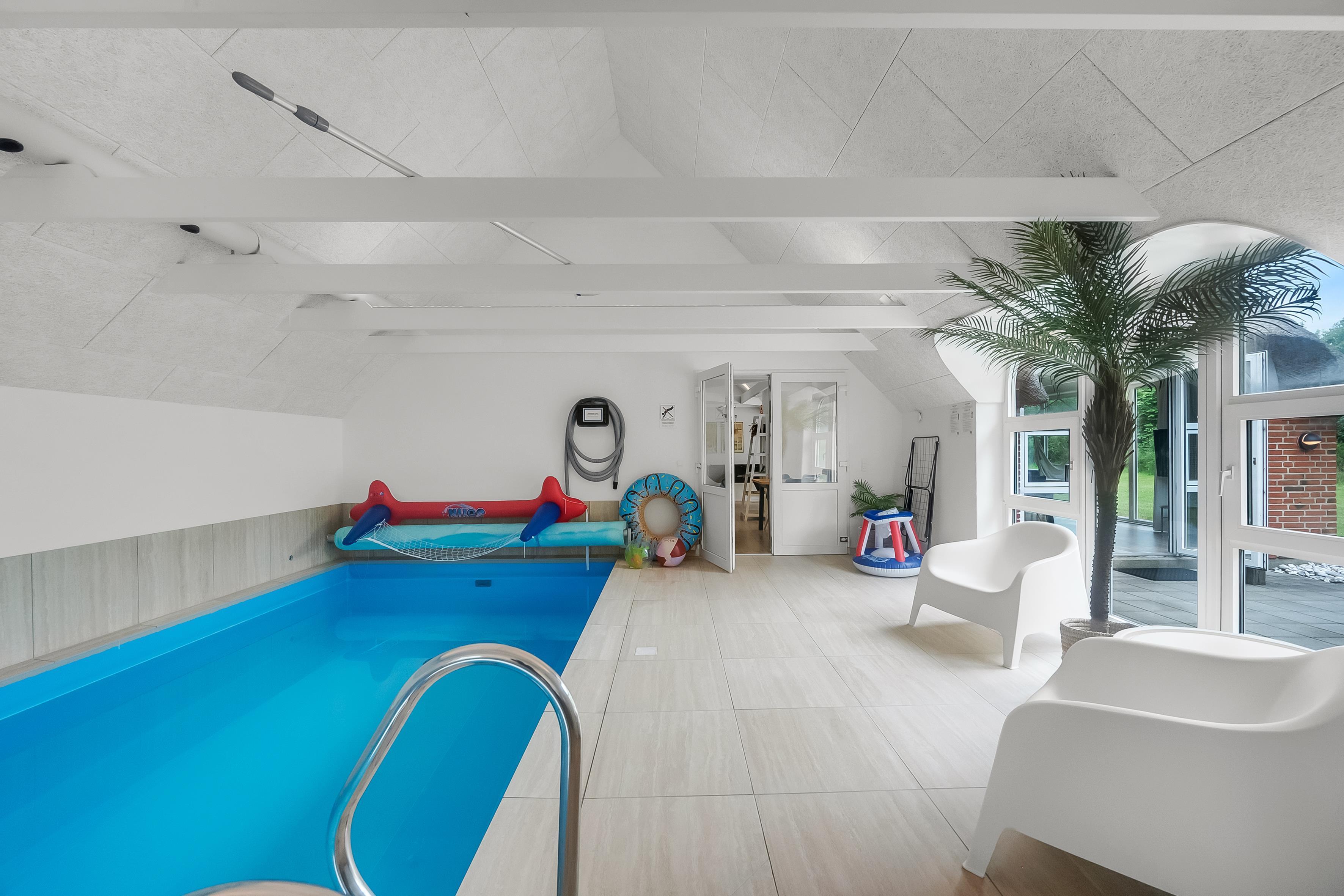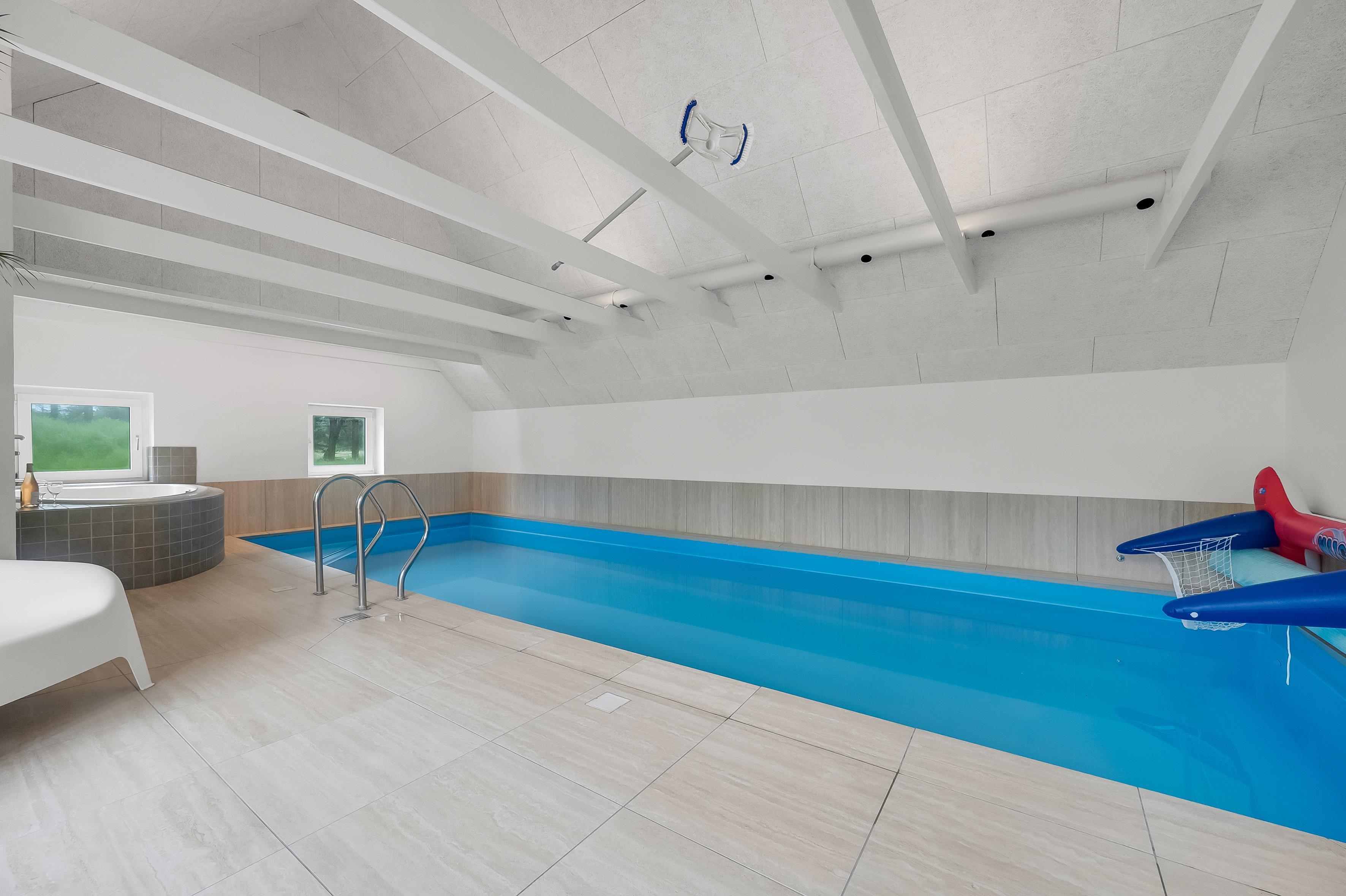 Poolafdelingen er et af ferieboligens højdepunkter. I kan svømme i den 30 kvadratmeter store pool med modstrømsanlæg, slappe af i spaen eller nyde varmen i saunaen. Poolområdet har adgang til et badeværelse, og der er yderligere tet nyrenoveret badeværelse i huset.