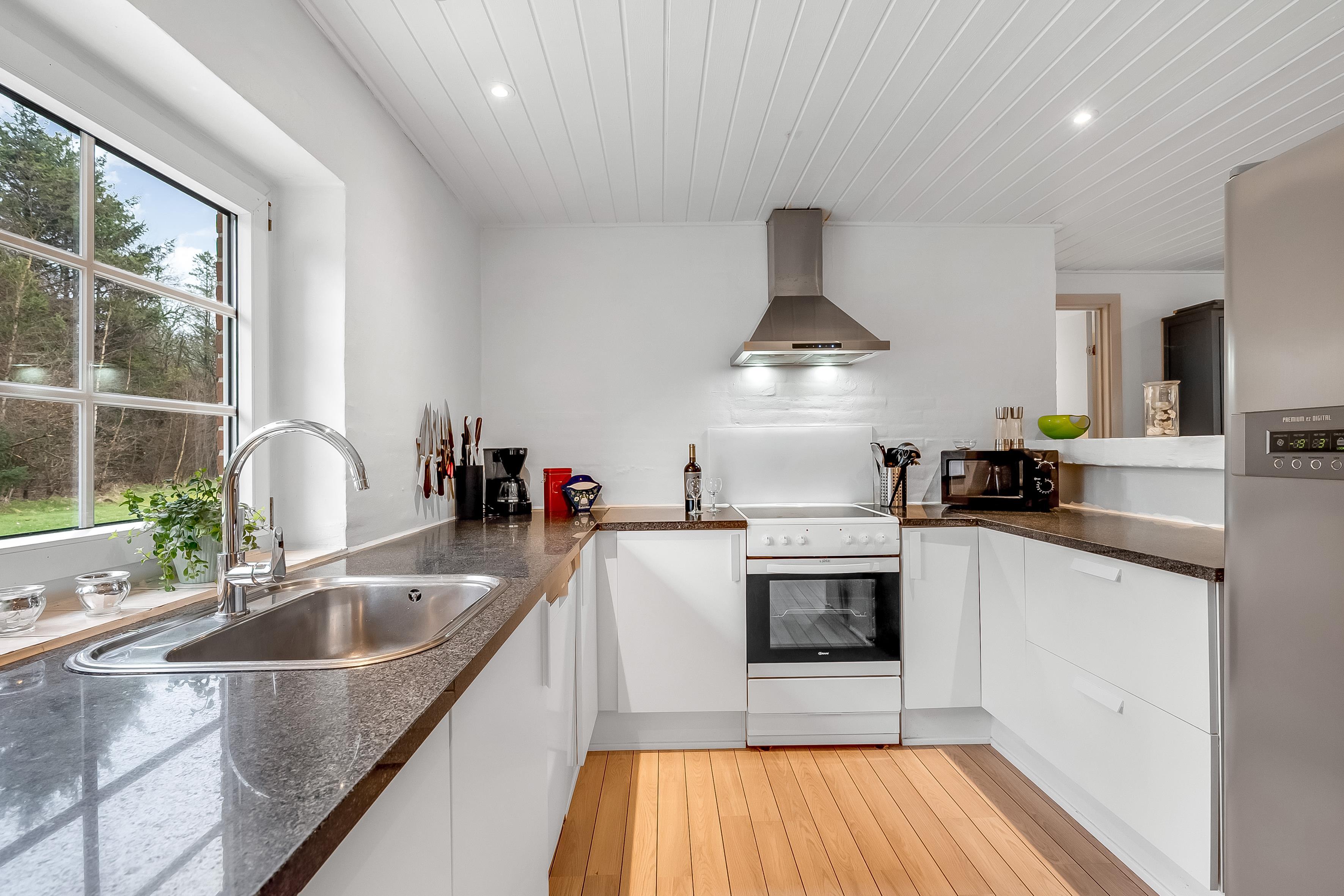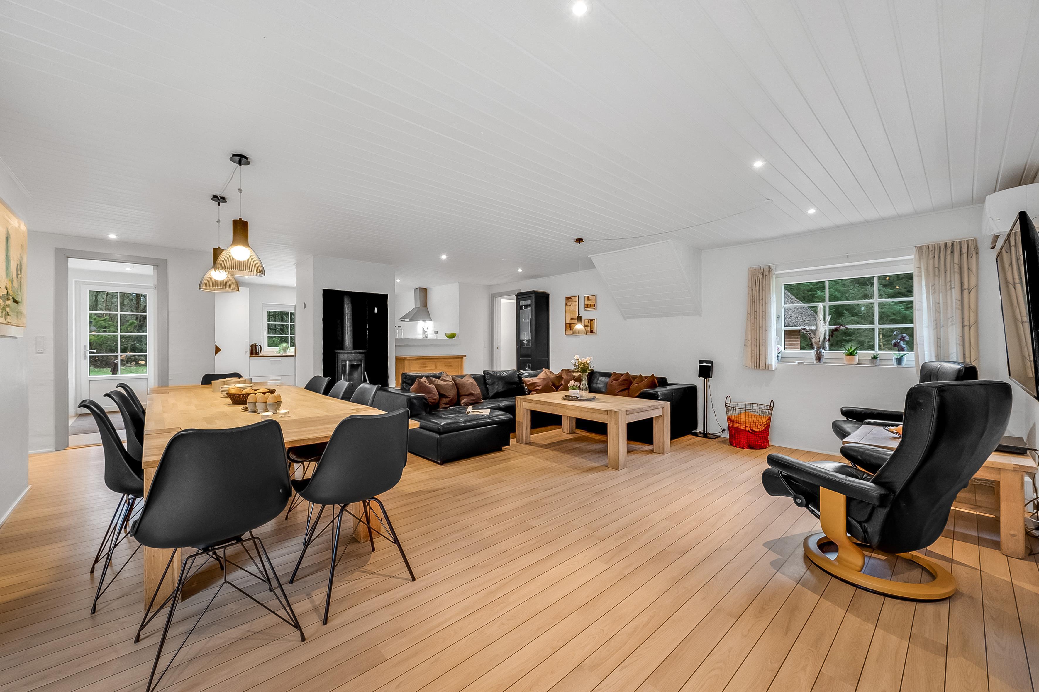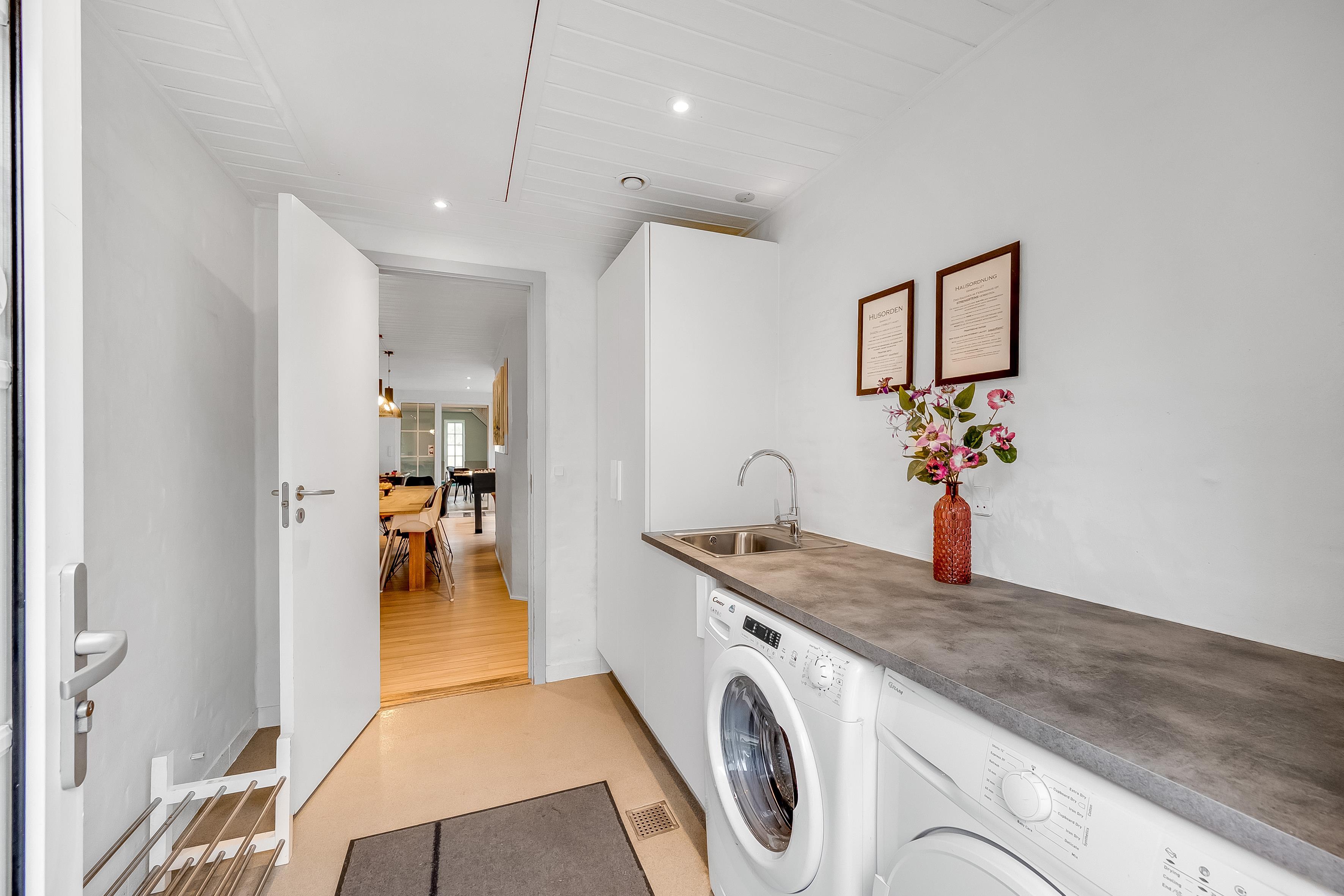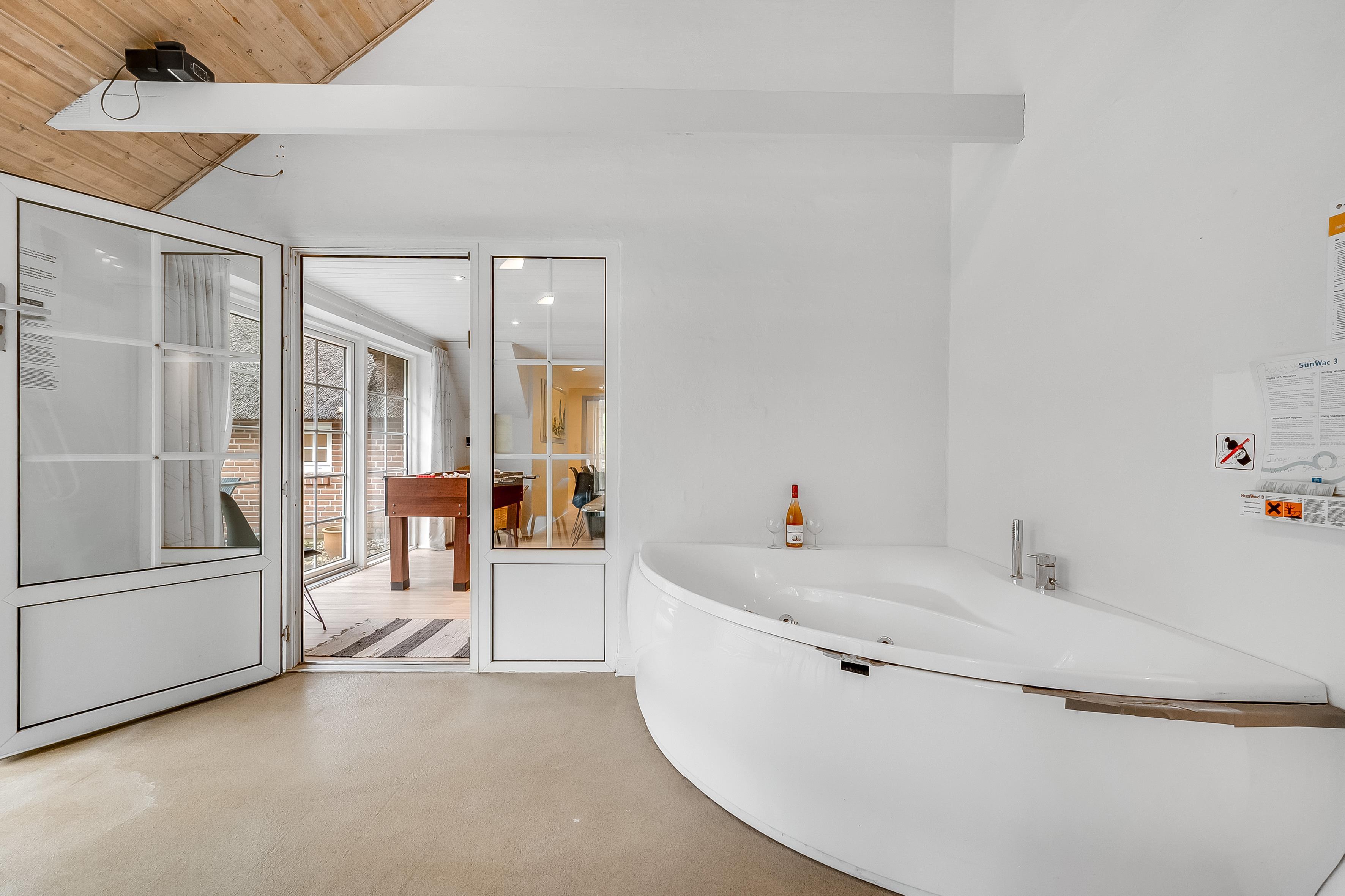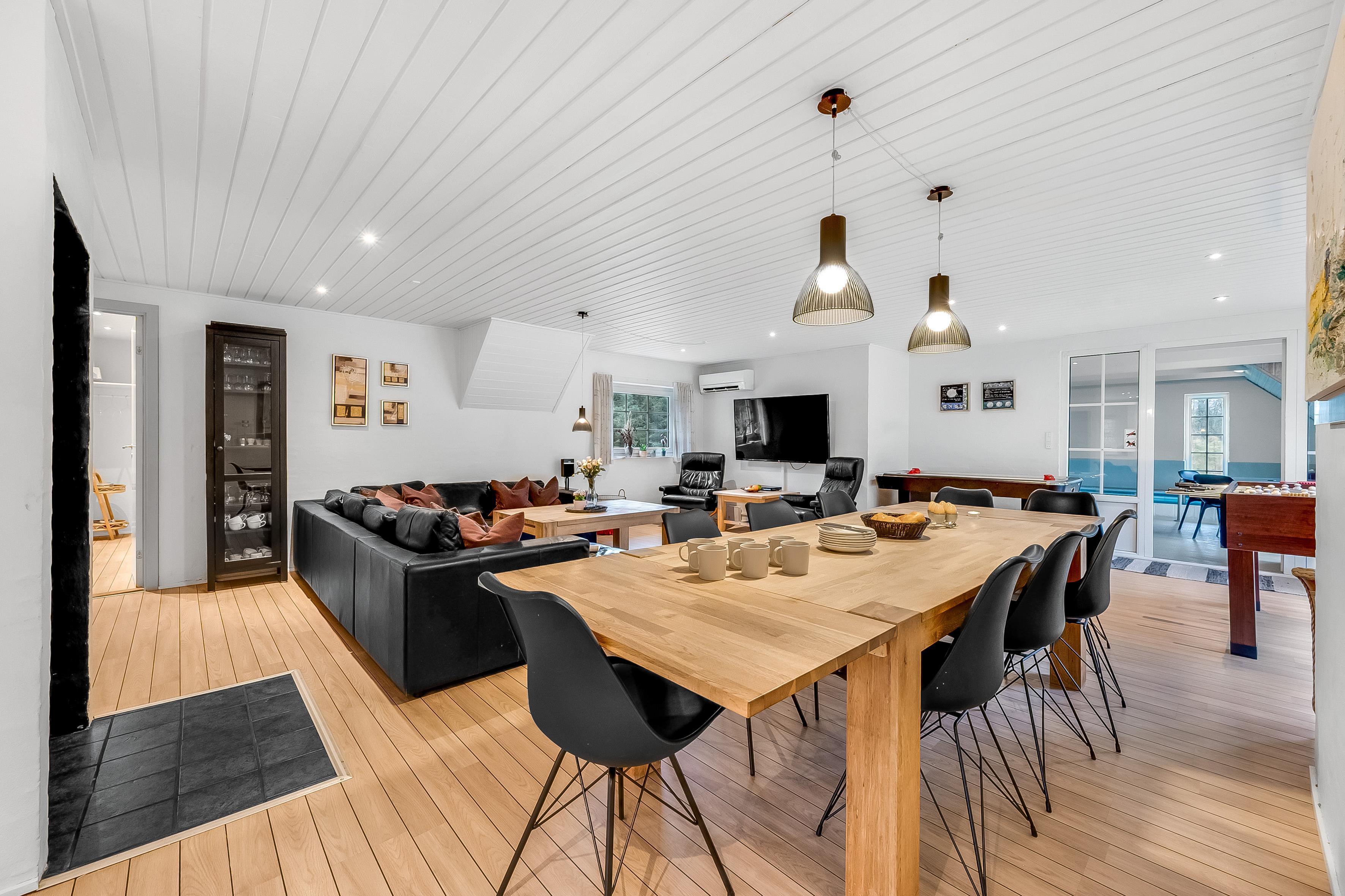 Huset byder på et lyst og rummeligt køkken-alrum, hvor du finder et veludstyret køkken med ovn, 4 keramiske kogeplader, mikrobølgeovn, opvaskemaskine, køleskab og 59 liters fryser. I stuen kan du slappe af i det dejlige sofaarrangement foran den store fladskærm med Chromecast, parabol og radio. Yderligere underholdning findes i stuen med et bordfodboldbord og air hockey,. Der er selvfølgelig også en stabil trådløs internetforbindelse i poolhuset.