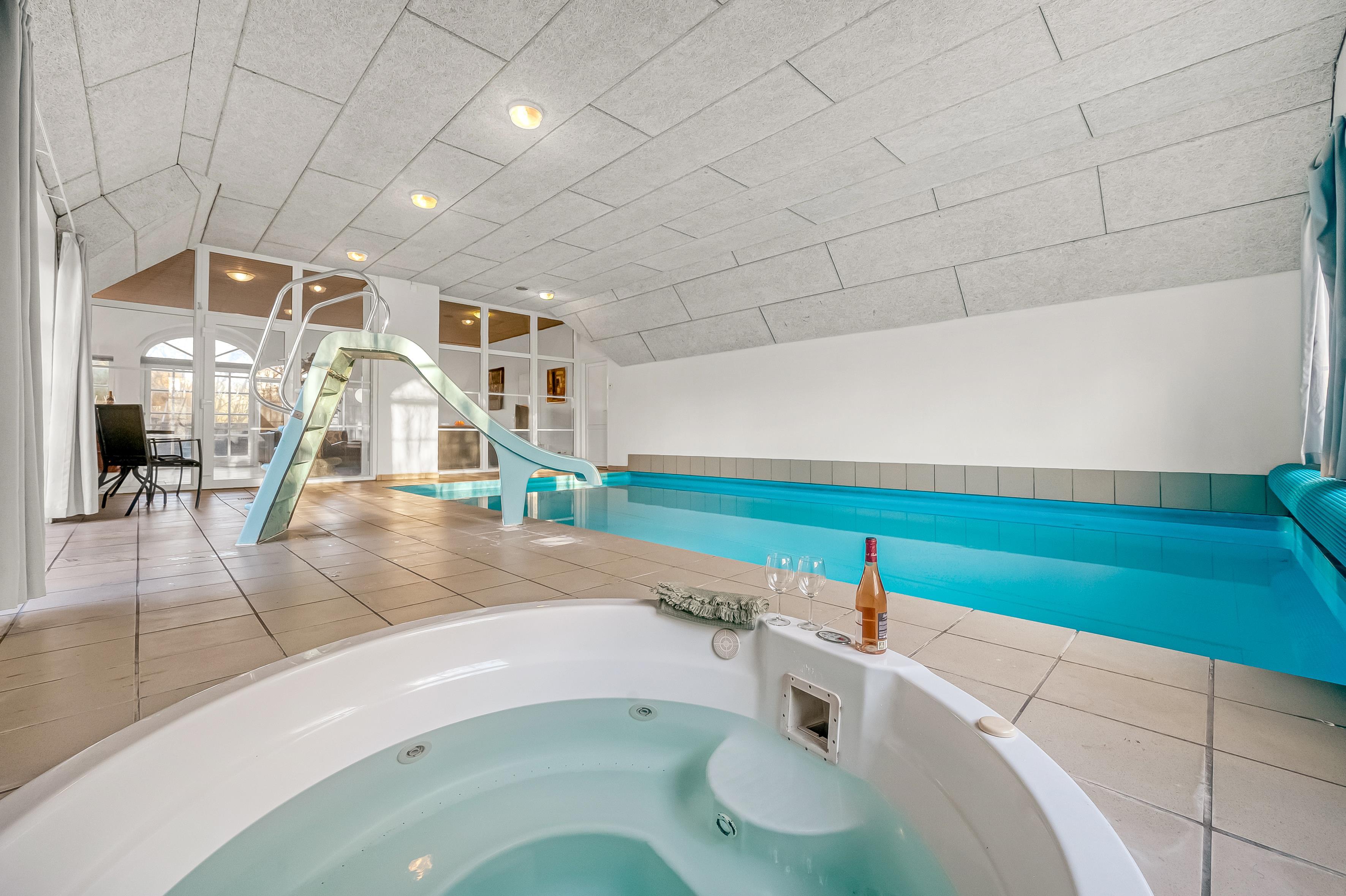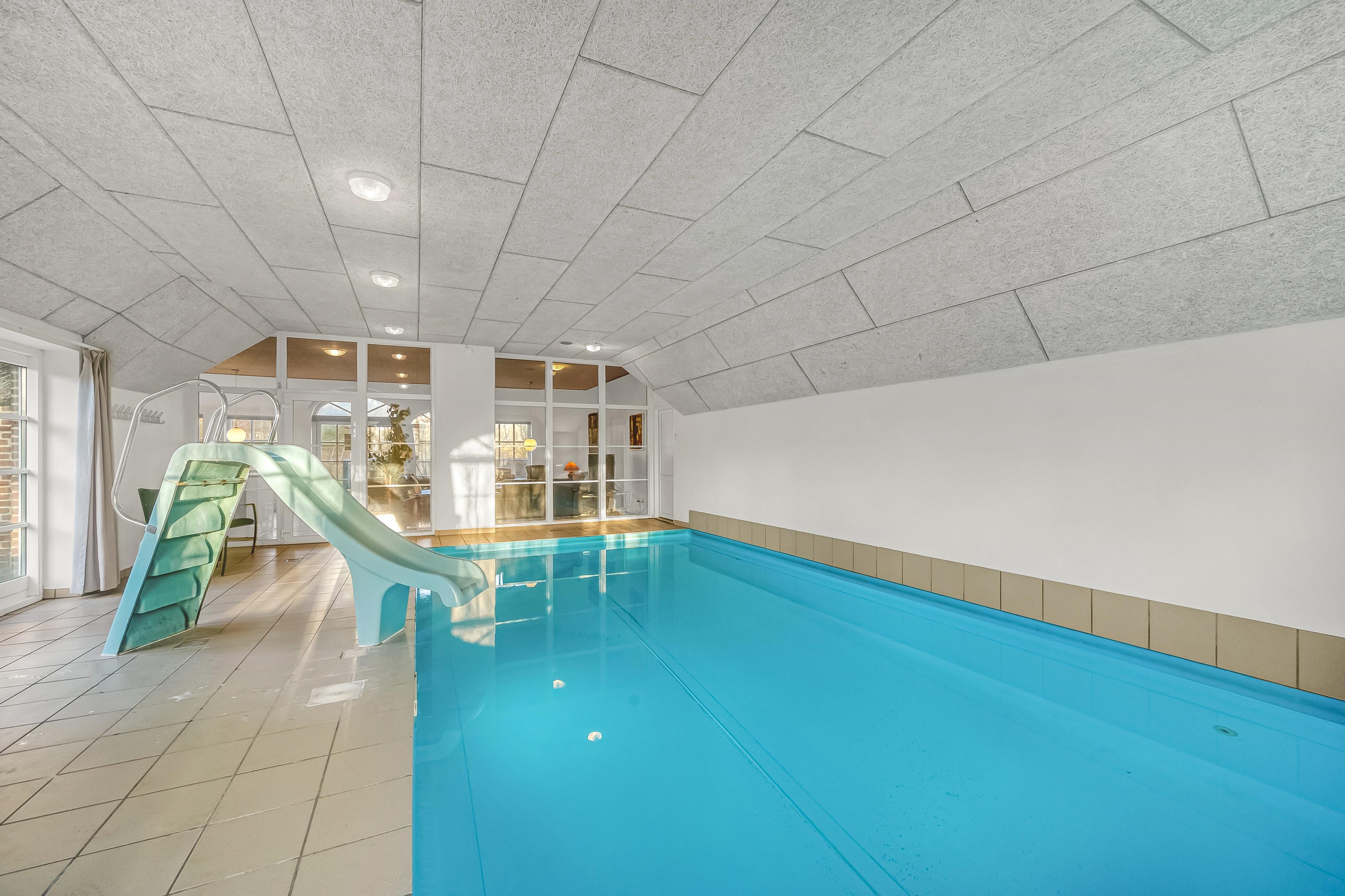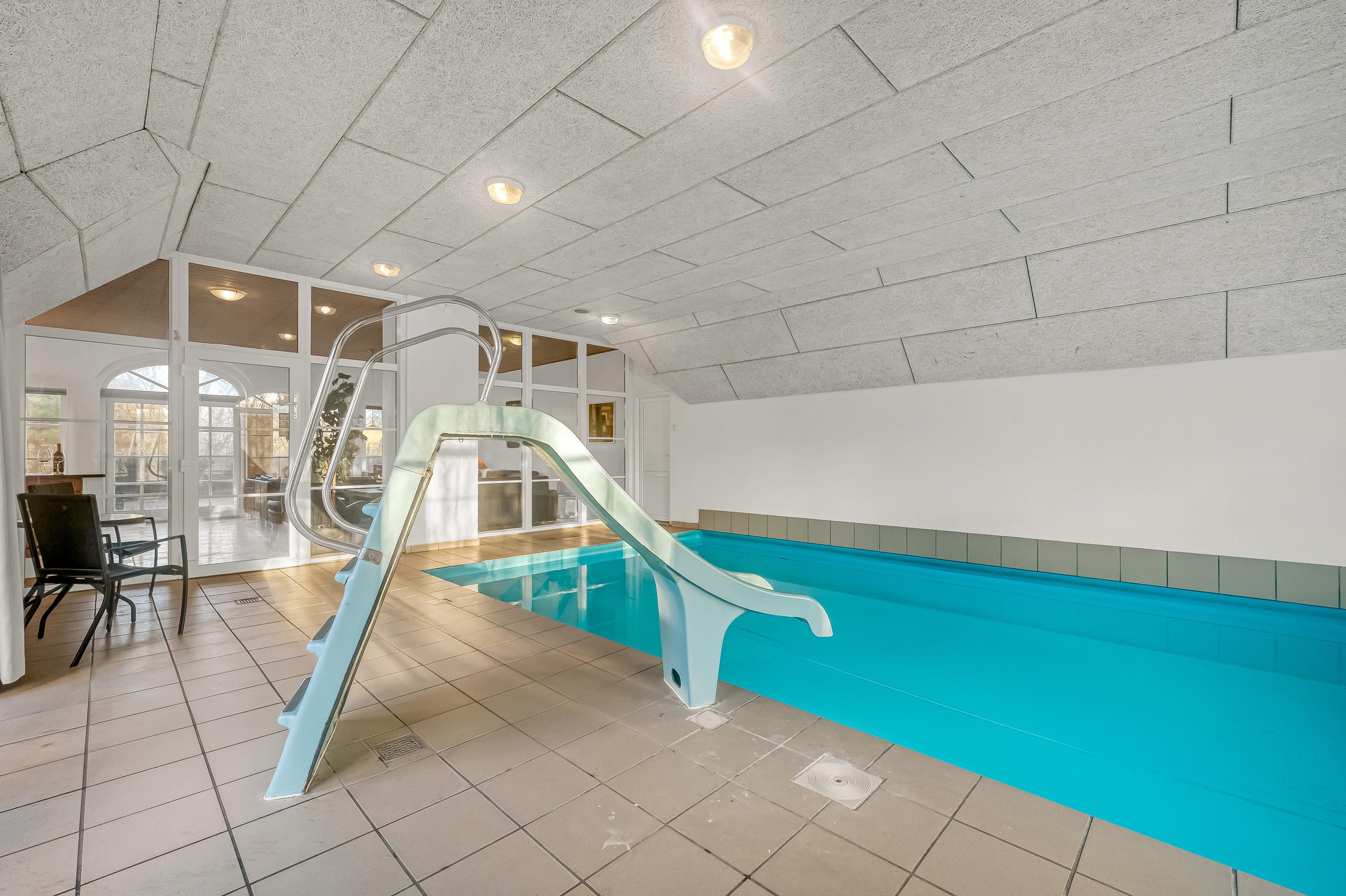 Hvis du ønsker at køle af, kan du tage et dyp i den private pool, som også har en vandrutsjebane – perfekt til både børn og voksne, der ønsker at have det sjovt. I poolrummet er der også et nedsænket spabad, der kan rumme op til 7 personer. Fra det ene badeværelse, som ligger i forbindelse med poolrummet, er der adgang til en en infrarød sauna, hvor du kan slappe af efter en lang dag med aktiviteter.