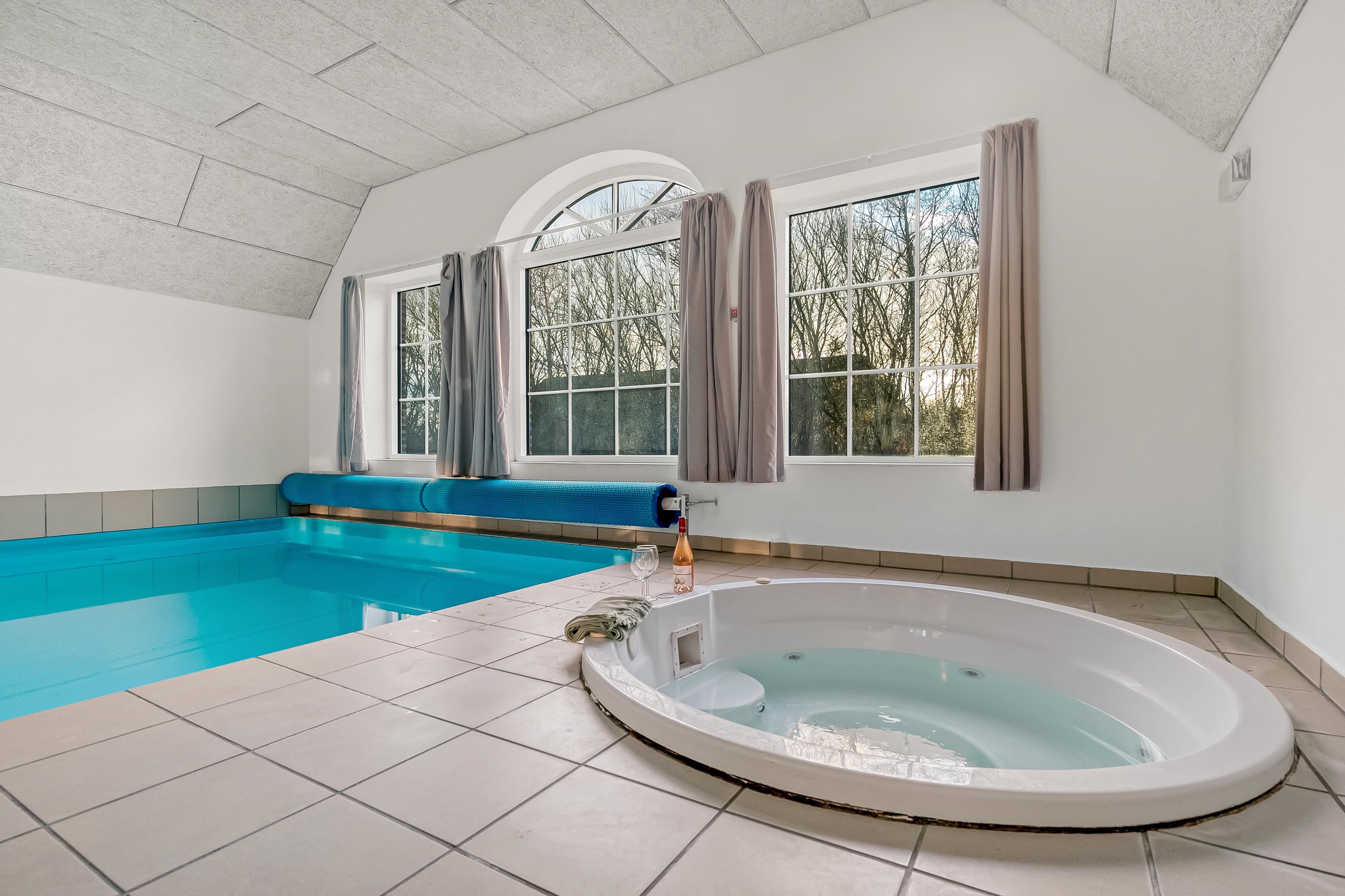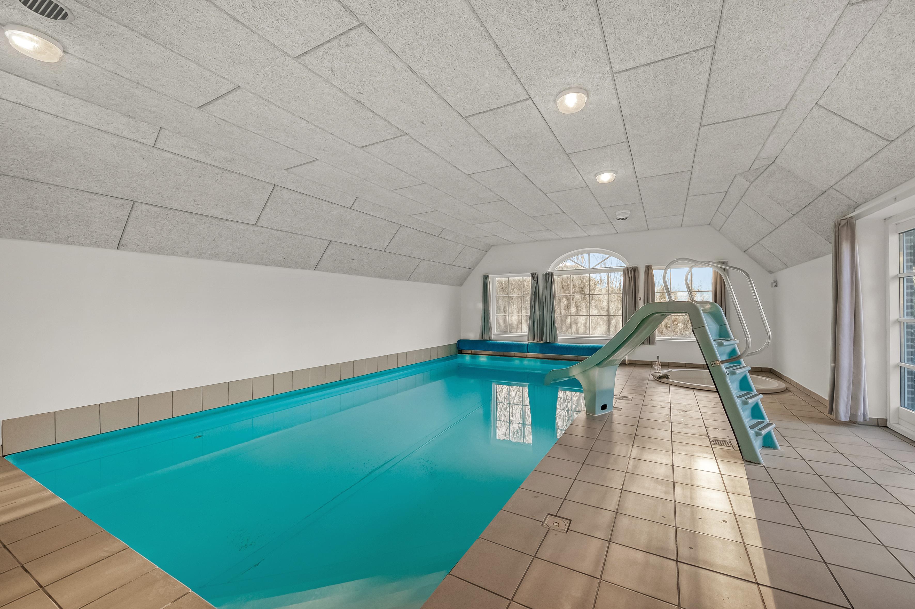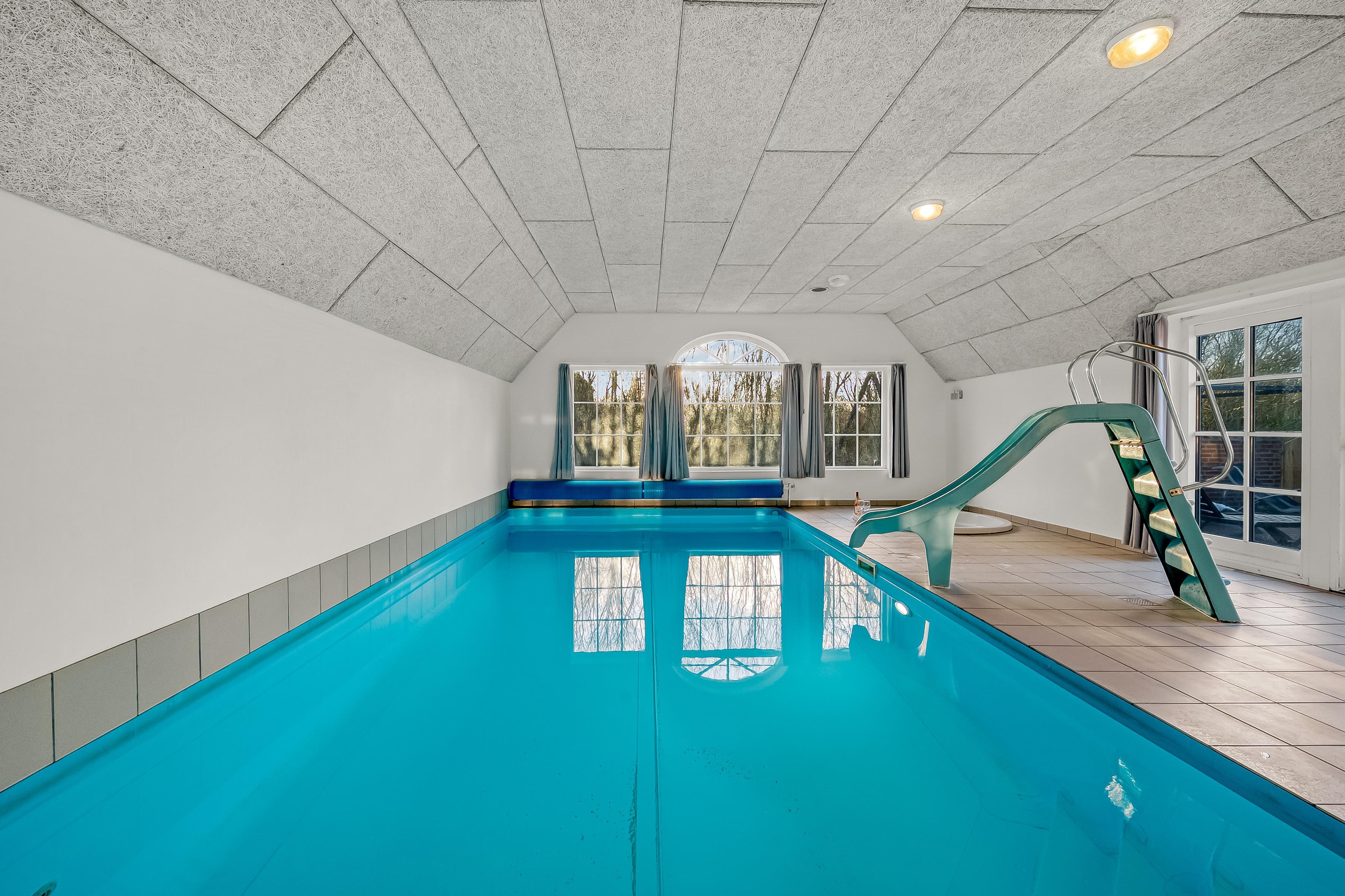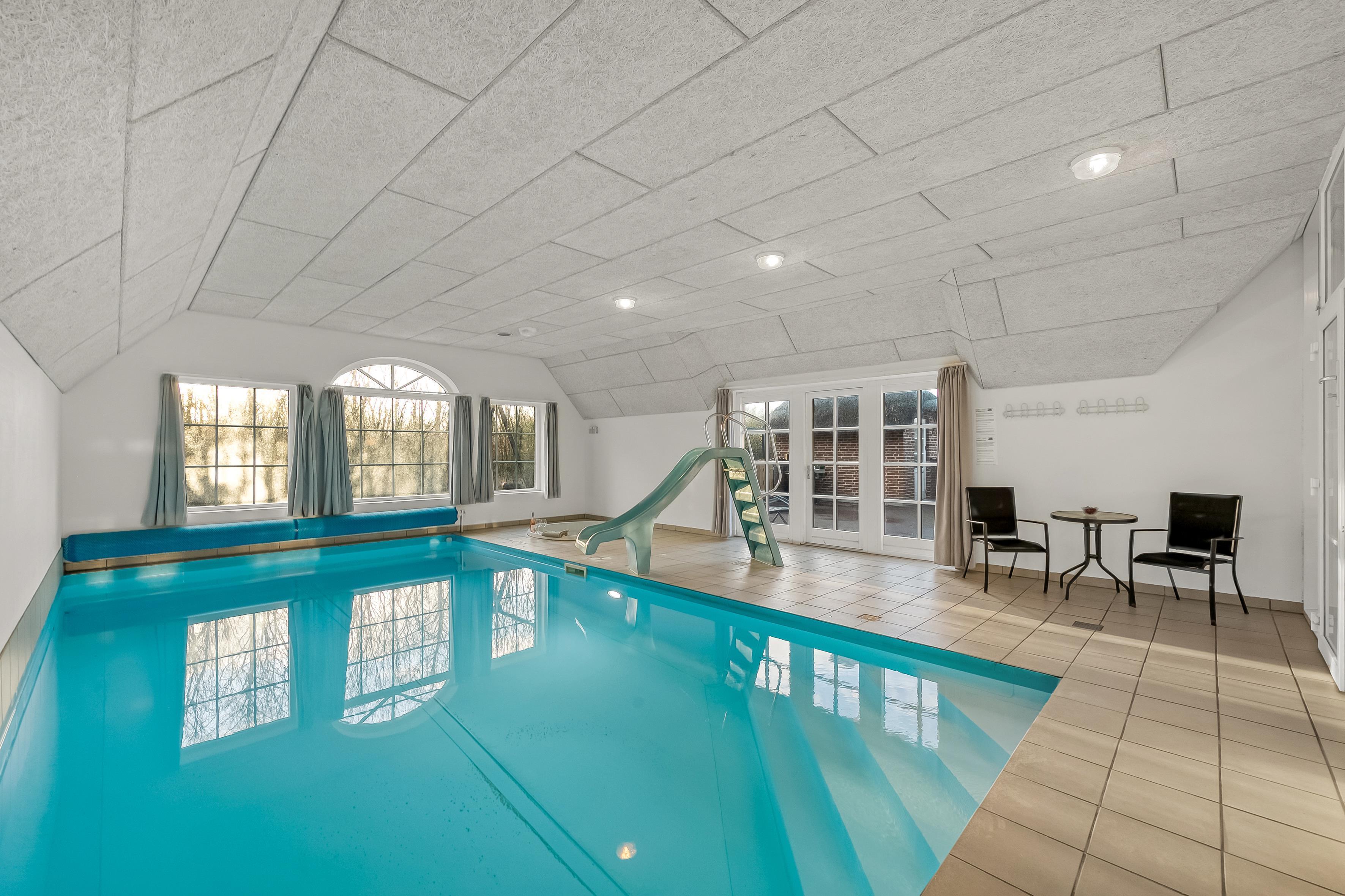 Hvis du ønsker at køle af, kan du tage et dyp i den private pool, som også har en vandrutsjebane – perfekt til både børn og voksne, der ønsker at have det sjovt. I poolrummet er der også et nedsænket spabad, der kan rumme op til 7 personer. Fra det ene badeværelse, som ligger i forbindelse med poolrummet, er der adgang til en en infrarød sauna, hvor du kan slappe af efter en lang dag med aktiviteter.