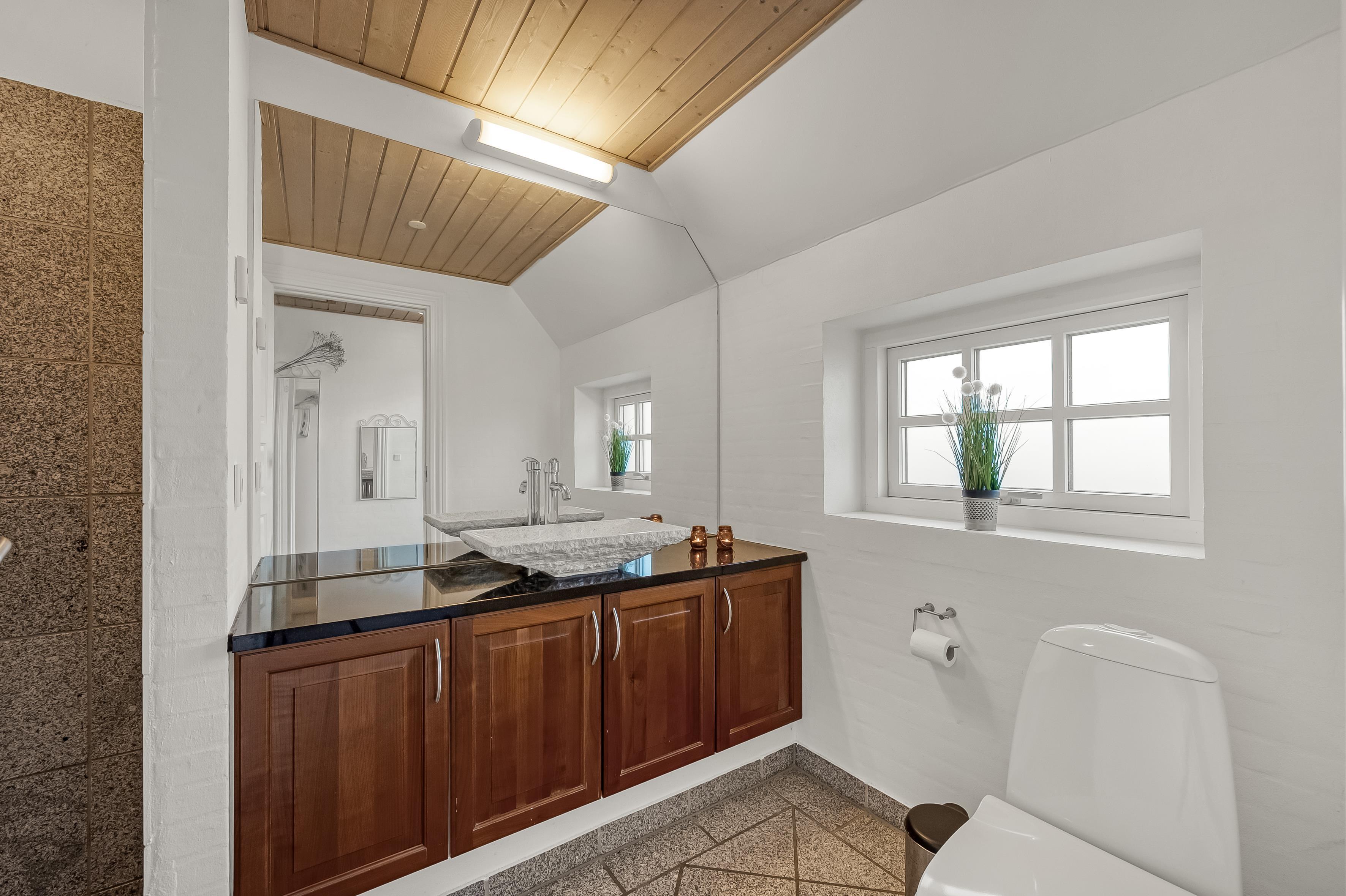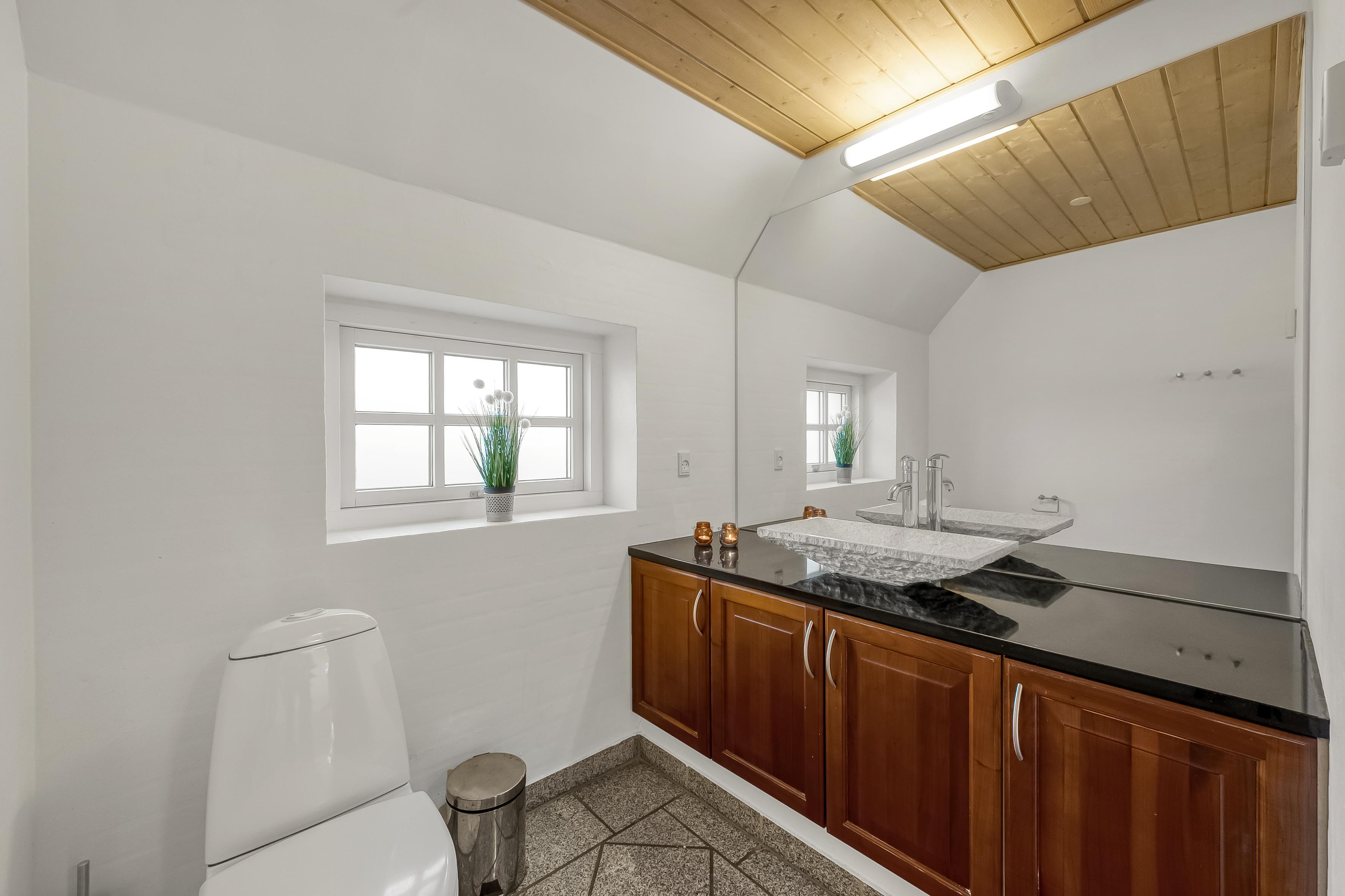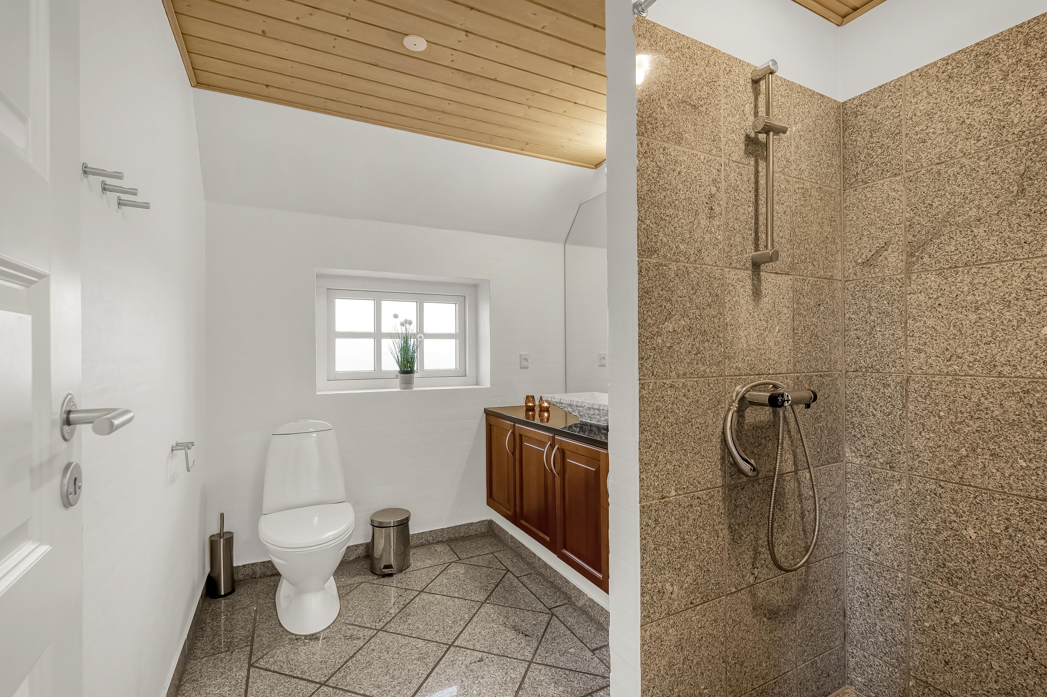 Huset har tre stilfulde badeværelser, hver udstyret med toilet og bruser, hvilket sikrer, at alle får en god start på dagen. De moderne badeværelser har også gulvvarme, så du kan nyde en varm og behagelig atmosfære, selv på de koldere dage.