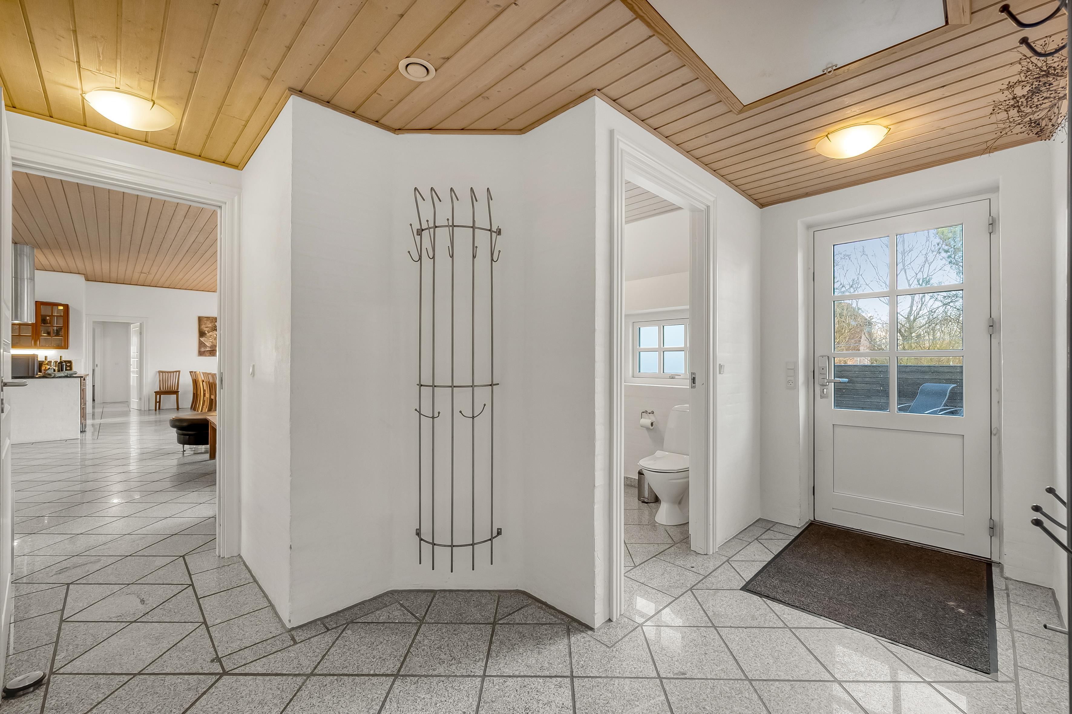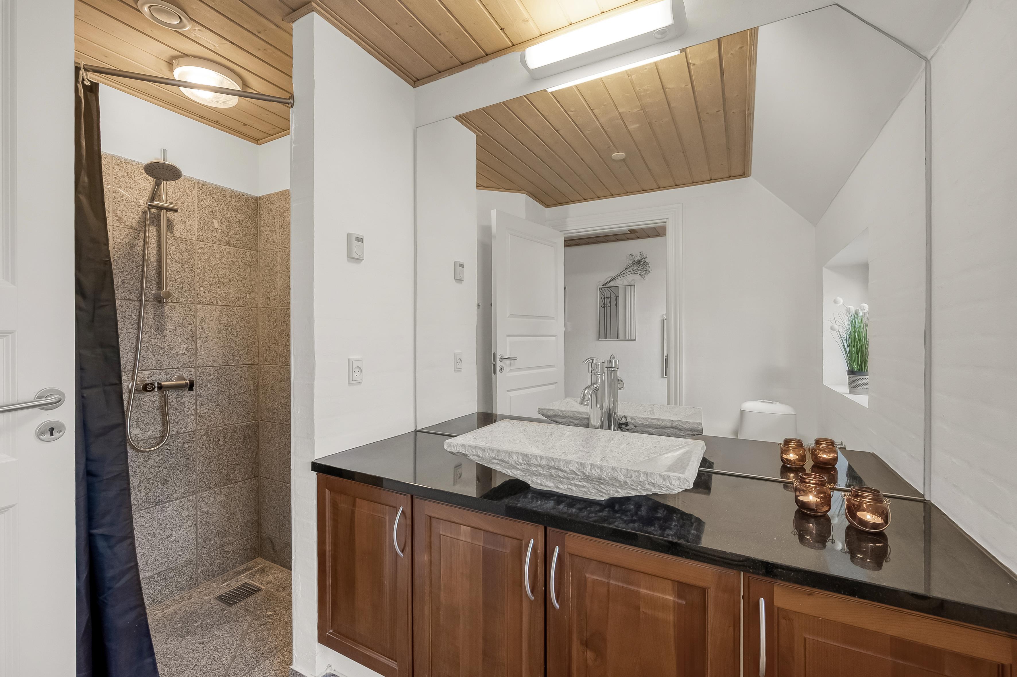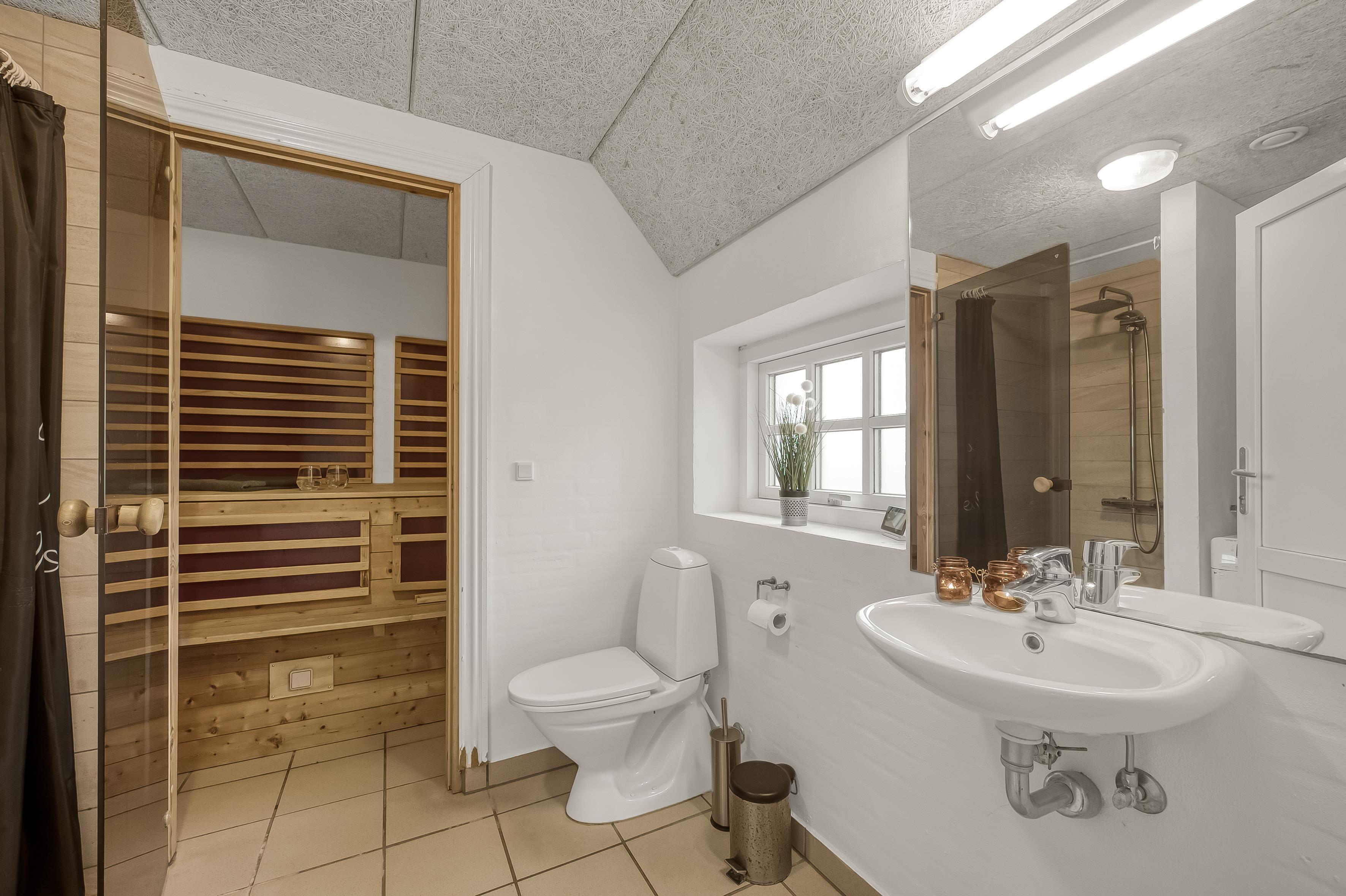 Huset har tre stilfulde badeværelser, hver udstyret med toilet og bruser, hvilket sikrer, at alle får en god start på dagen. De moderne badeværelser har også gulvvarme, så du kan nyde en varm og behagelig atmosfære, selv på de koldere dage.