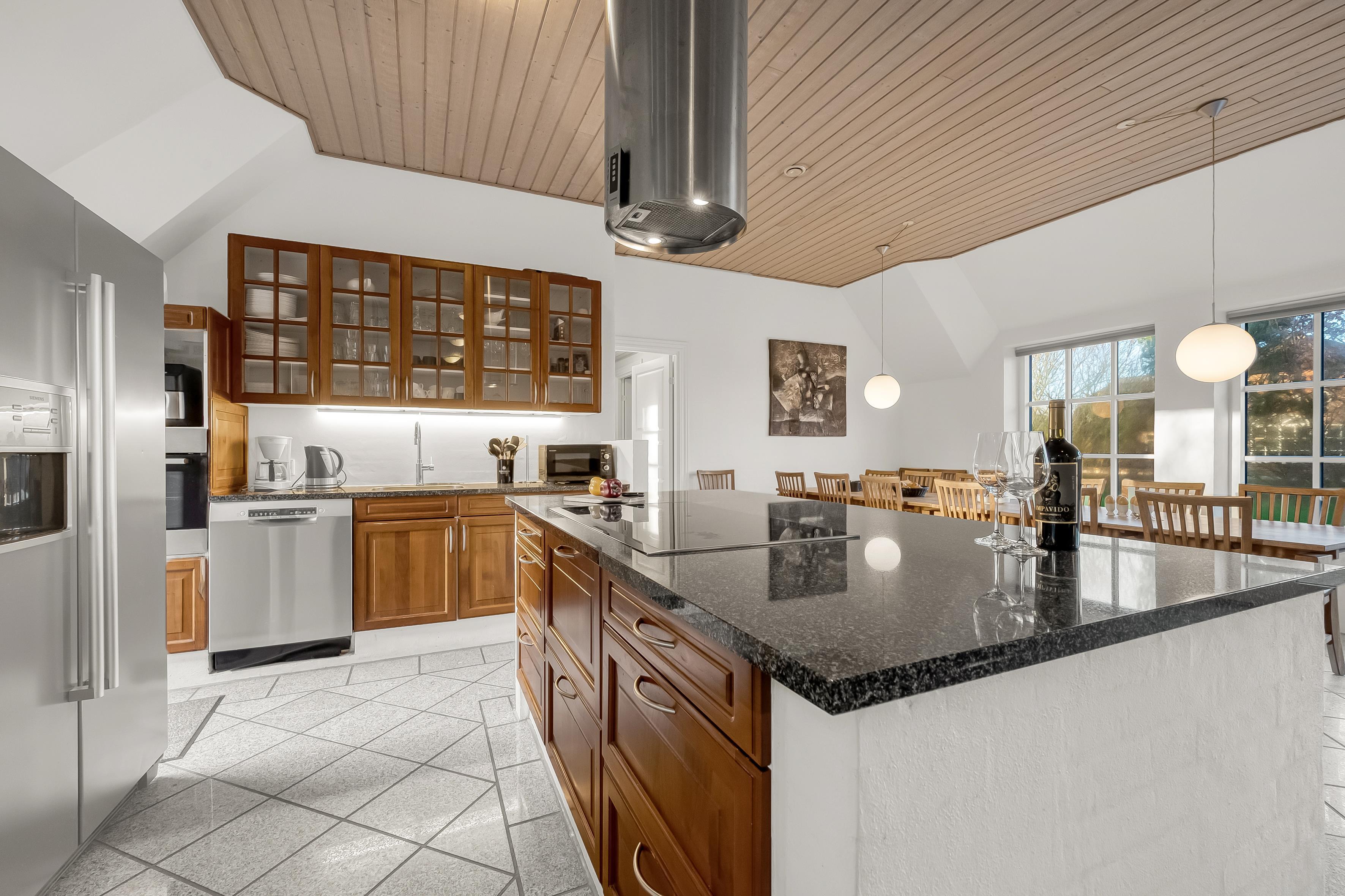 For dem, der elsker at lave mad, er køkkenet udstyret med alle nødvendige apparater, herunder en mikrobølgeovn, ovn, keramisk komfur, opvaskemaskine og et vinkøleskab, så du kan opbevare dine yndlingsvine. Der er også en fryser med plads til 80 liter, hvilket giver dig mulighed for at opbevare madvarer til hele opholdet. Den åbne spiseplads og stue med brændeovn skaber en hyggelig atmosfære, perfekt til at samles omkring måltider eller spille brætspil om aftenen.