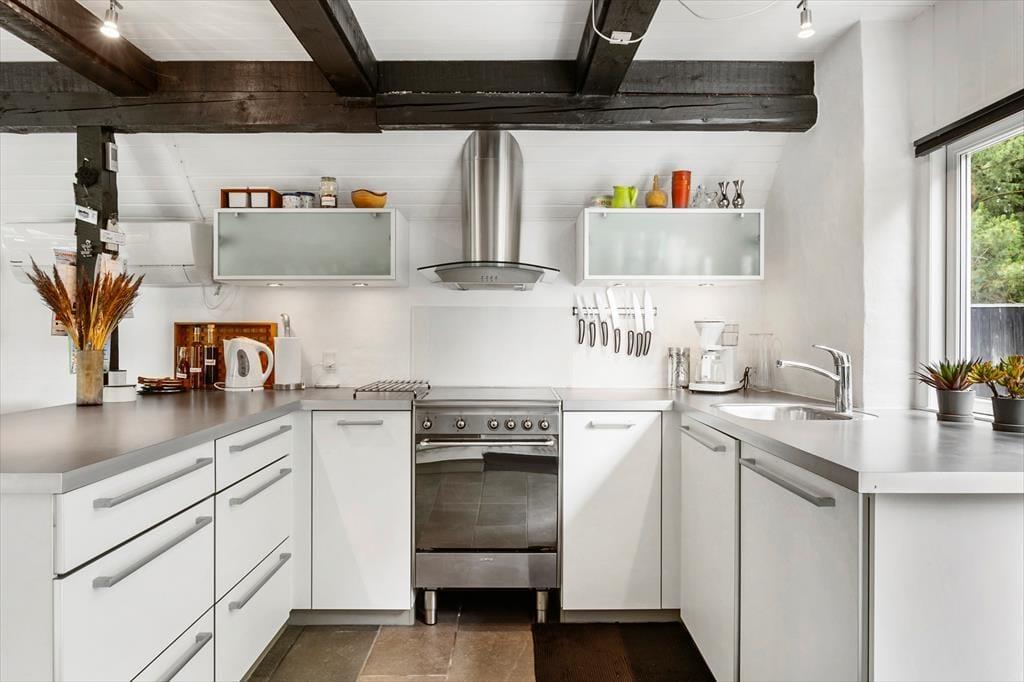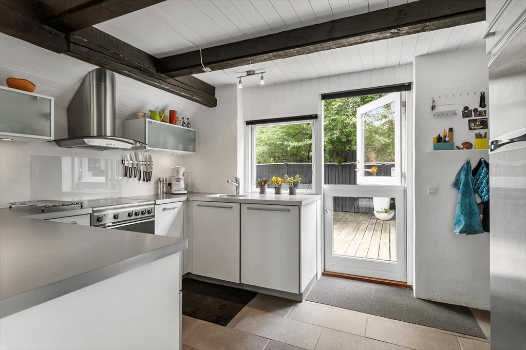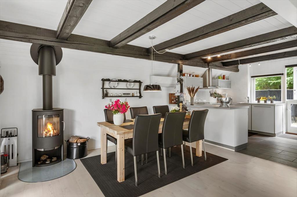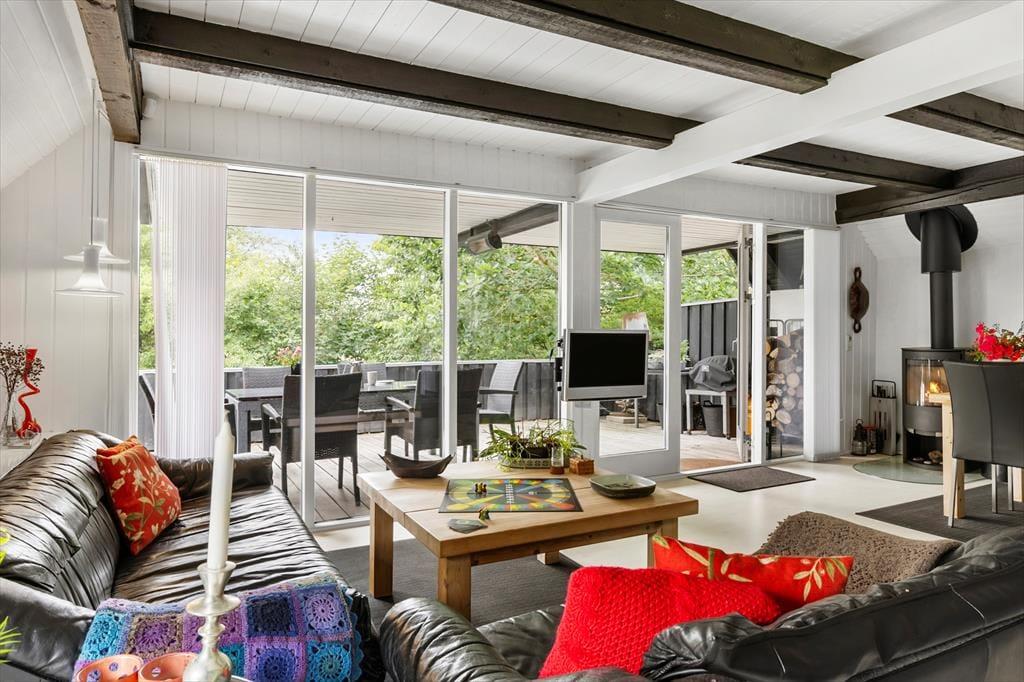 Så snart du træder indenfor, breder feriefornemmelsen sig i kroppen. Sommerhuset er lyst og indbydende med en varm og personlig stemning, der inviterer dig til at sænke skuldrene og nyde fridagene i fulde drag. Stuen danner hjertet i huset med sin åbne forbindelse til køkkenet, og her står en brændeovn klar til at skabe hygge og varme, når aftenen falder på. Det er nemt at forestille sig, hvordan I samles her efter en lang dag ved fjorden – med duften af kaffe i næsen, kortspil på bordet og ildens knitren i baggrunden. Ovenpå venter en lille altan, hvor du kan starte morgenen med udsigt til haven og fuglekvidder i trætoppene. Hele huset er enkelt og smagfuldt indrettet, så du hurtigt føler dig hjemme og kan nyde din ferie uden forstyrrelser.