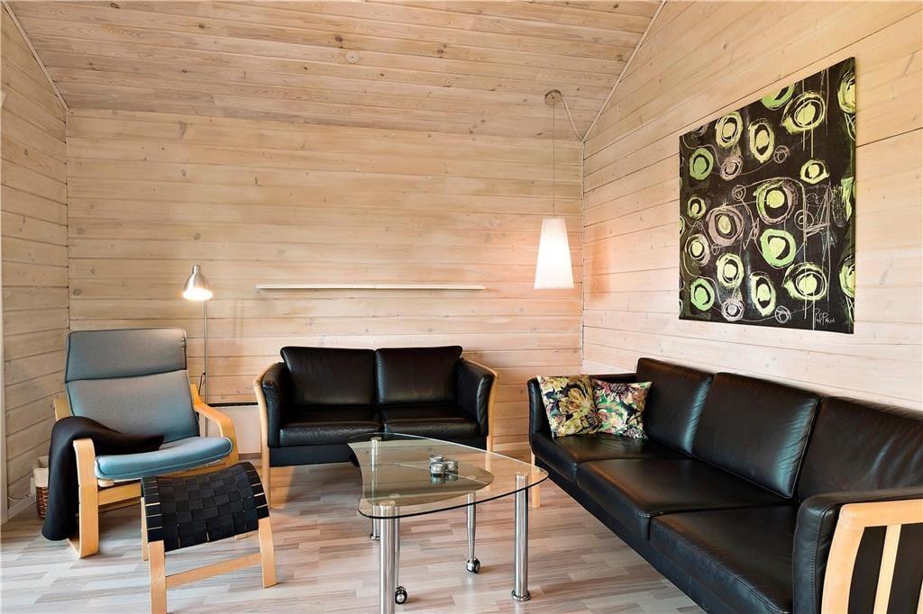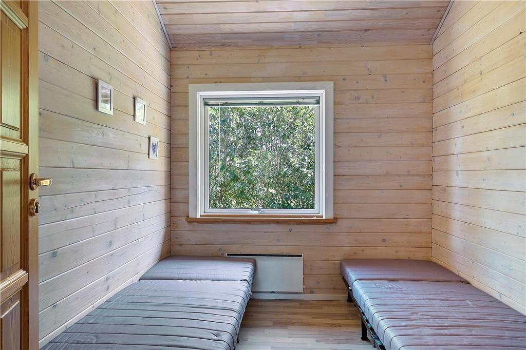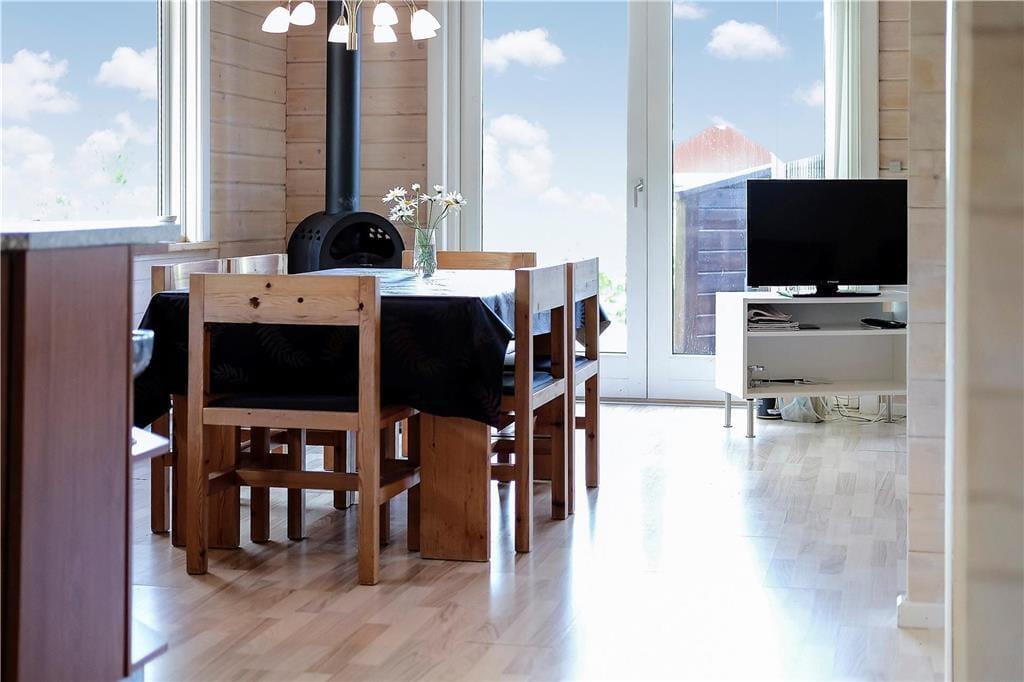 Sommerhuset, der er opført i 2005, har en rigtig hyggelig atmosfære med lys træbeklædning på væggene og loft til kip. Planløsningen gør det muligt at være op til otte personer, for der er tre soveværelser til rådighed plus en god hems med ekstra madrasser. Badeværelset er stort og udstyret med både spabad og sauna, og i stuen er et lækkert køkken integreret i rummet. Det gør det nemt at smutte hen for at hente mere kaffe og snacks, når I spiller brætspil ved spisebordet eller flader ud i sofaafdelingen med en god film. En brændeovn står i hjørnet af stuen, og de to store havedøre skaber en god forbindelse til den delvist overdækkede terrasse.