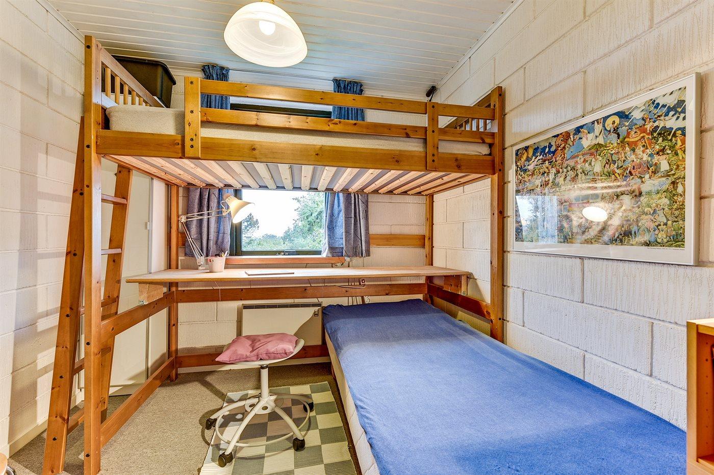 Der er i alt 3 soveværelser. Sovepladserne fordeler sig på: 2 sovepladser i dobbeltseng. 3 sovepladser i enkeltsenge.1 soveplads i køjeseng. Derudover er der 1 stk. barneseng.
