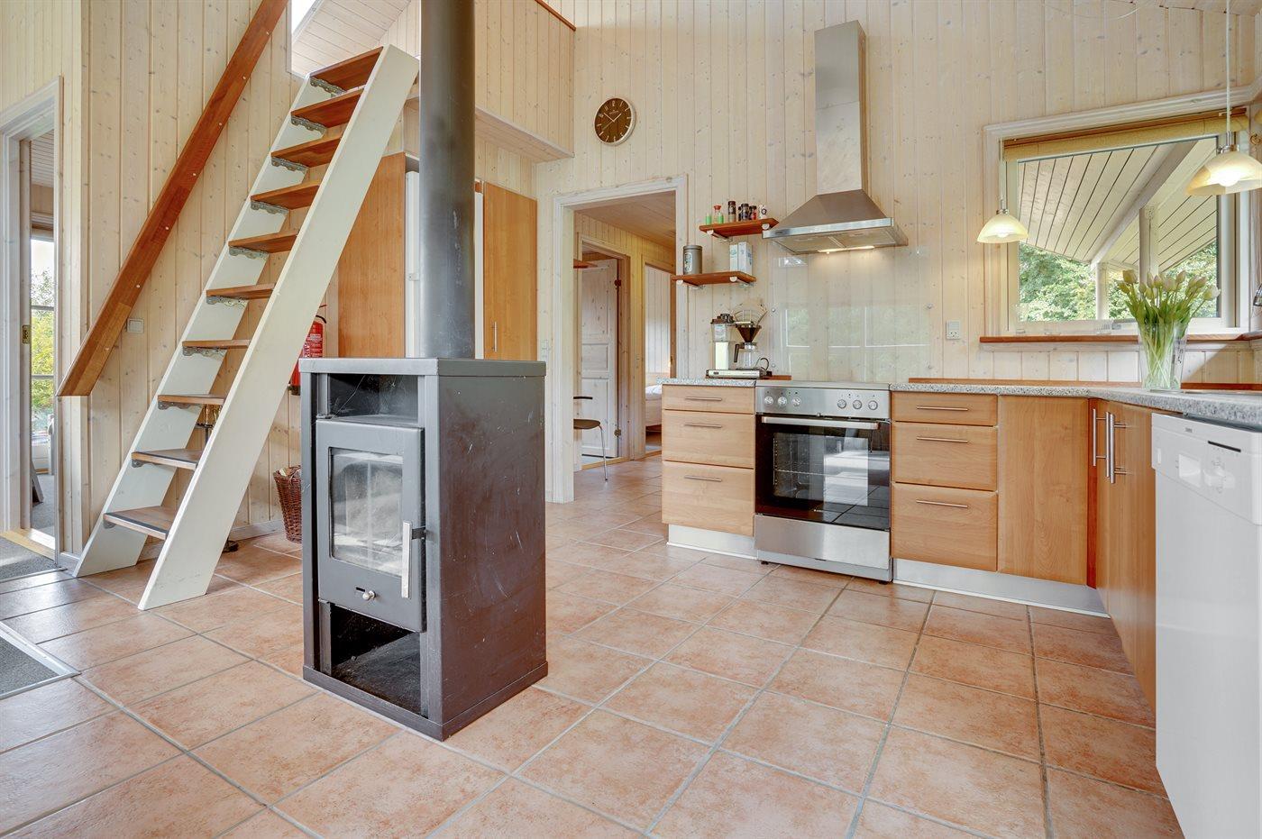 Køkkenet er udstyret med 1 køleskab. Der er 4 keramiske kogeplader, varmluftovn samt opvaskemaskine.