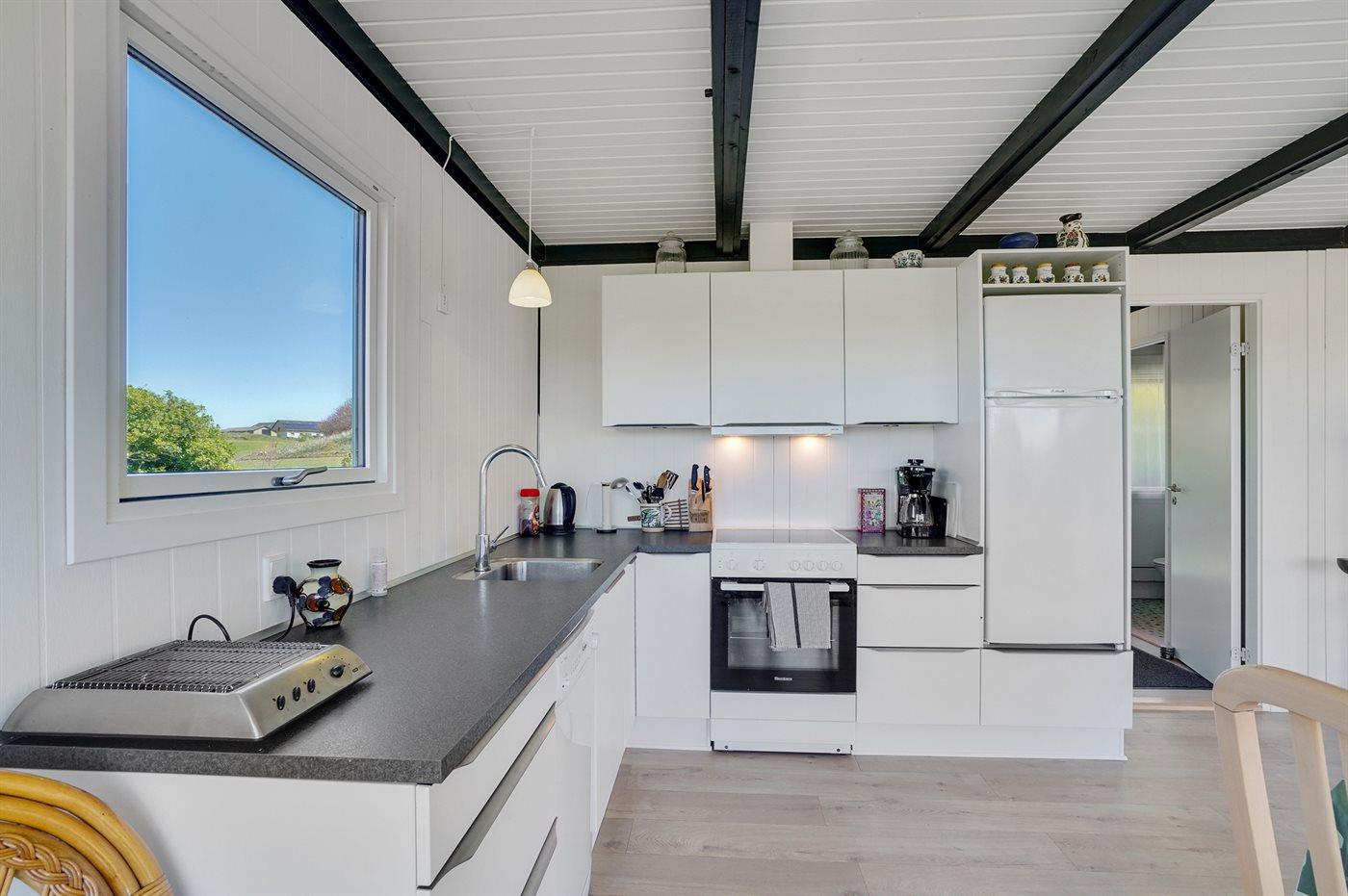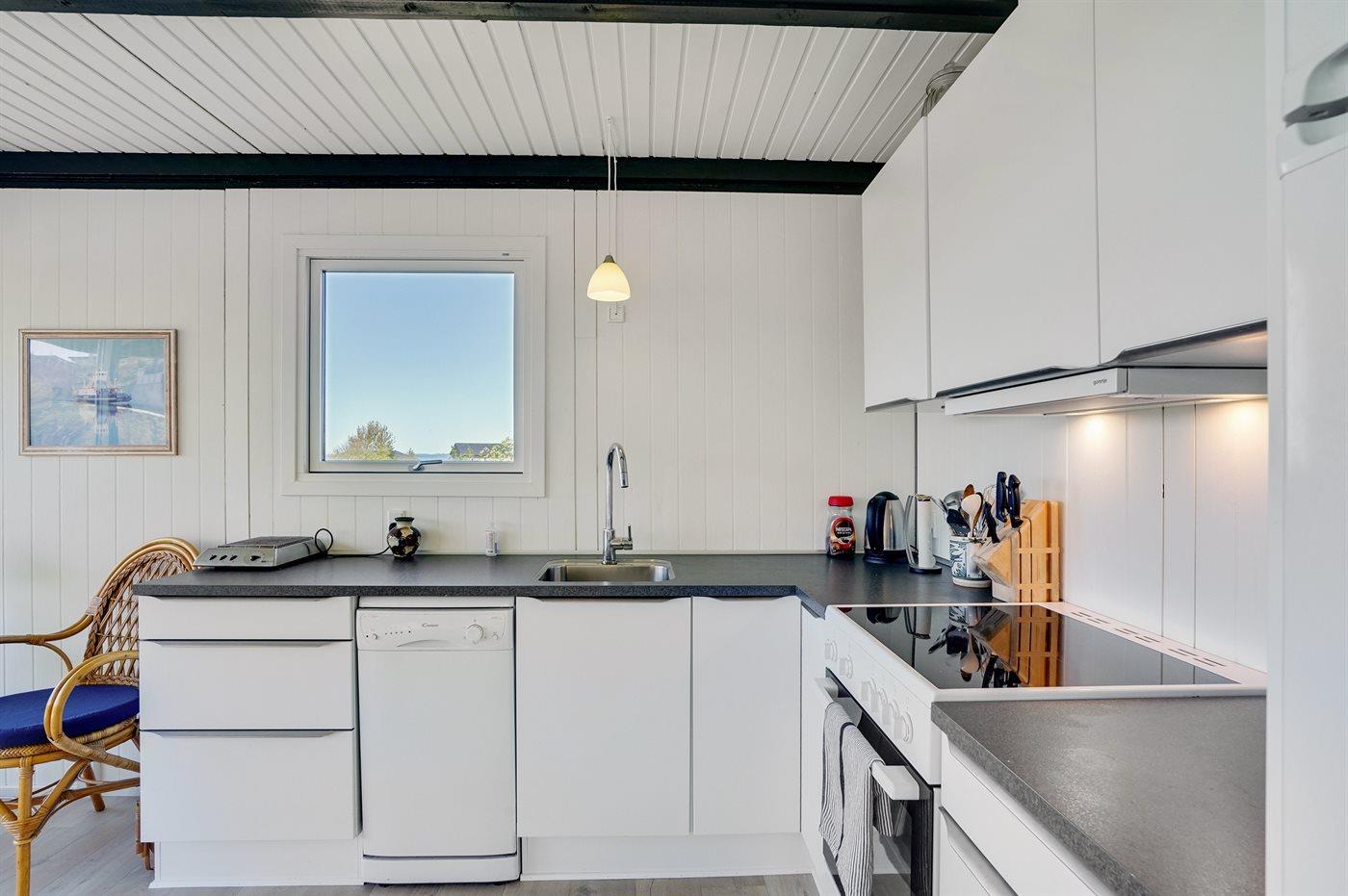 Køkkenet er udstyret med 1 køleskab. Der er 4 keramiske kogeplader, varmluftovn samt opvaskemaskine.
