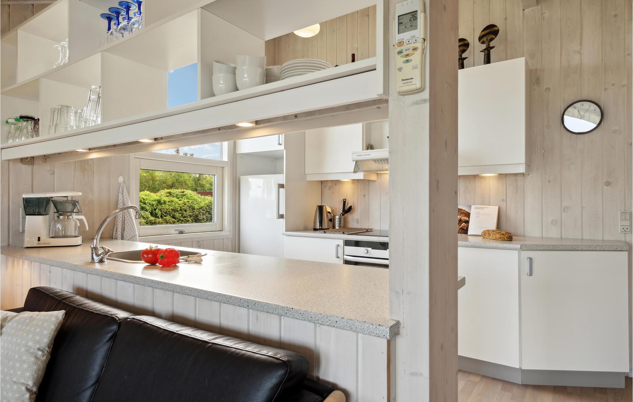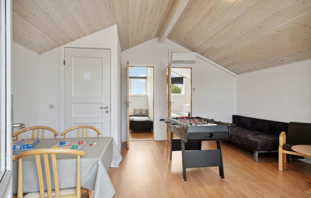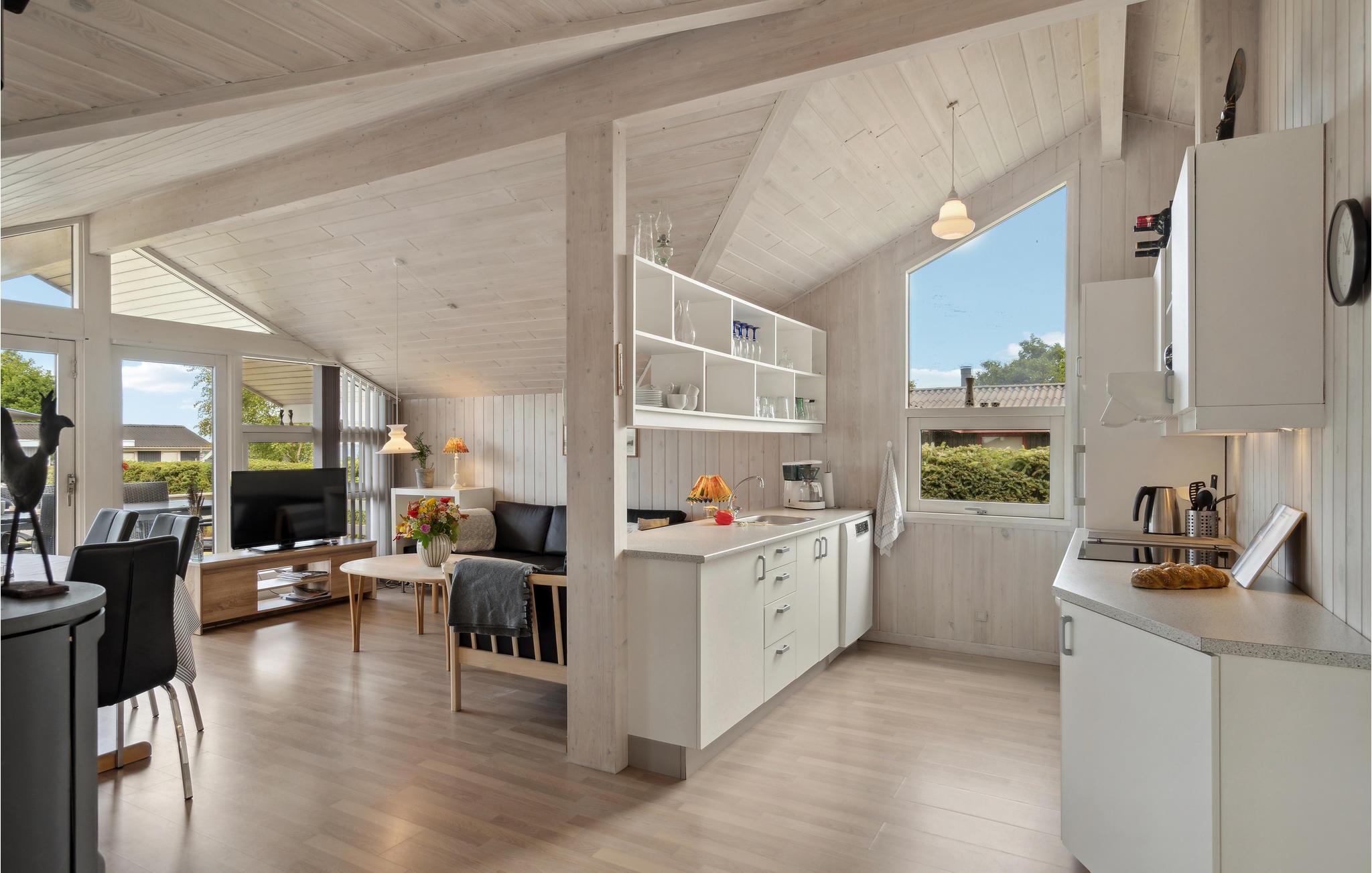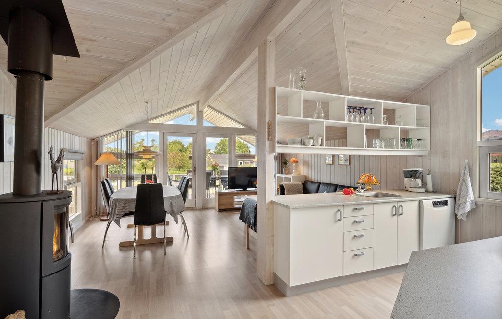 Velkommen til dette indbydende feriehus, som tilbyder de ideelle betingelser for en oplevelsesrig ferie med skønne naturture og afslapning på stranden for hele familien. De lyse rum med høje lofter og moderne stil udstråler klassisk sommerhuscharme. Stuen med spiseplads og åbent køkken bliver lyst op af det store vinduesparti, og brændeovnen spreder en dejlig varme på kølige dage. Her kan I starte dagen med morgenmadshygge eller en lækker brunch. Senere kan I dyste i ludo eller bordfodbold. Slap af på terrassen med kig til fjorden, tænd op i grillen eller gå i gang med den spændende bog, I endnu ikke har haft tid til at læse. Hvem mon kan hoppe højest på trampolinen? Gå til fjorden, som indbyder til badesjov og lange gåture. Her er i øvrigt hele tre surfpladser.
