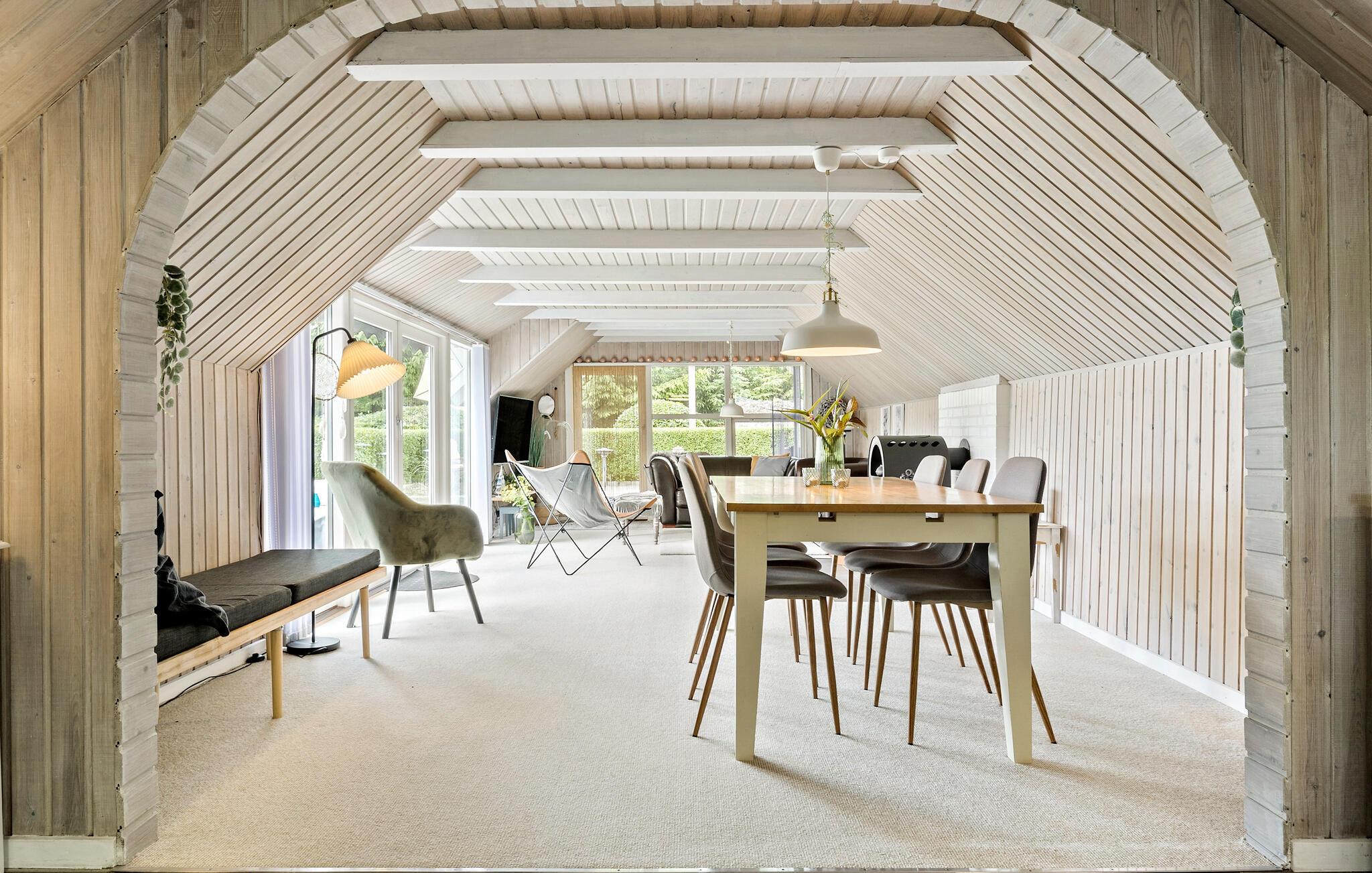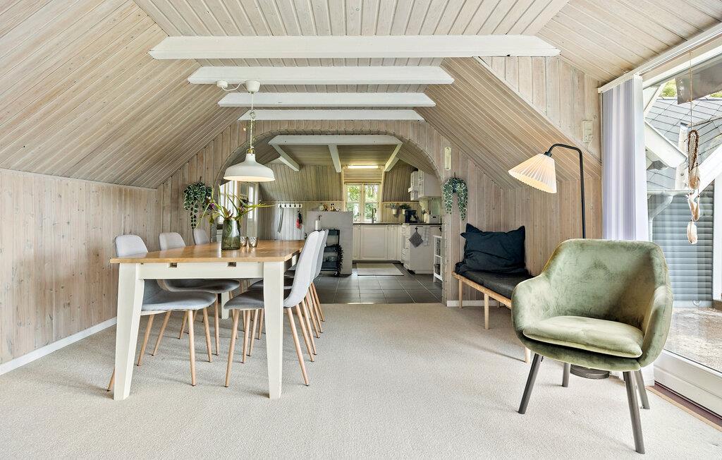 Velkommen til fred, ro og dejlige dage ved Limfjorden. Her ligger dette hyggelige sommerhus, som kan blive rammen om nogle afstressende feriedage. Begynd dagene med morgenmad under parasollen på den rummelige terrasse, hvor I sidder ud til en grøn, velplejet have. I kan også dække op til dagens måltider ved spisebordet indendørs og nyde husets indbydende detaljer. Husets træloft tilfører noget særligt til rummet. Læn jer tilbage i de komfortable sofaer, tænd op i brændeovnen og fyld aftenerne med brætspil, film og gode bøger.