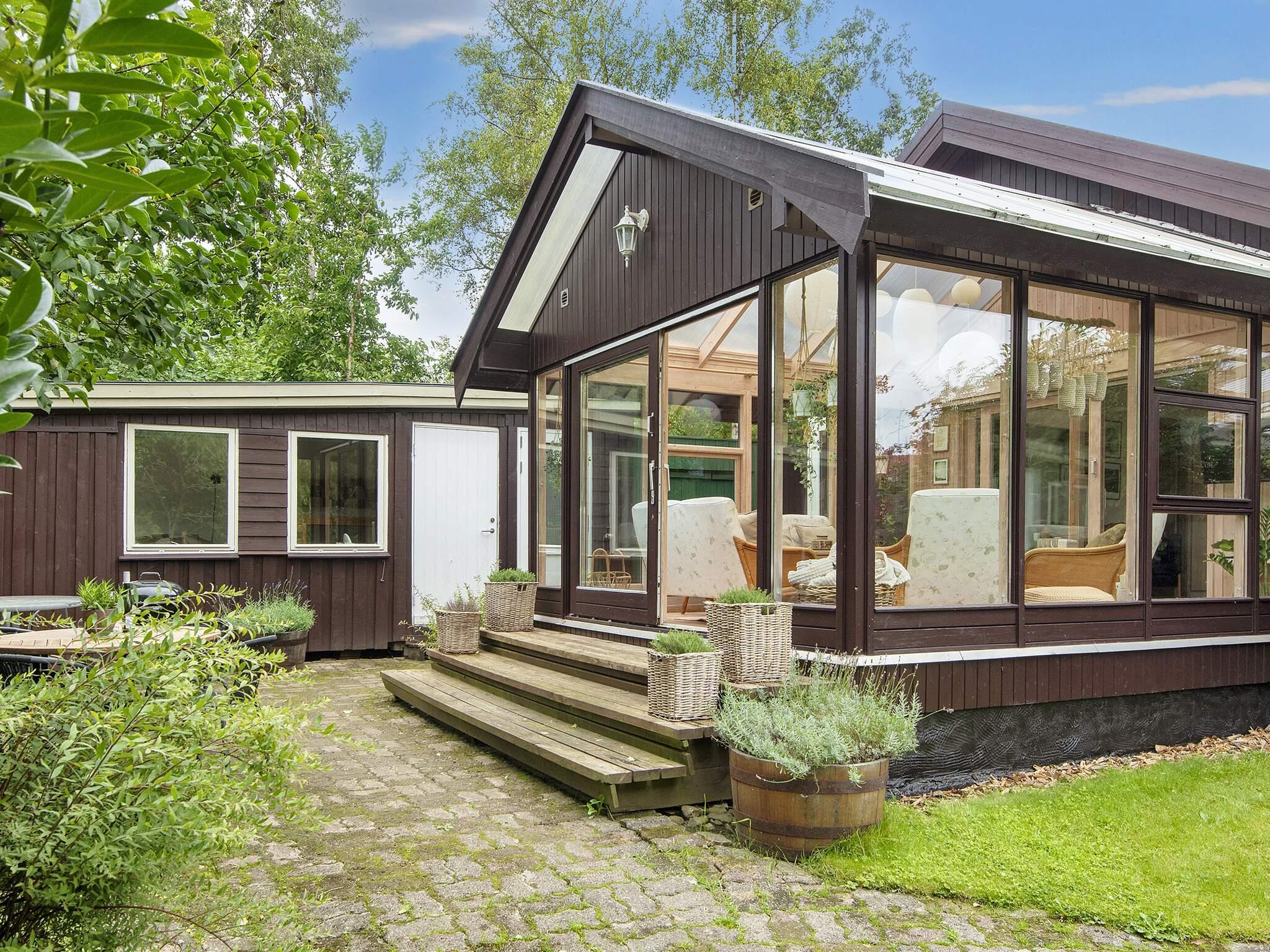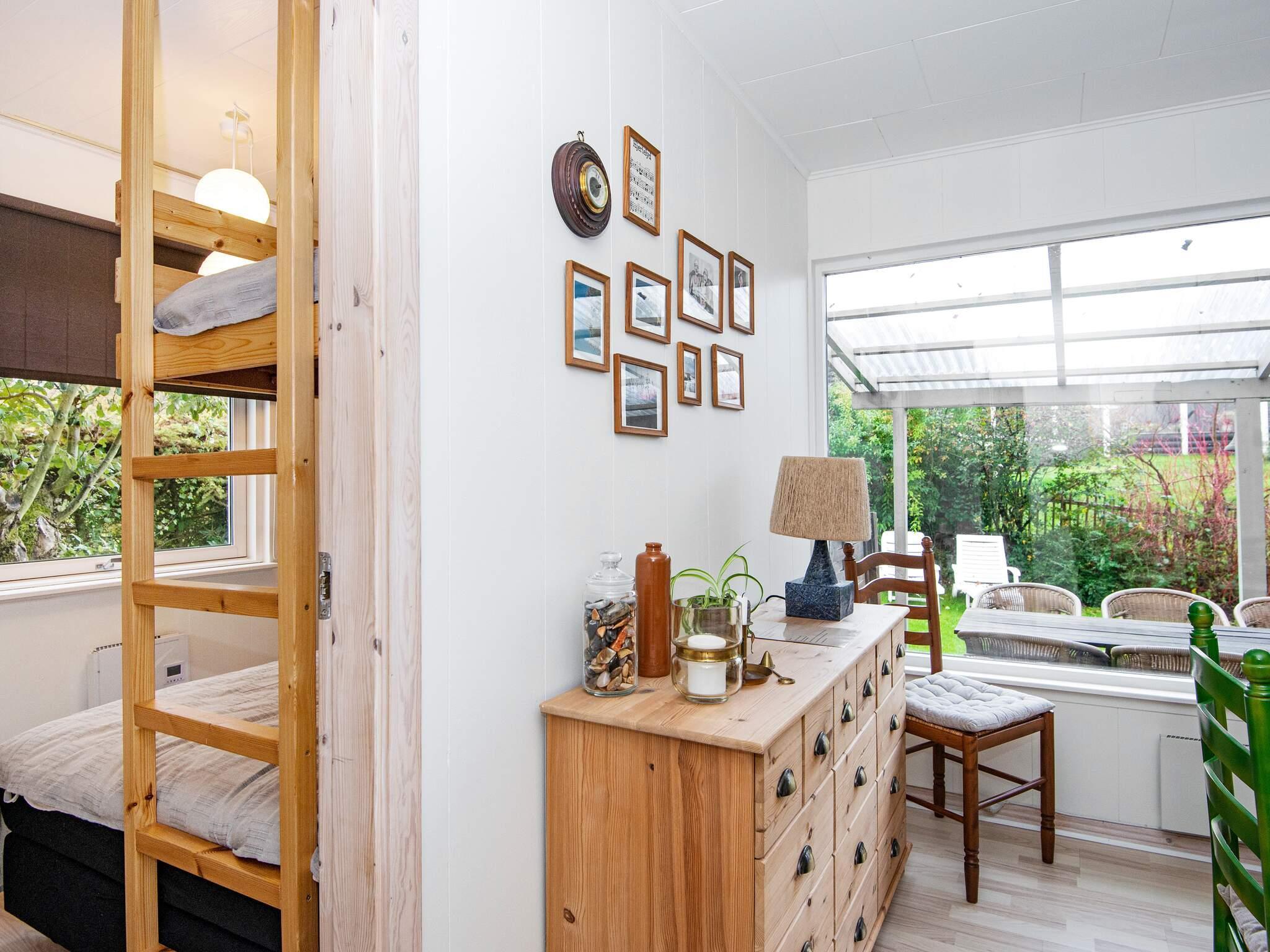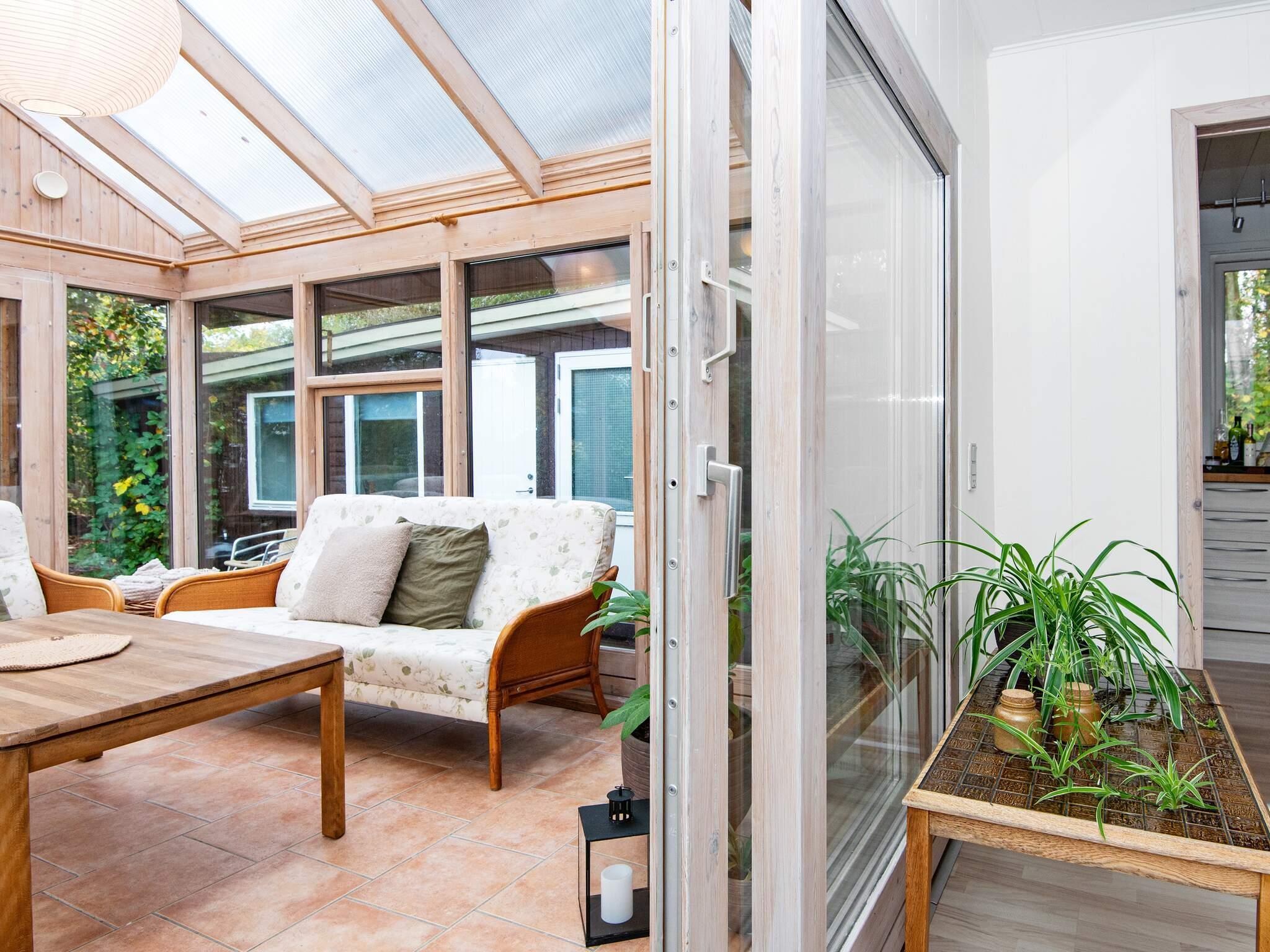 Indvendigt er feriehuset godt indrettet og praktisk indrettet, hvilket skaber en imødekommende atmosfære. Den åbne opholdsstue giver plads til både afslapning og fælles måltider, mens det funktionelle køkken gør det nemt at tilberede familiemiddage eller feriegodbidder. Store vinduespartier slipper naturligt lys ind og forbinder de indendørs rum med det omkringliggende grønne område.