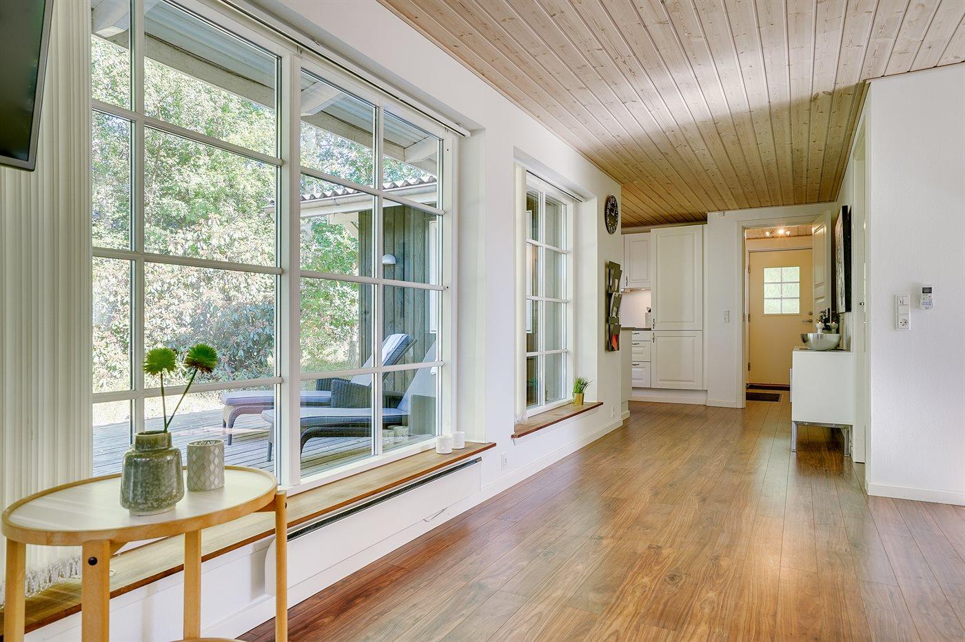 Lyst indrettet sommerhus beliggende tæt på vandet på en lukket og ugenert grund med mange træer og buske.