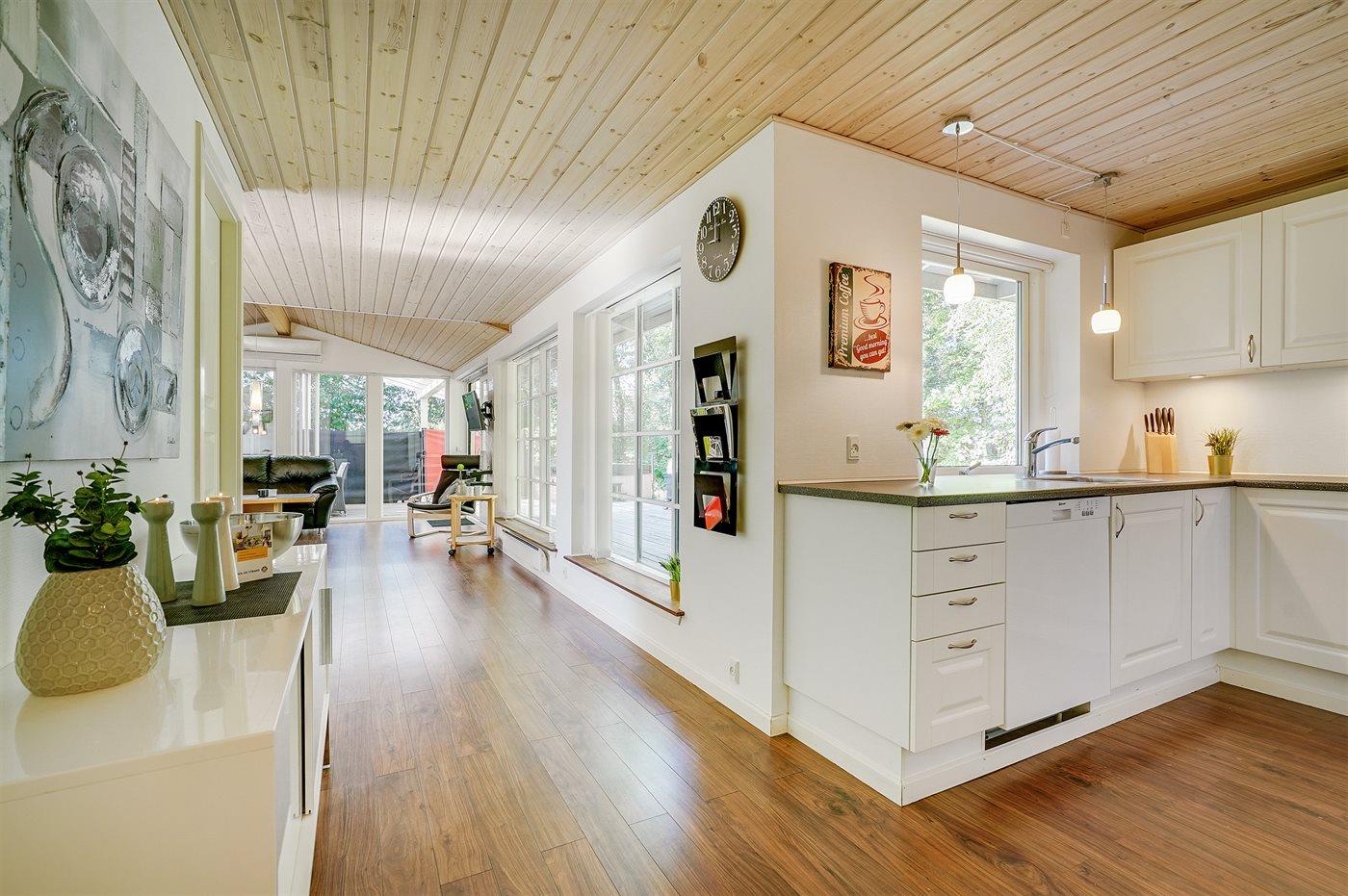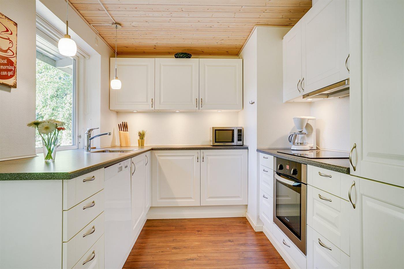 Køkkenet er udstyret med 1 køleskab. Der er 4 induktionskogeplader, varmluftovn, mikrobølgeovn samt opvaskemaskine.