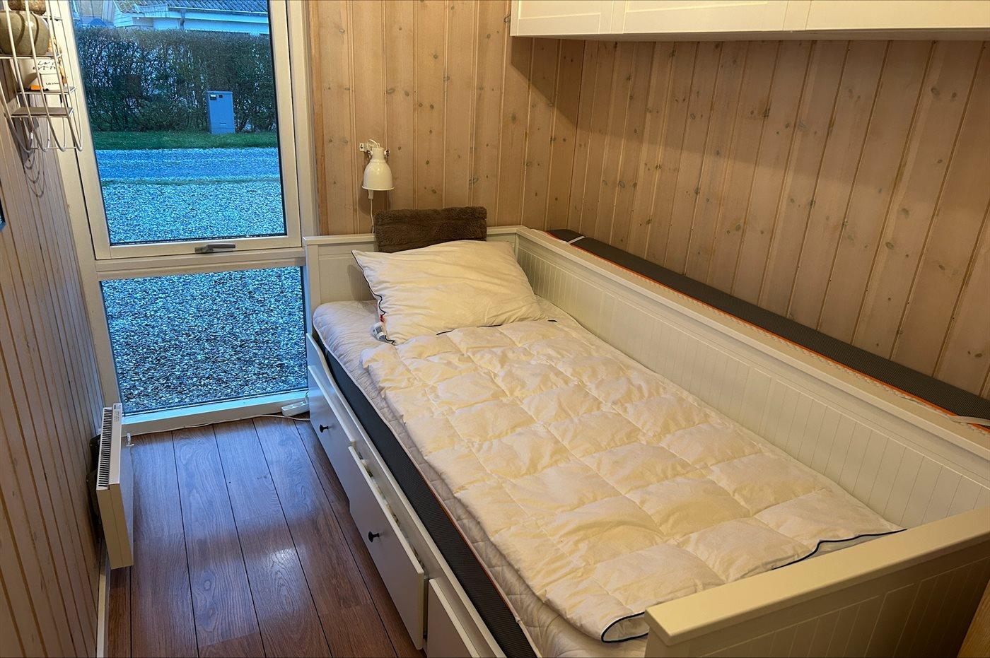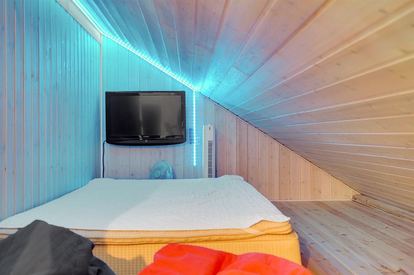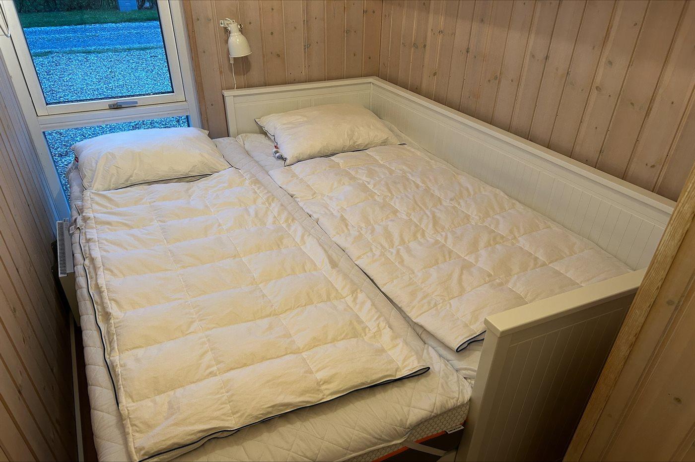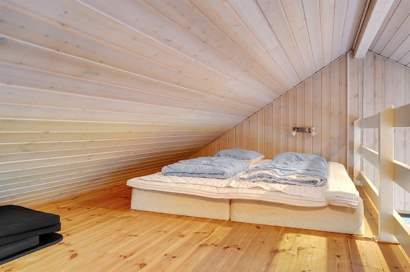 Der er i alt 3 soveværelser. Sovepladserne fordeler sig på: 4 sovepladser i dobbeltsenge. 2 sovepladser i sovesofa (dobbelt). 2 sovepladser på madrasser. 2 af disse sovepladser befinder sig på husets hems. Derudover er der 1 stk. barneseng.