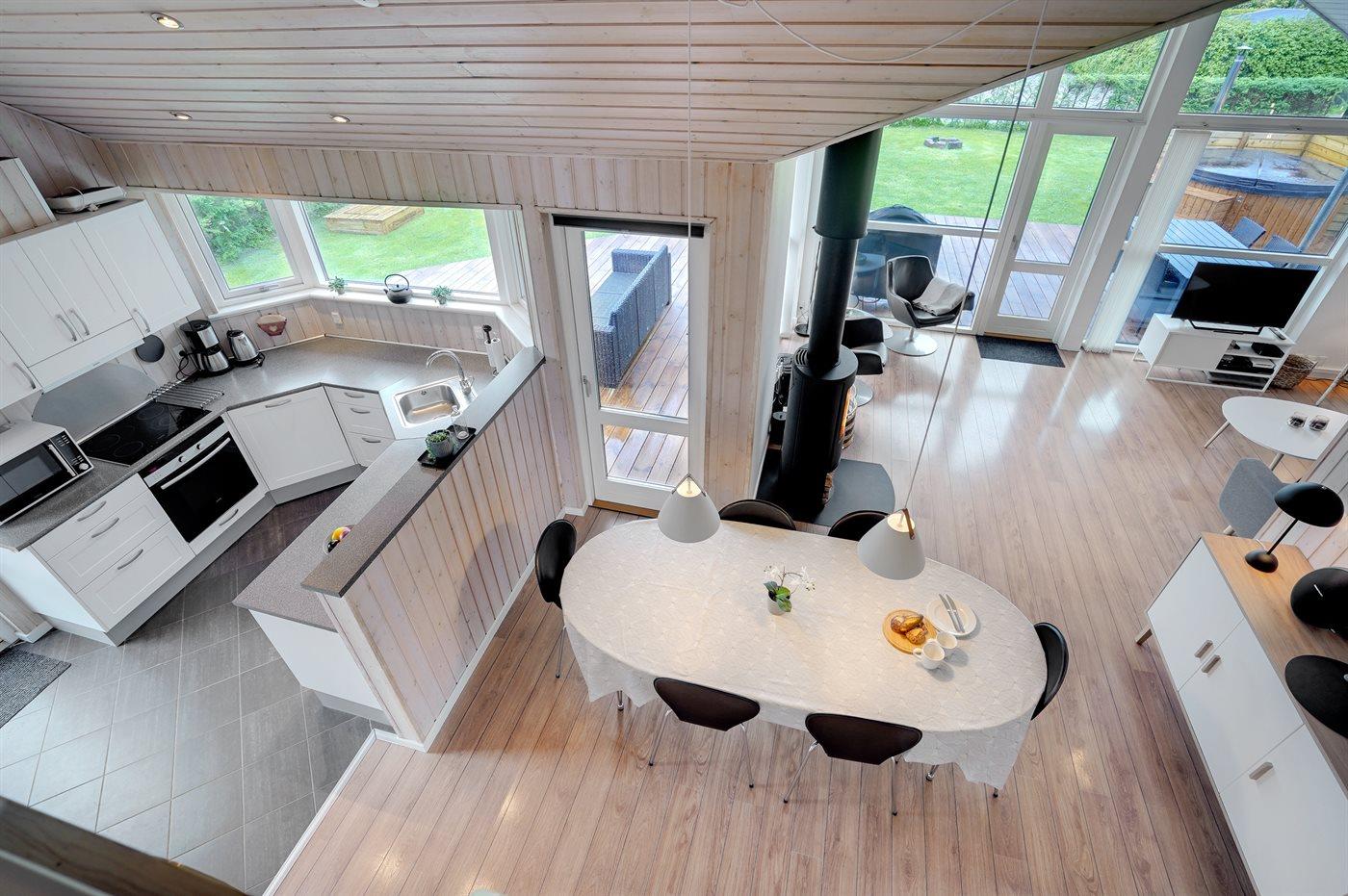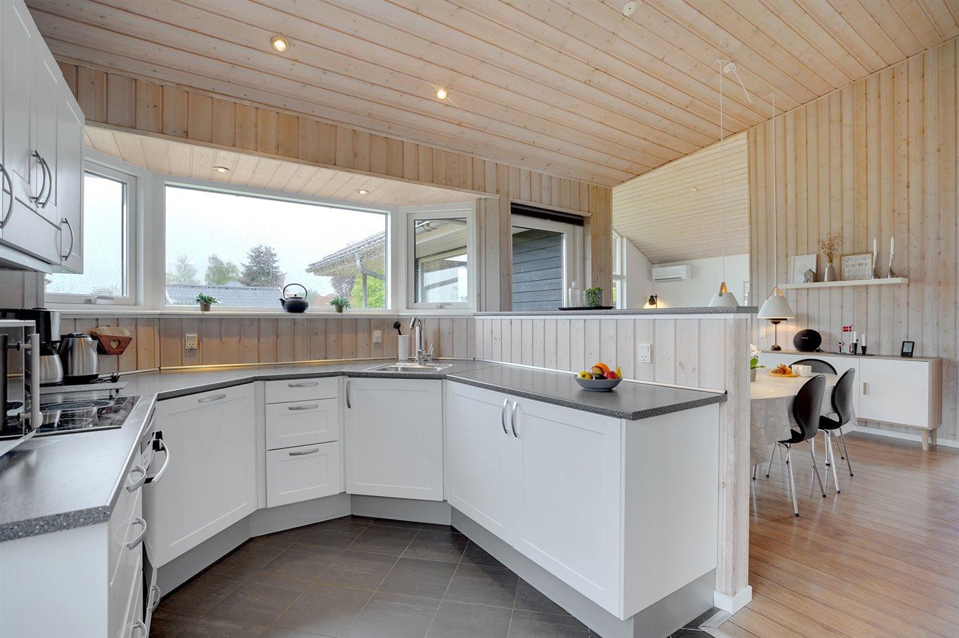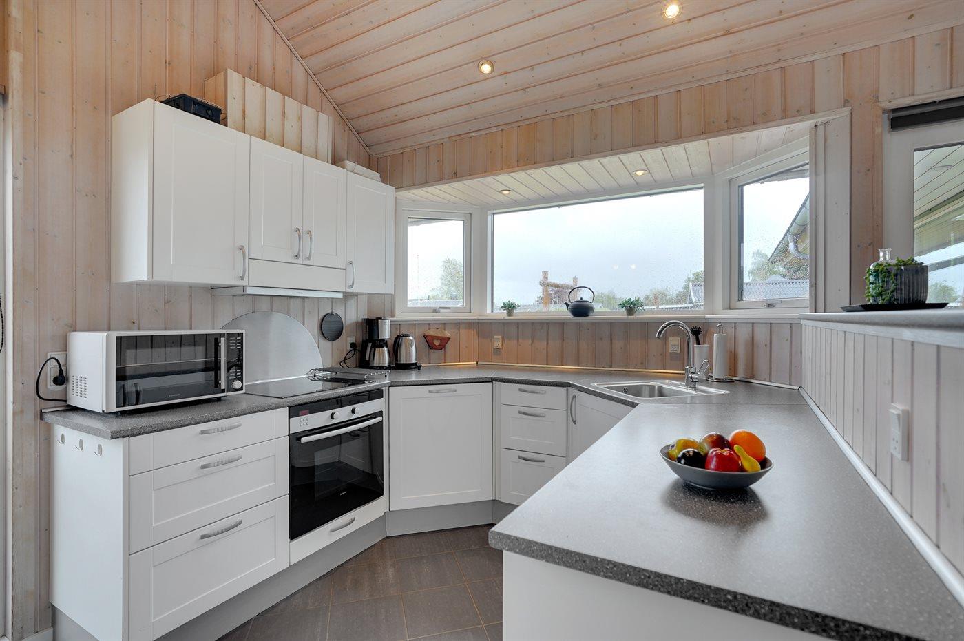 Køkkenet er udstyret med 1 køleskab. Der er 4 keramiske kogeplader, varmluftovn, mikrobølgeovn samt opvaskemaskine.