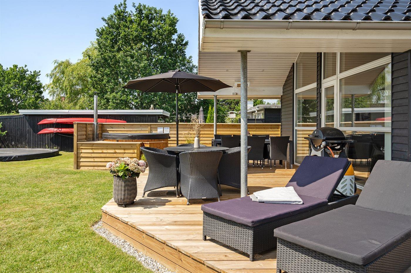 Ferieboligen er beliggende på en 592 m² stor havegrund. Der er 200 m til havet. Der er 200 m til fjorden. Der er en sø i en afstand af 2700 m. Nærmeste forretning er beliggende i en afstand af 3000 m. Der er en golfbane i en afstand af 5800 m. Til ferieboligen hører 100 m² terrasseareal. Desuden er der 20 m² overdækket terrasse. Der er redskabsrum. Gynge. Sandkasse. Trampolin. Fodboldmål. Der ligger en legeplads i en afstand af 1300 m. Bålsted. Udendørs sauna. Koldtvandskar. Grill til rådighed. Der er installeret stik til opladning af elbil. CEE stik. Parkering ved ferieboligen.