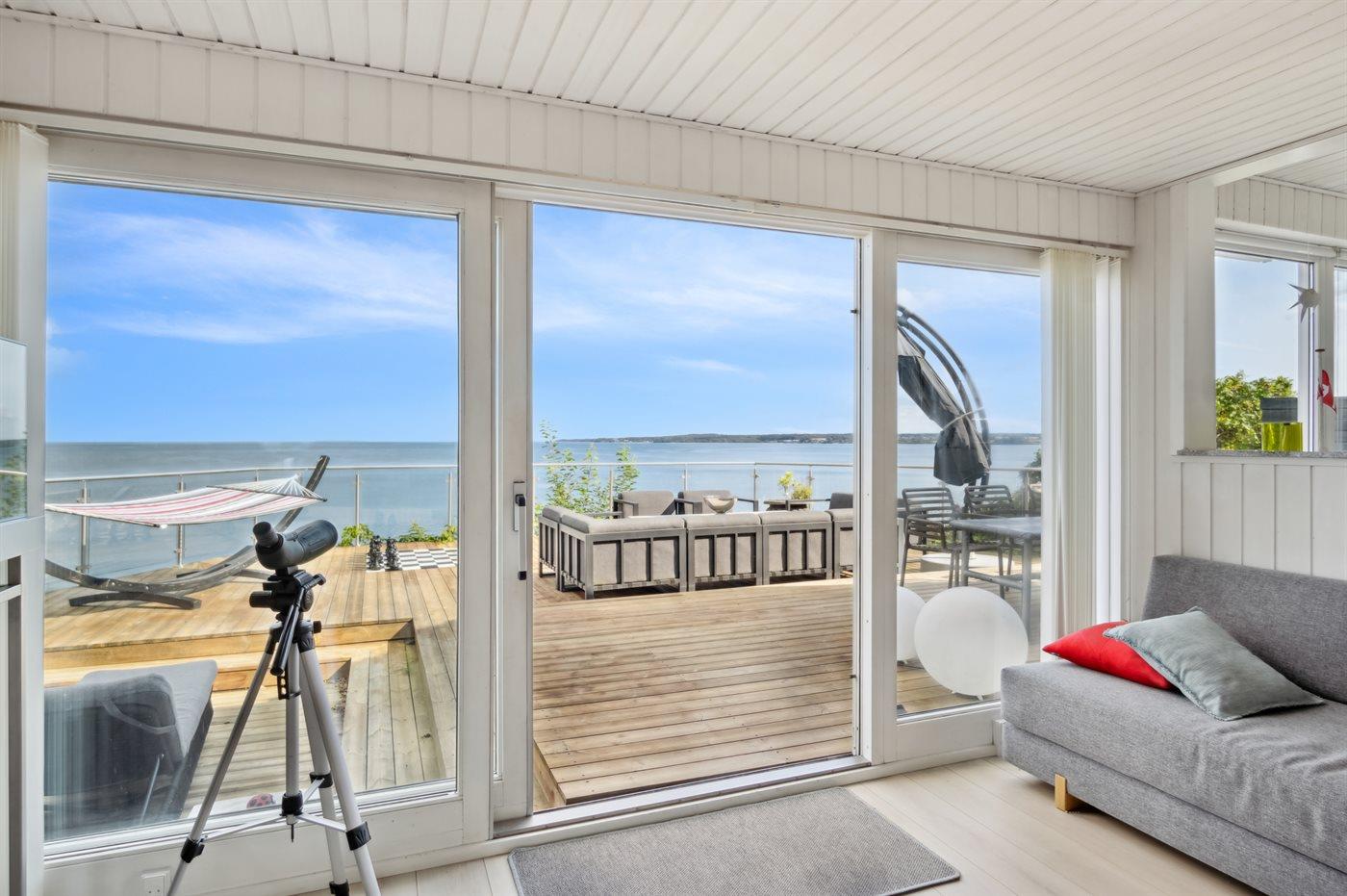 Skønt sommerhus ved vandkanten med panoramaudsigt over fjorden og flere terrasser til afslapning.