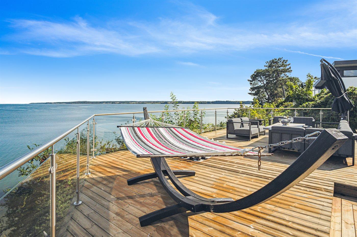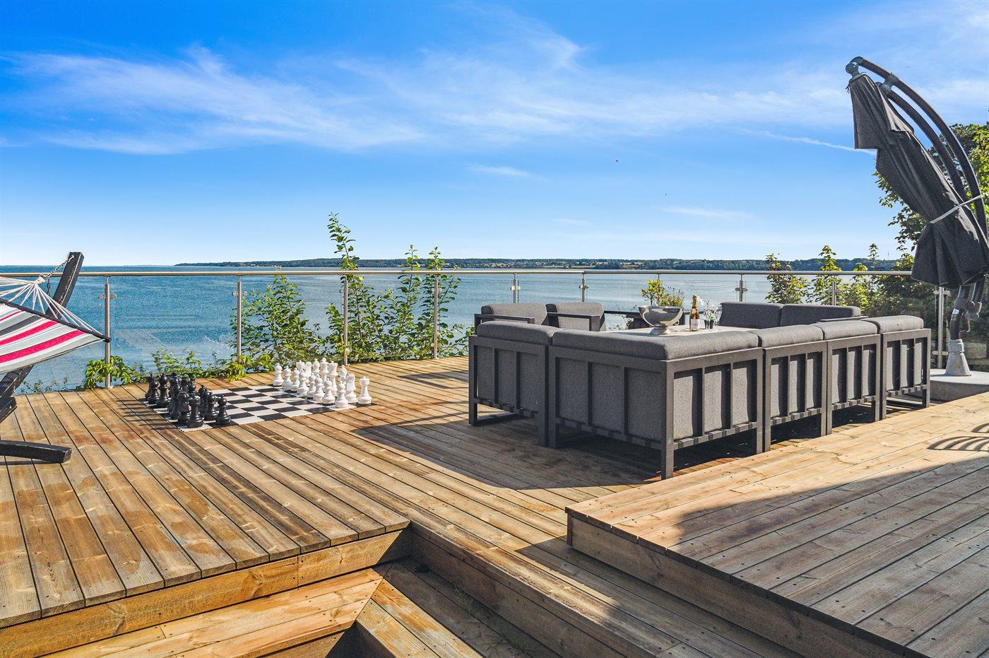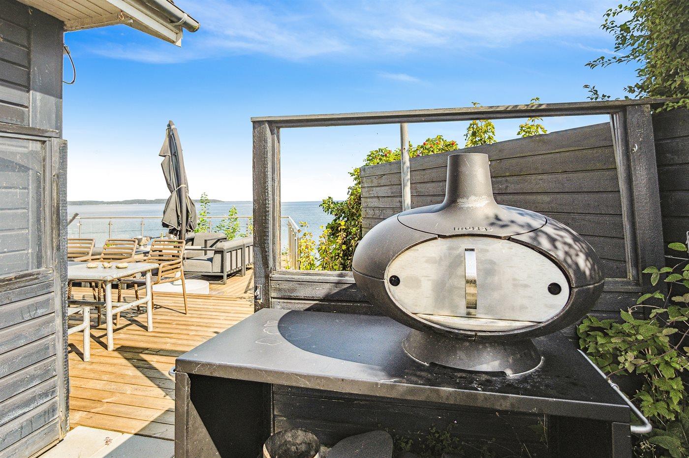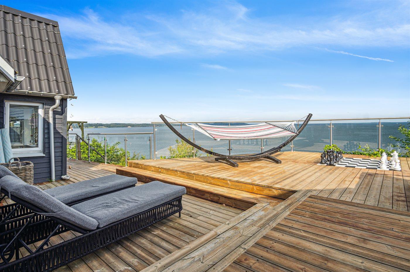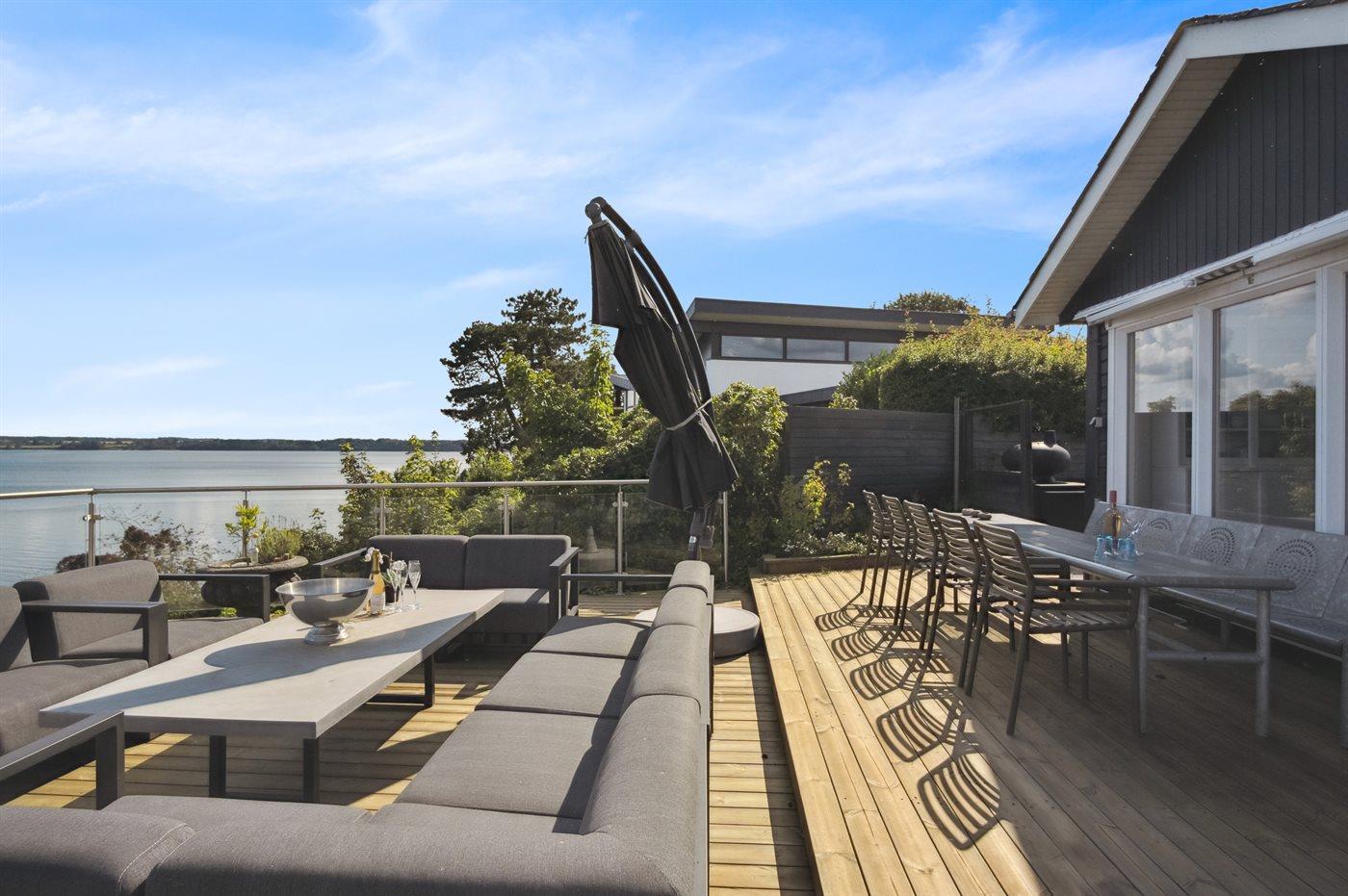 Fra den store terrasse kan der bruges timevis på at nyde disse helt særlige og ugenerte omgivelser. Her findes flere fantastiske terrasser på nærmest alle sider af huset, så der altid er mulighed for at nyde solen og sidde fuldstændig ugeneret. Efter svømmeturen i fjorden kan brusebadet tages under den udendørsbruser, og herefter kan den udendørs sauna nydes - stadig med den skønne udsigt over fjorden.