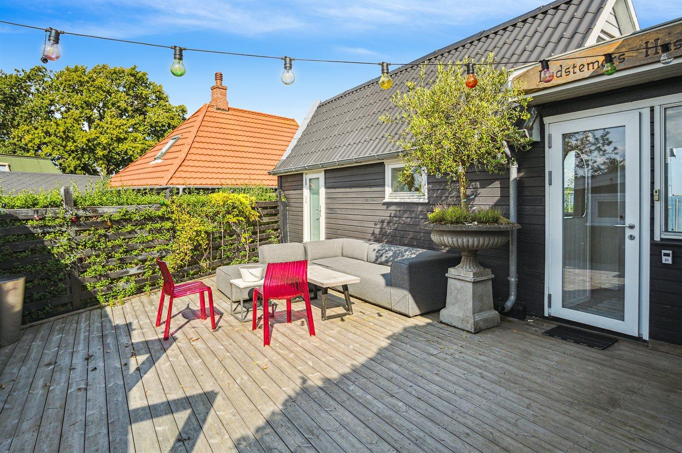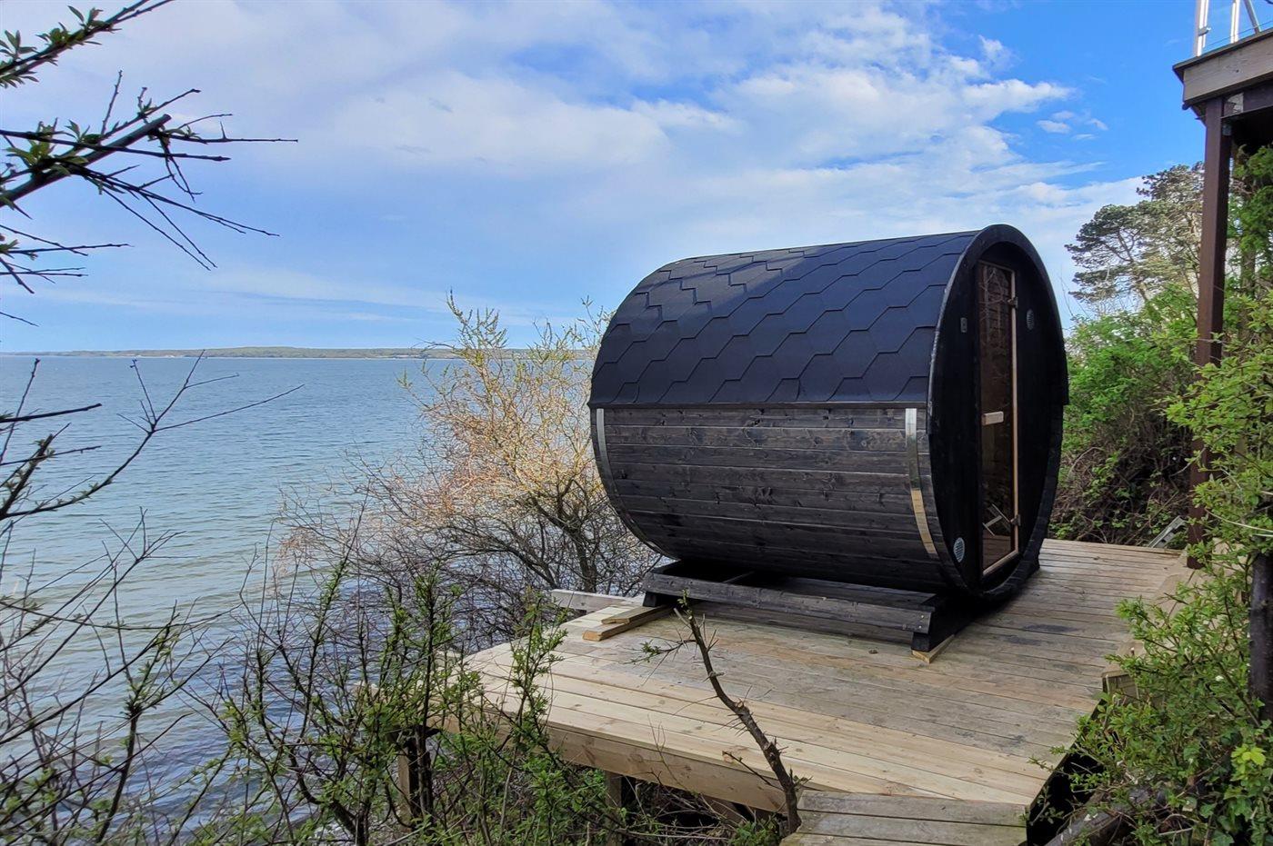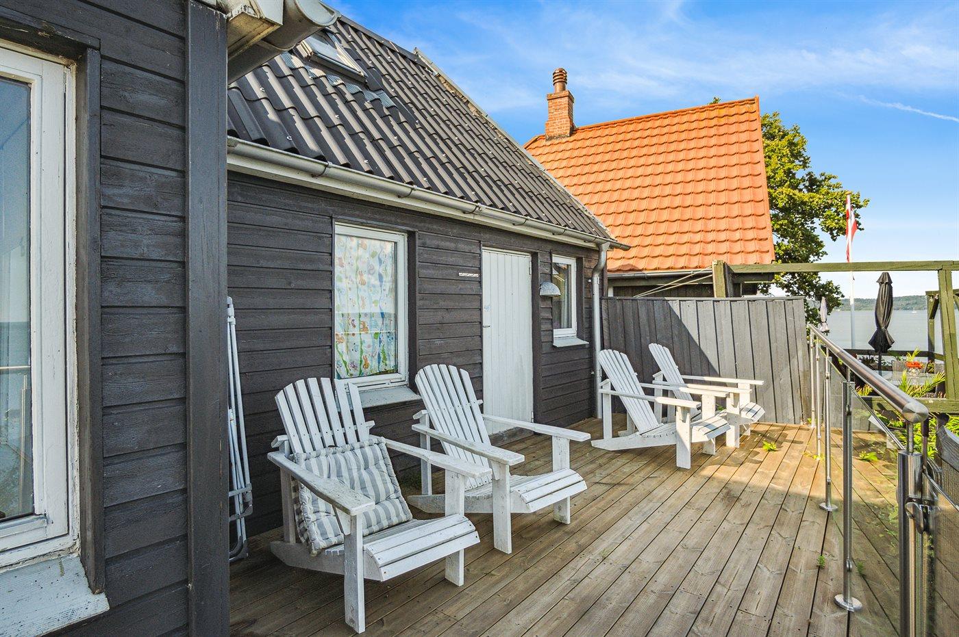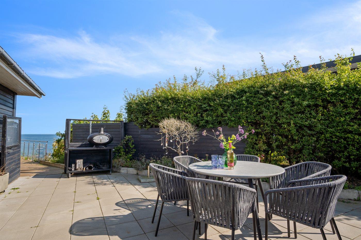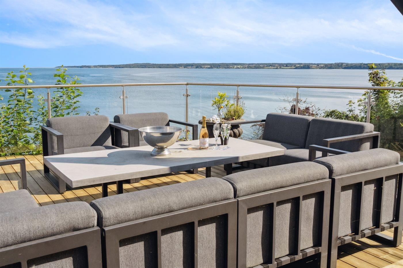 Fra den store terrasse kan der bruges timevis på at nyde disse helt særlige og ugenerte omgivelser. Her findes flere fantastiske terrasser på nærmest alle sider af huset, så der altid er mulighed for at nyde solen og sidde fuldstændig ugeneret. Efter svømmeturen i fjorden kan brusebadet tages under den udendørsbruser, og herefter kan den udendørs sauna nydes - stadig med den skønne udsigt over fjorden.