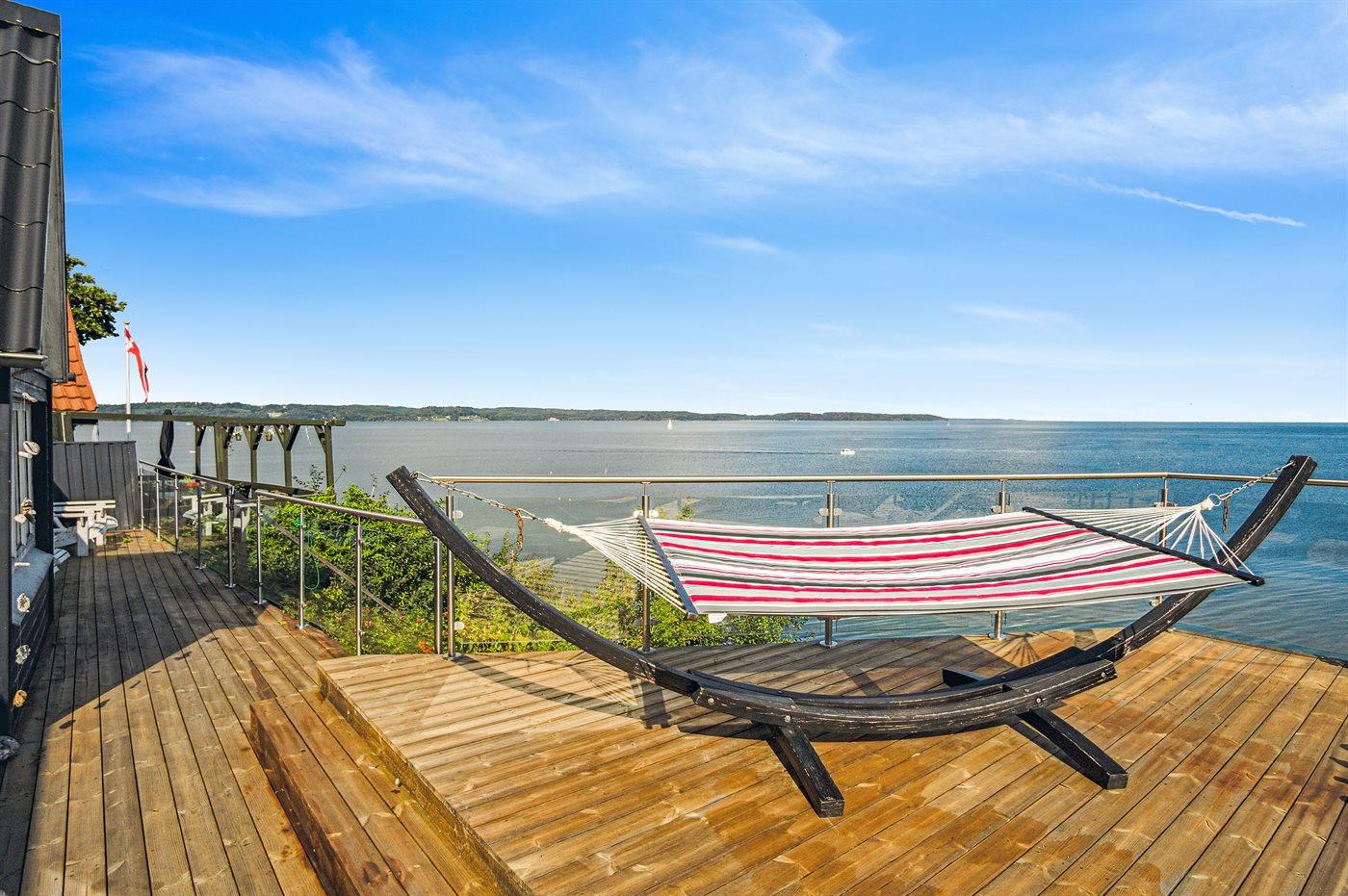 Dette skønne og meget velholdte sommerhus har en beliggenhed, som er svær at beskrive med ord og svær at finde bedre. Sommerhuset ligger helt ude i vandkanten højt hævet over fjorden, hvilket giver en enestående og bjergtagende udsigt i hvilken retning, blikket end vandrer. Husets beliggenhed er med andre ord en særdeles unik kombination af panoramaudsigt over fjorden og det smukke landskab. Man kan sidde på den fantastiske terrasse i de dejlige havemøbler med et glas vin eller en kop kaffe og med få skridt nå fjorden, som har en fin sandbund.